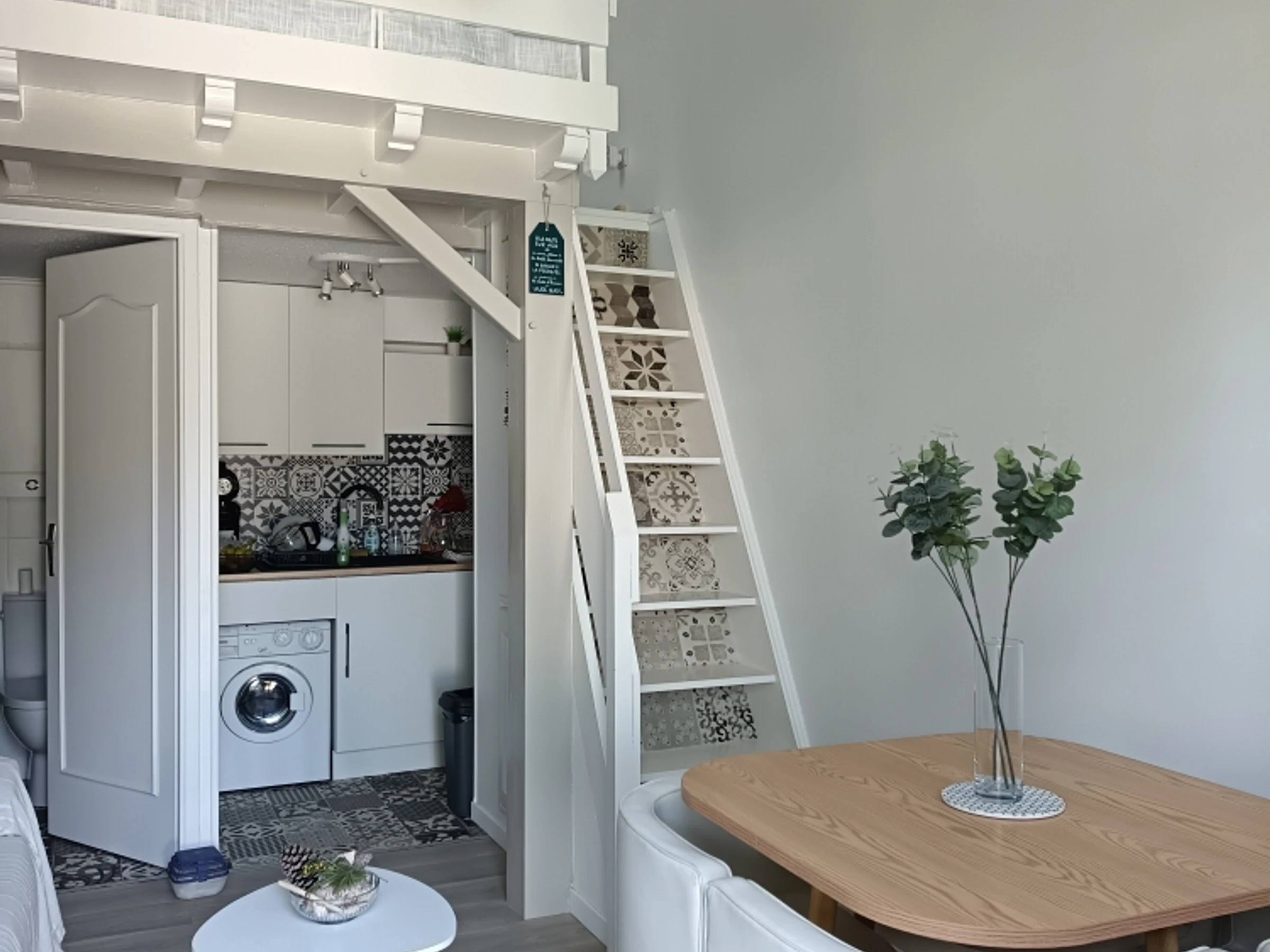 Living room with TELEVISION and convertible bed for 2 people - Kitchenette equipped with a ceramic hob, a fridge / freezer, MICROWAVE, mini electric oven and WASHING MACHINE. A bathroom: shower, sink on furniture and WC. Upstairs: A mezzanine with a double bed (steep access) - Private garden in front of the living room with garden furniture and awning - Private parking - Housekeeping at the tenant's expense. Linen not provided, rental possible from our partner, contact us. Heating from October 1st to May 31st extra depending on meter reading. Wifi rental possible with 5G box: €40/week