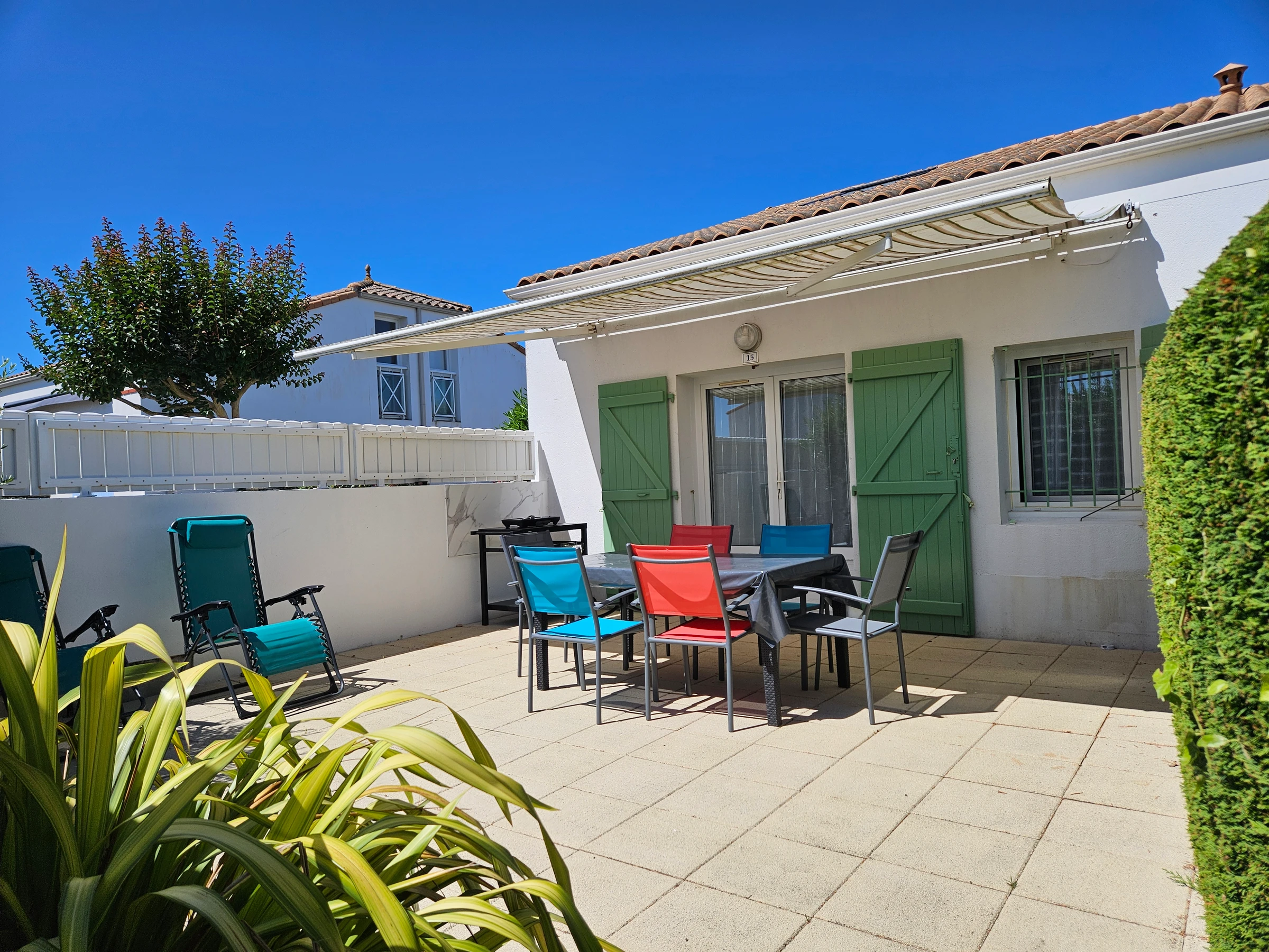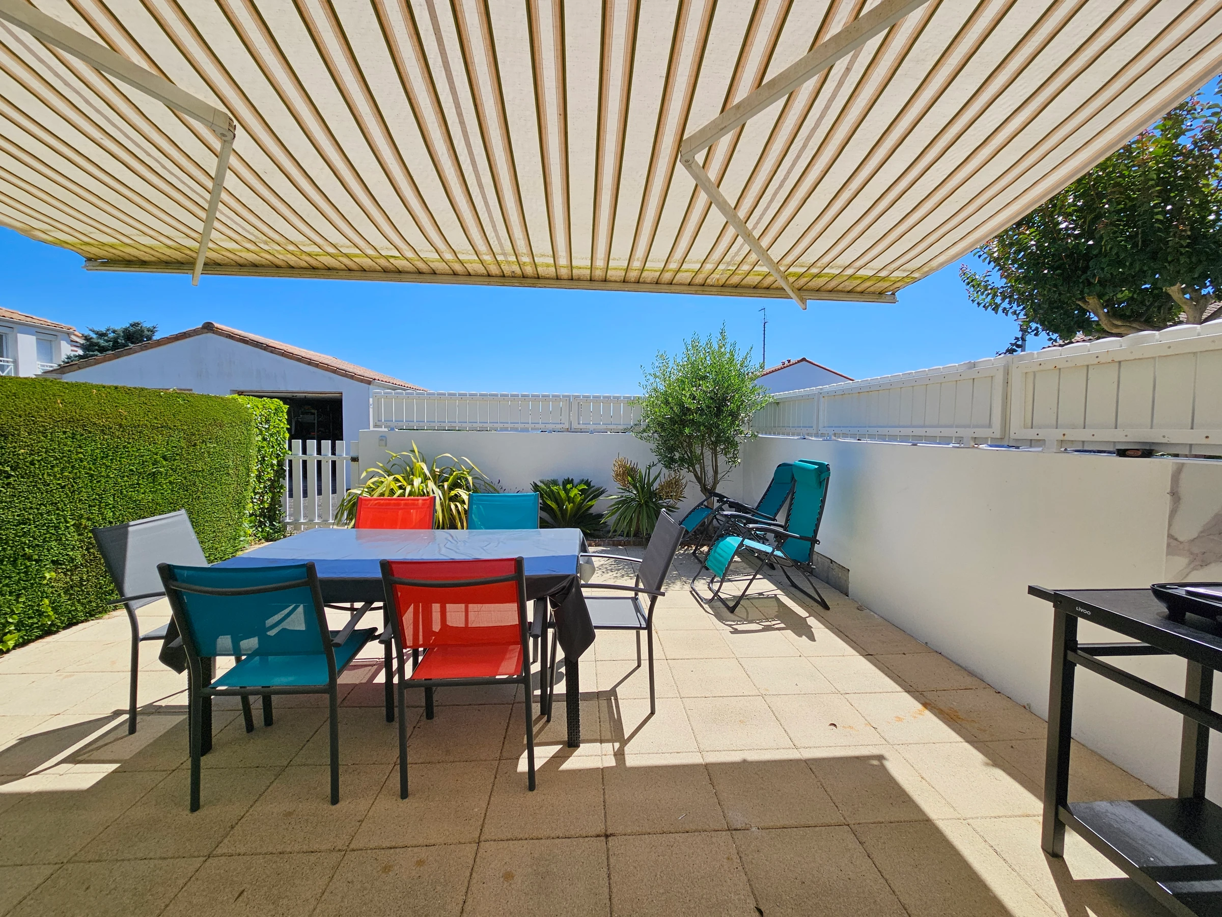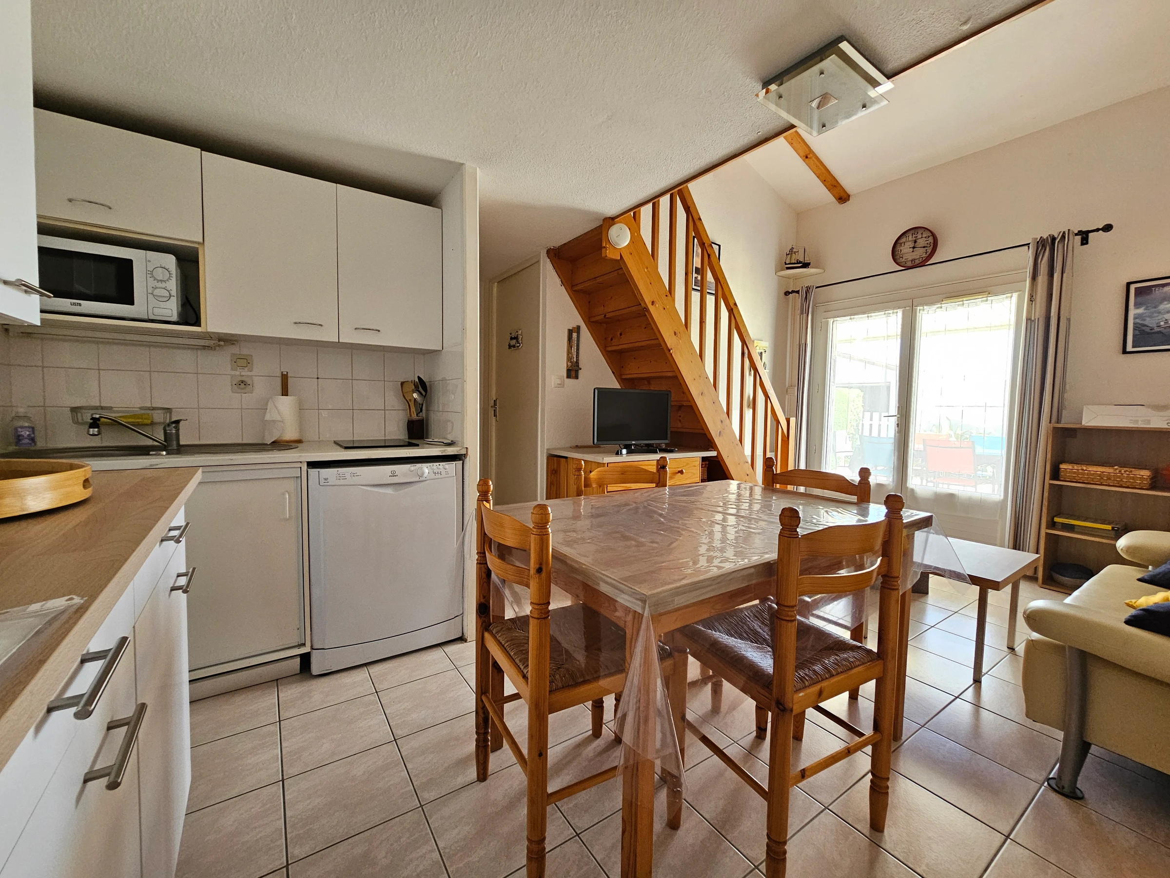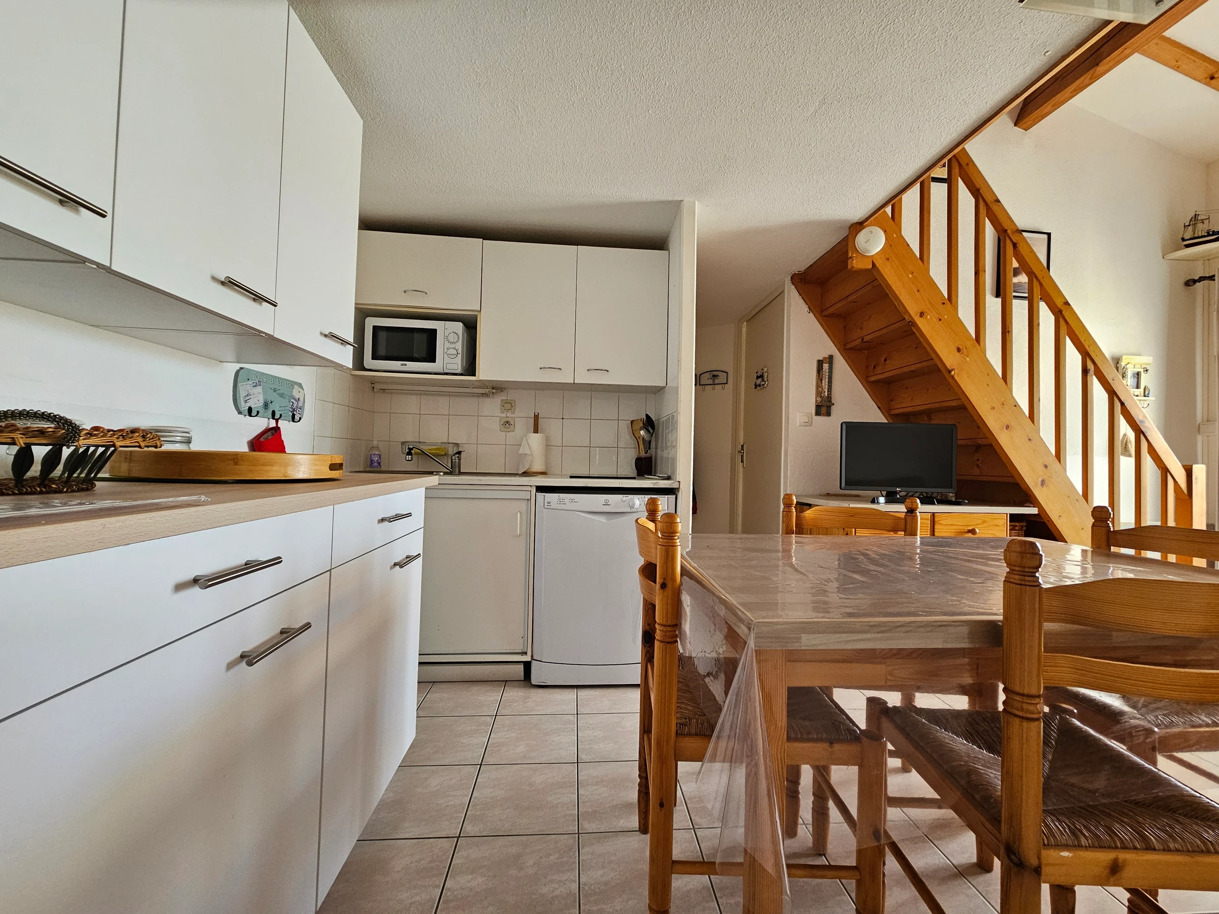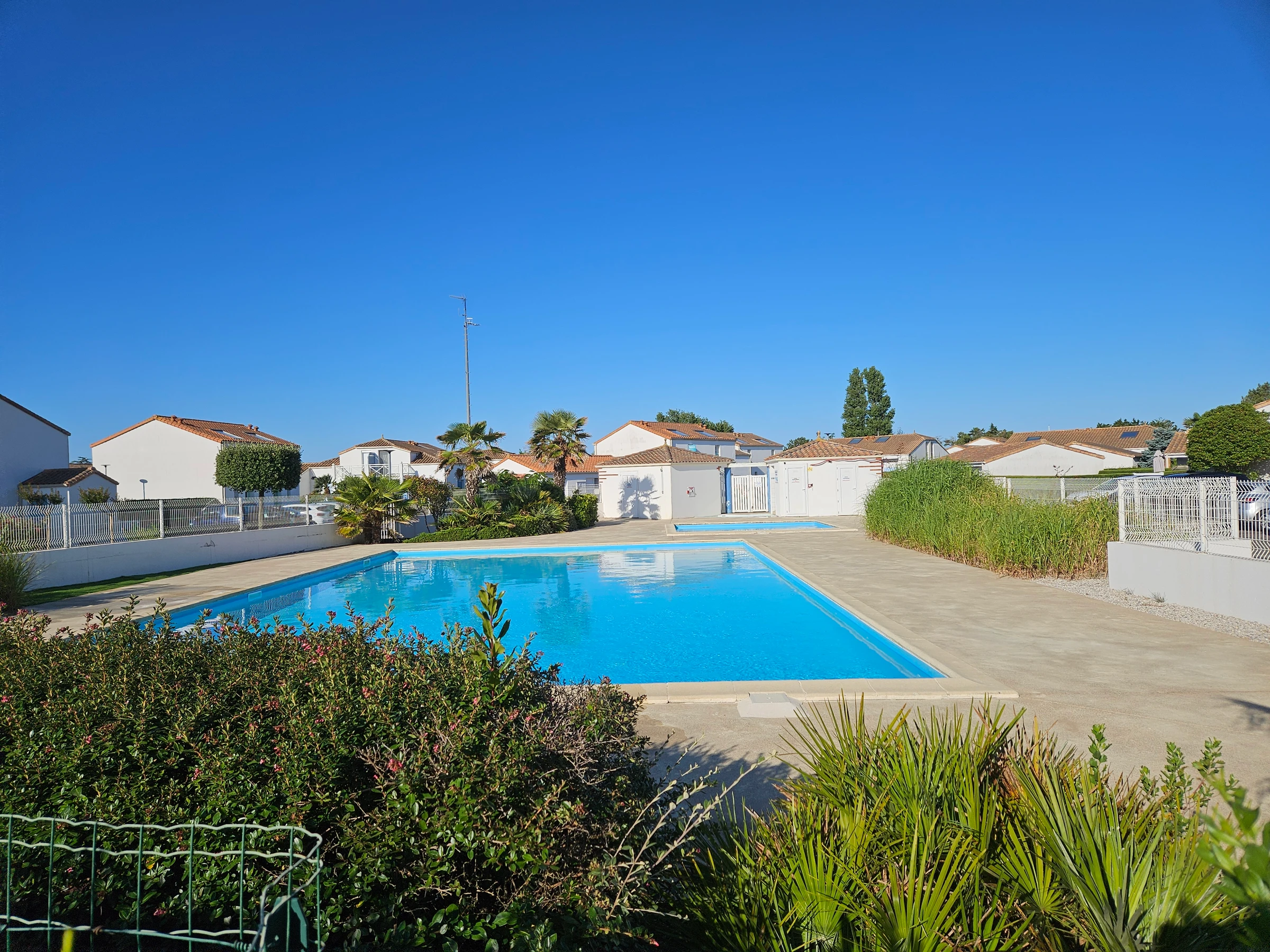 Located in a charming residence with typical Vendée architecture. 1800 m from the sandy beach, 1200 m from shops. Comprising: a living room with TV. Kitchenette equipped with a fridge/freezer, ceramic hob, microwave, mini-oven, and dishwasher. Bathroom with bathtub, vanity sink, and washing machine, separate toilet. Bedroom with 1 double bed (140 cm) - Upstairs: a mezzanine with 1 double bed (160 cm) + an extra bed (for children under 10 years old). Paved courtyard with garden furniture - Private swimming pool at the residence and private parking. Housekeeping is provided by the tenant. Linens not provided; rental is possible through our partner; contact us. Heating from October 1st to May 31st extra depending on meter reading. Wi-Fi rental available with 5G box: €40/week