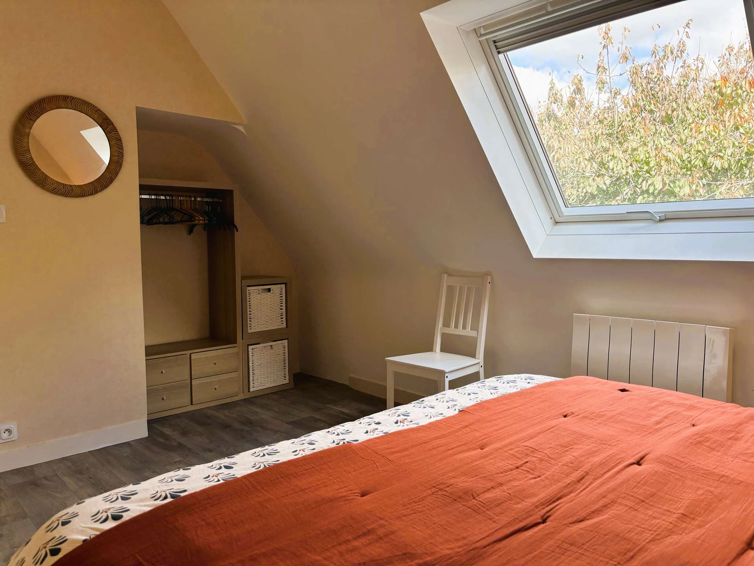 - A bedroom with a double bed and new bedding (160 cm), wardrobes, and a desk