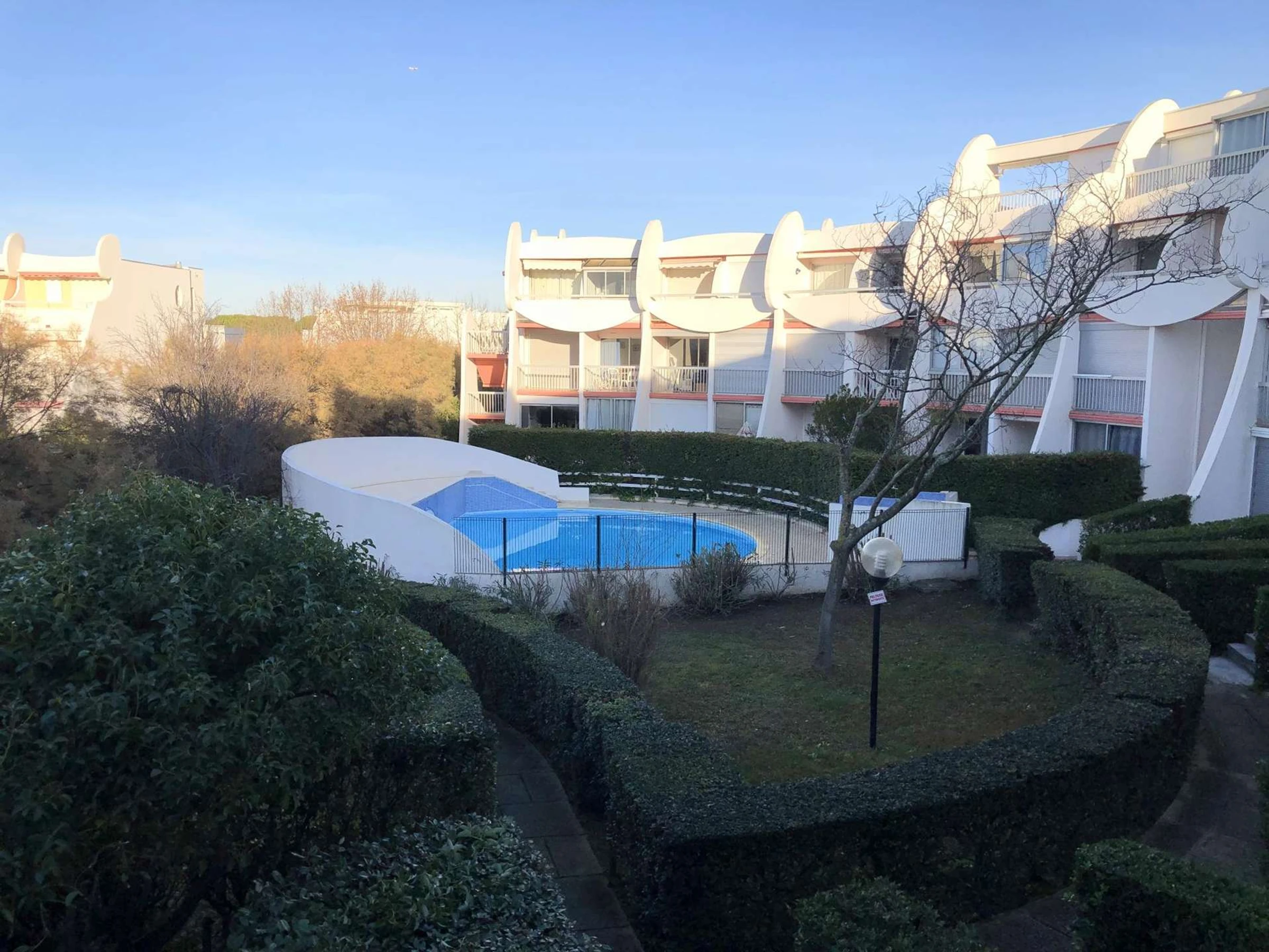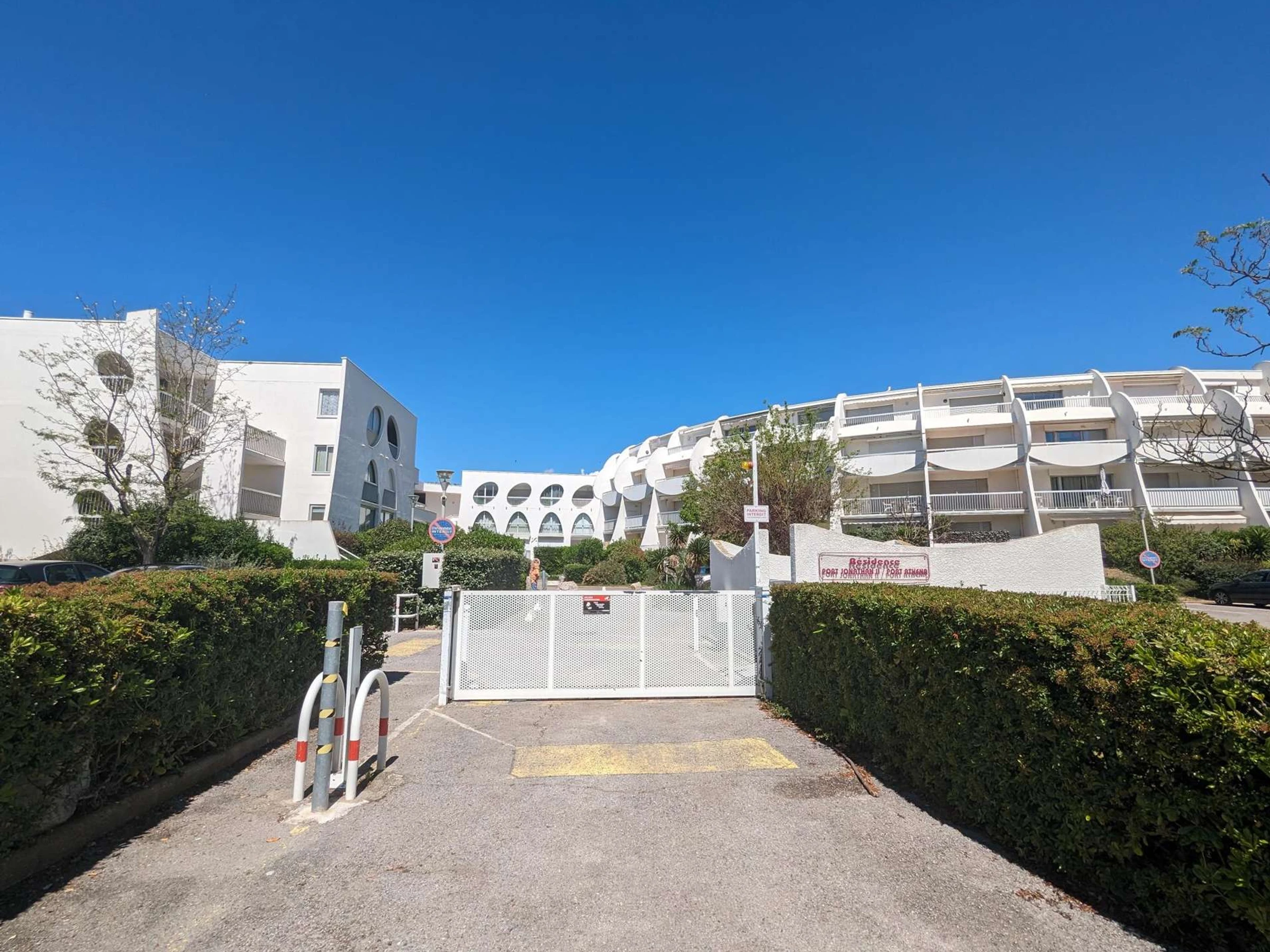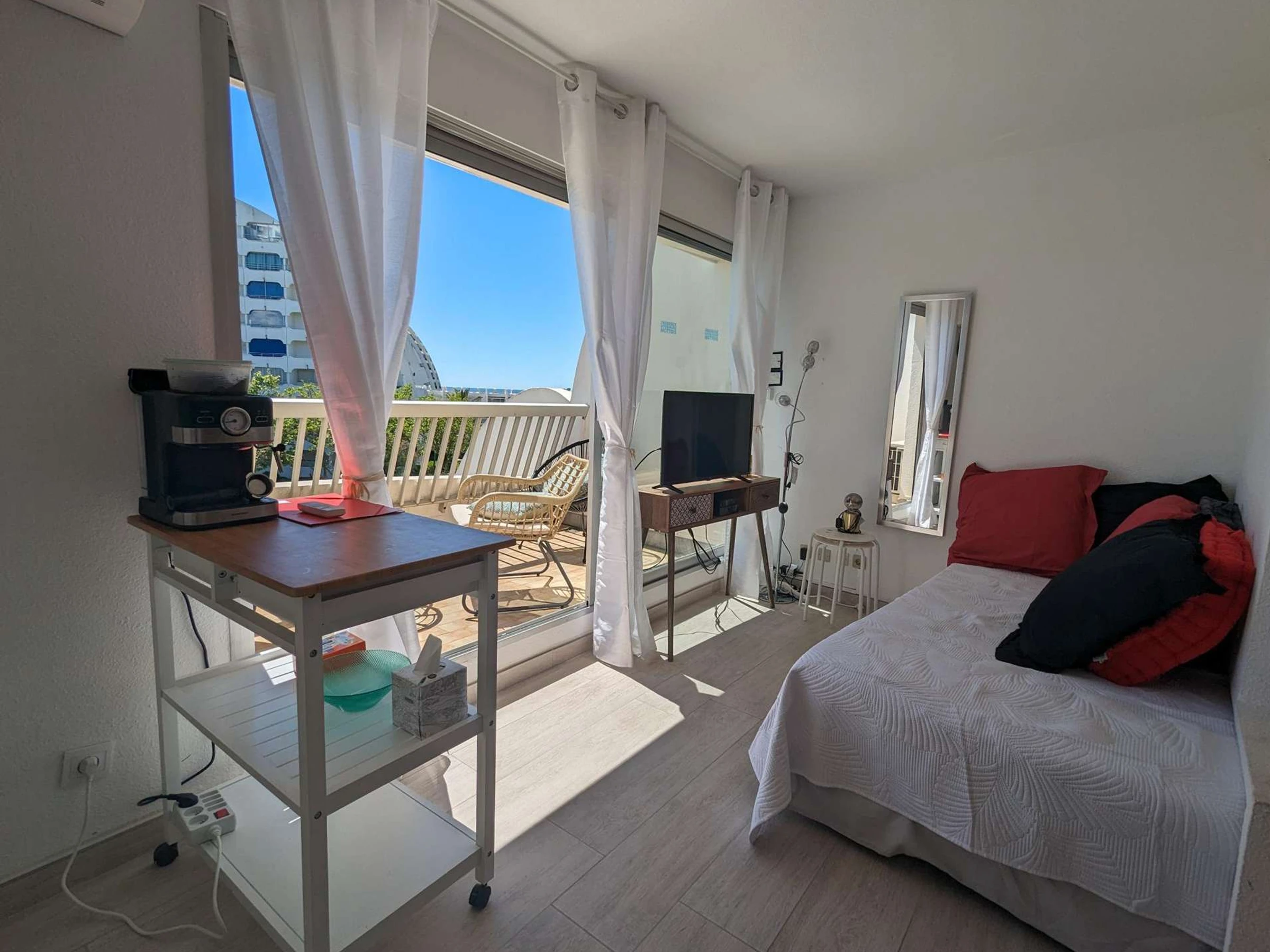 Residence "Port Jonathan II". In the district of La Motte du Couchant, 1.5 km from the center, 200 m from the sea, residence with swimming pool, studio cabin renovated with a clear view and sea view on the top floor with terrace, very bright facing south, air conditioning, comprising 3 beds, main room with sofa bed 140X190, modern bathroom with toilet and washing machine, Entrance with 2 bunk beds, plenty of storage, collective parking - Shops and restaurant right next door - bus stop 200 m