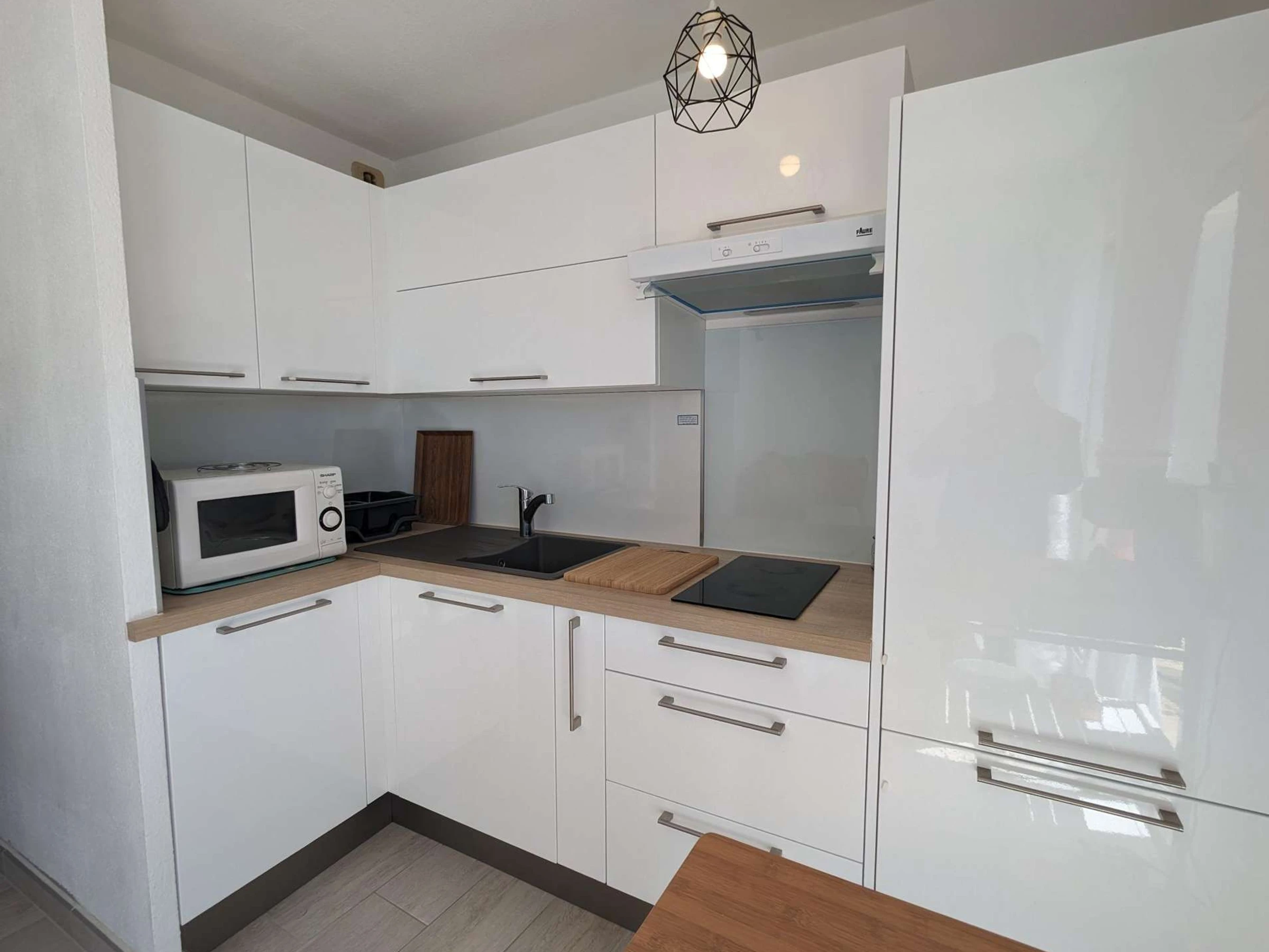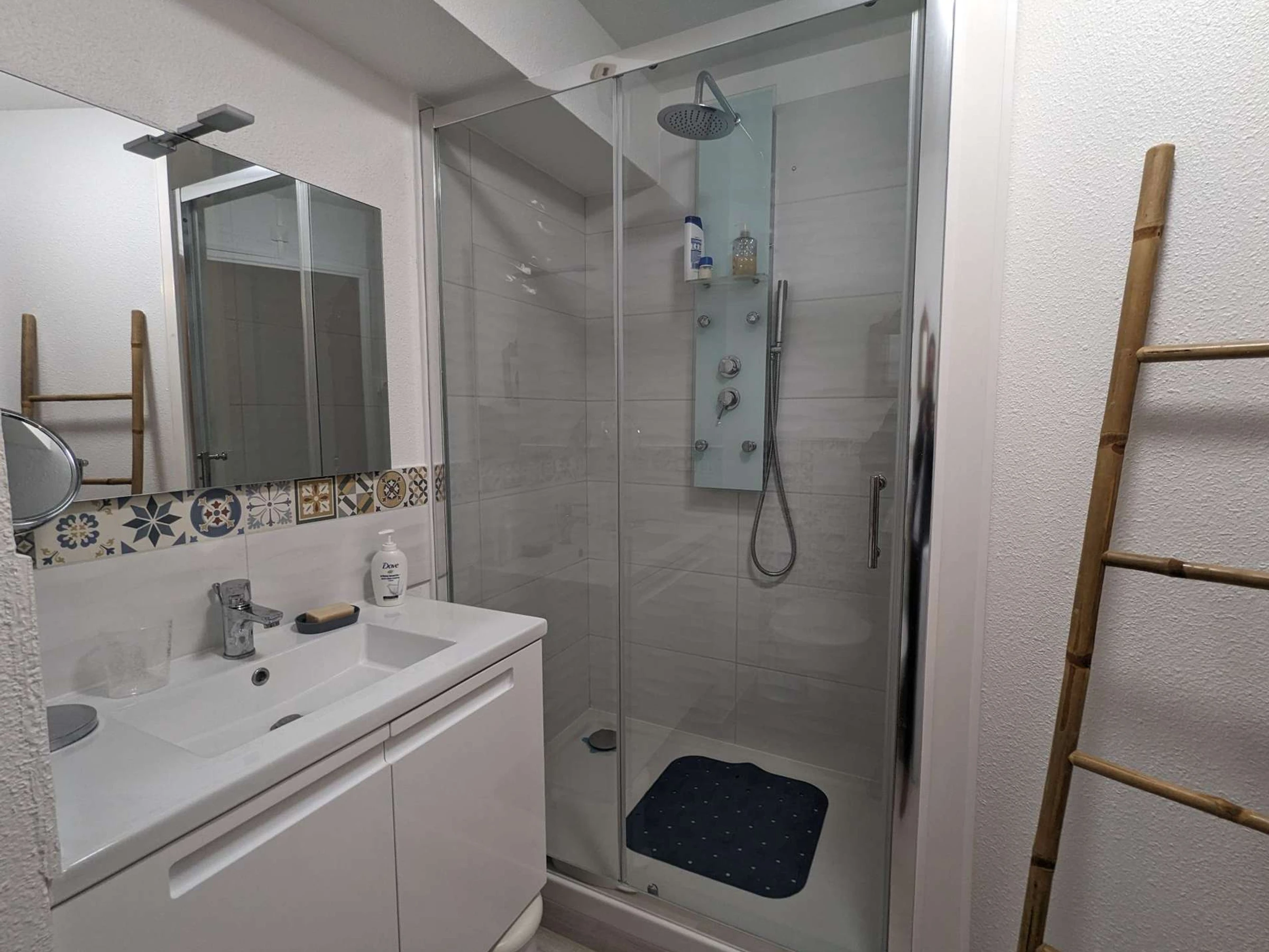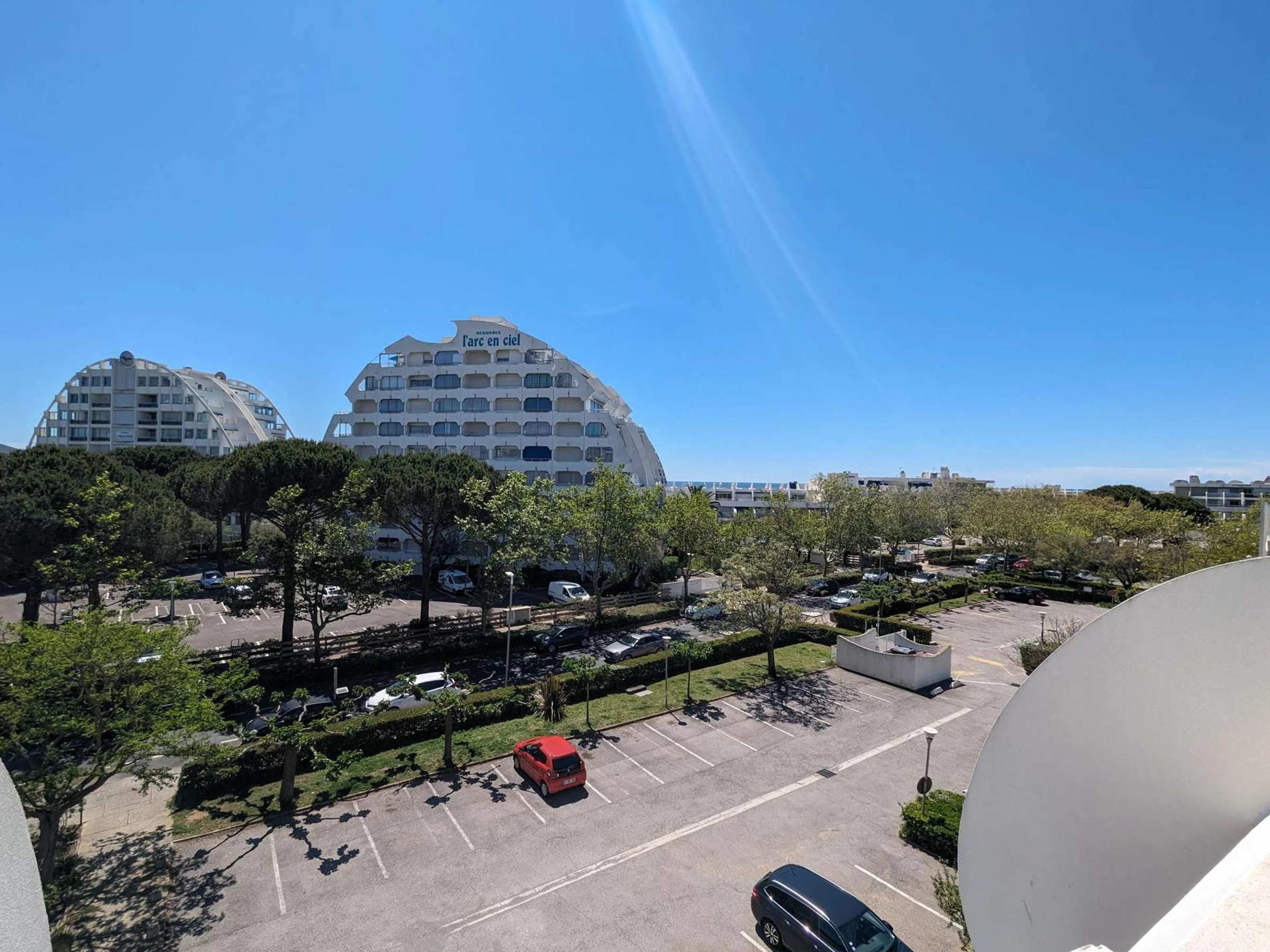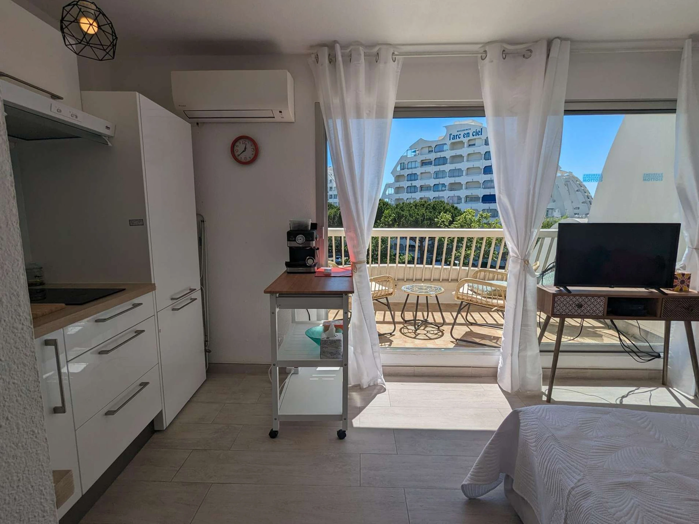 Residence "Port Jonathan II". In the district of La Motte du Couchant, 1.5 km from the center, 200 m from the sea, residence with swimming pool, studio cabin renovated with a clear view and sea view on the top floor with terrace, very bright facing south, air conditioning, comprising 3 beds, main room with sofa bed 140X190, modern bathroom with toilet and washing machine, Entrance with 2 bunk beds, plenty of storage, collective parking - Shops and restaurant right next door - bus stop 200 m