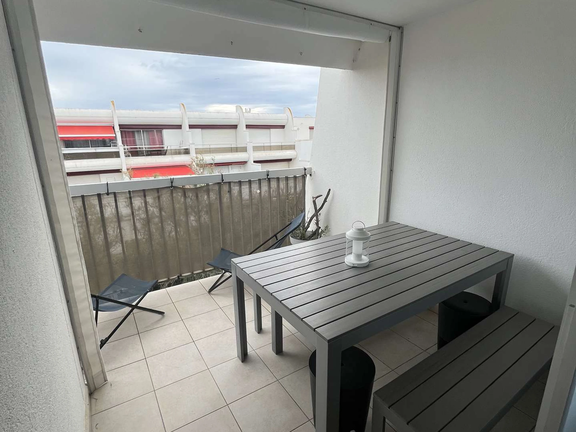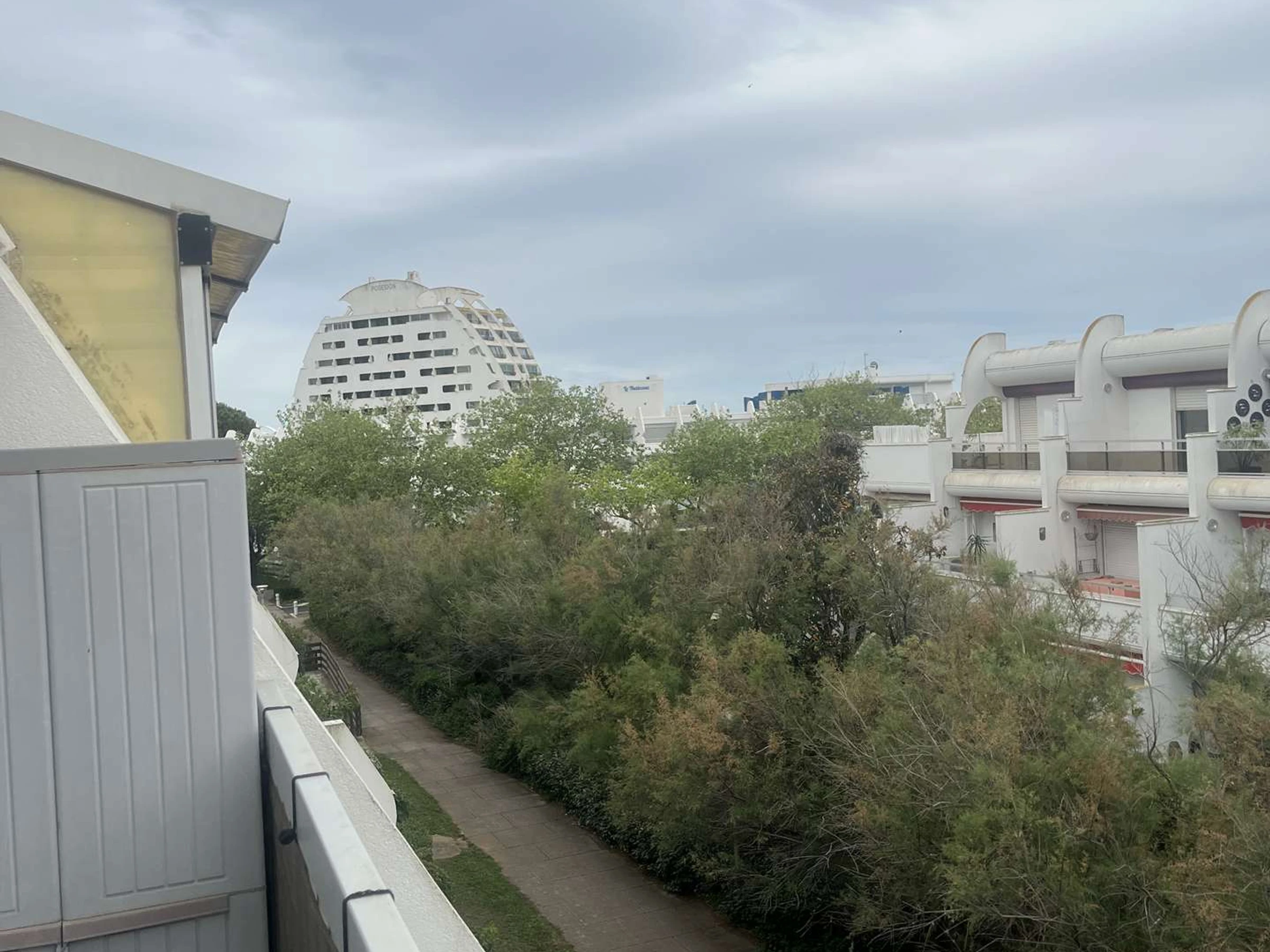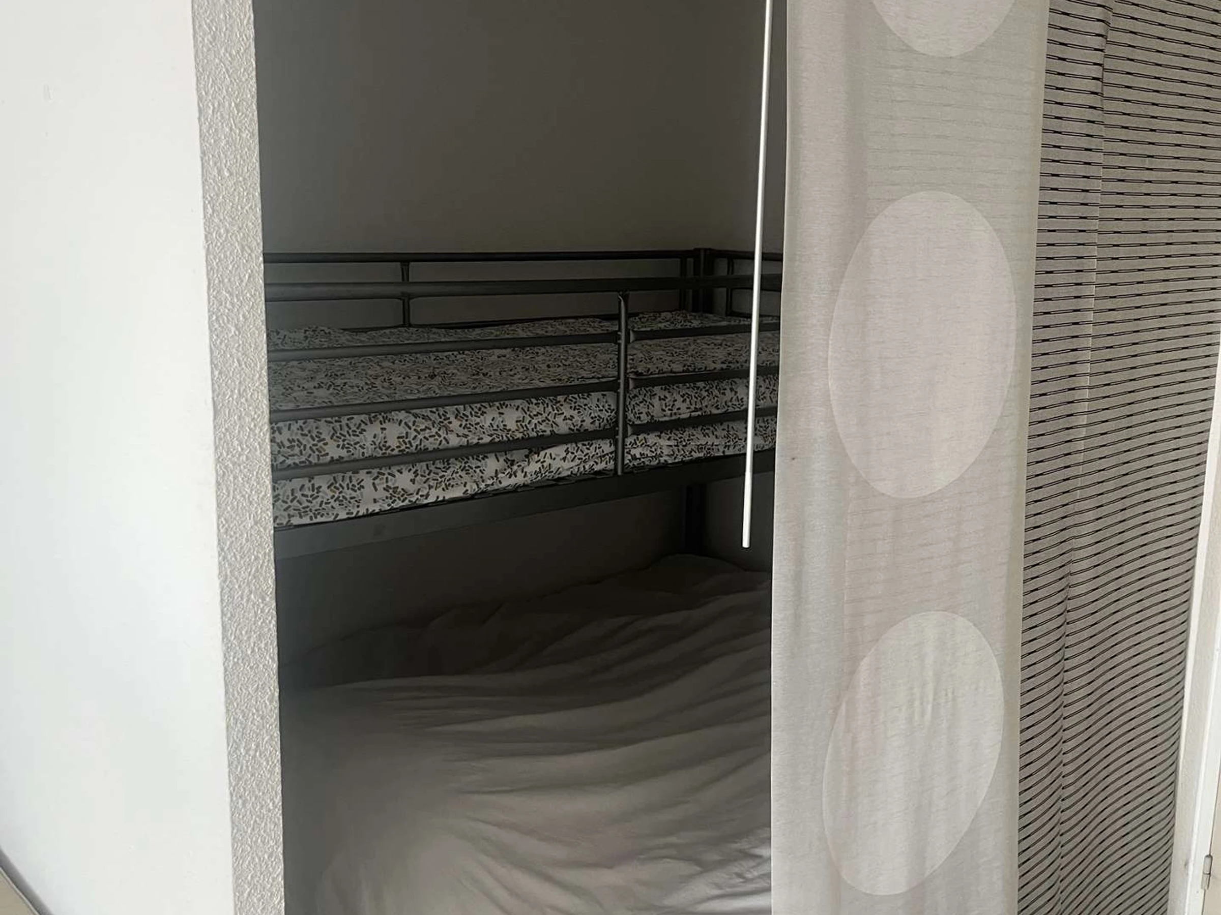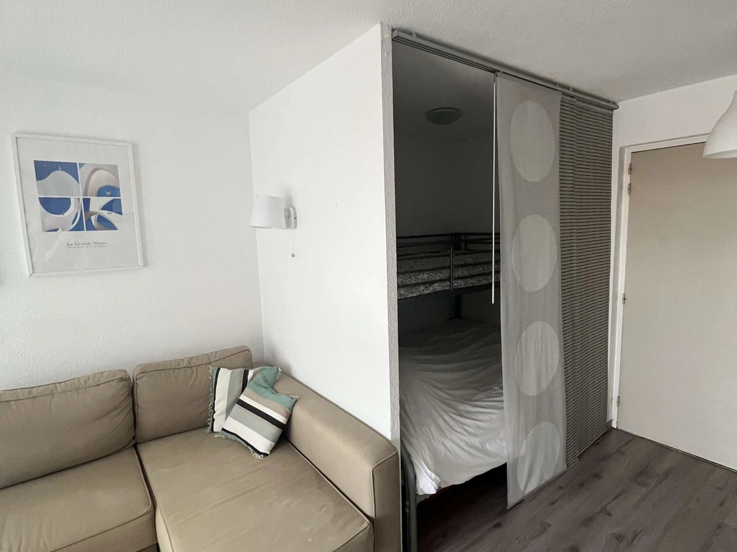 GRANDE MOTTE LE COUHANT in the Port Athena residence, 200 m from the beach and shops, this air-conditioned 24 m² one-bedroom apartment in good condition, very bright and southwest-facing, is on the 2nd and top floor. It sleeps 4. It features an air-conditioned living room with TV and a non-convertible sofa opening onto a beautiful, large 10 m² terrace. It has a functional kitchen equipped with a dishwasher. It has a bedroom with a double bed, a cabin with bunk beds (one of which is 140 cm wide and the other 90 cm wide), a bathroom with a toilet and a washing machine. It has shared parking in the residence.