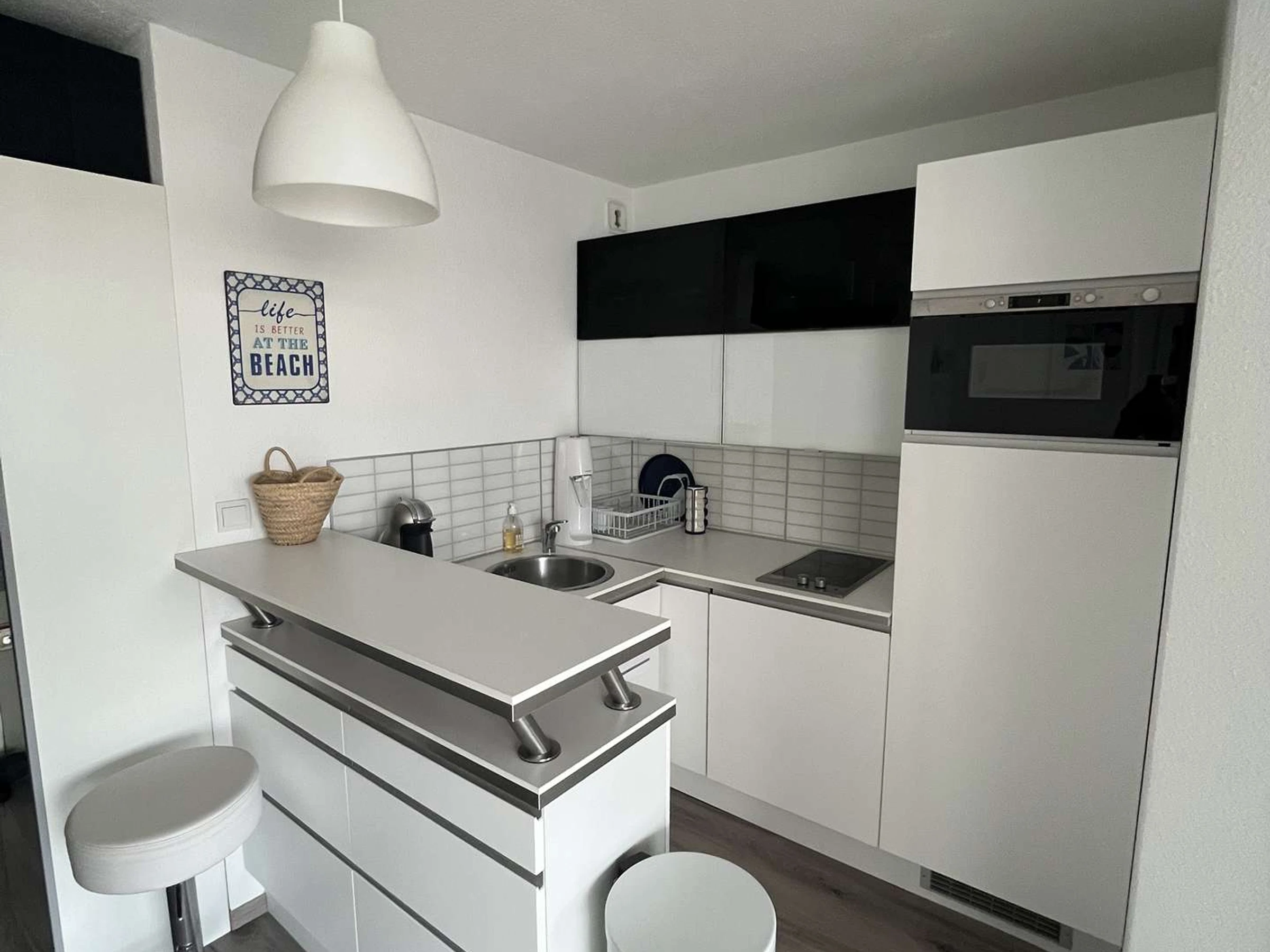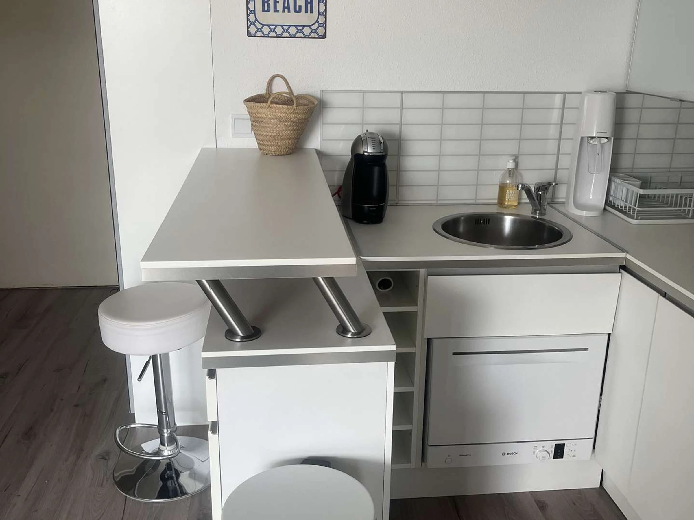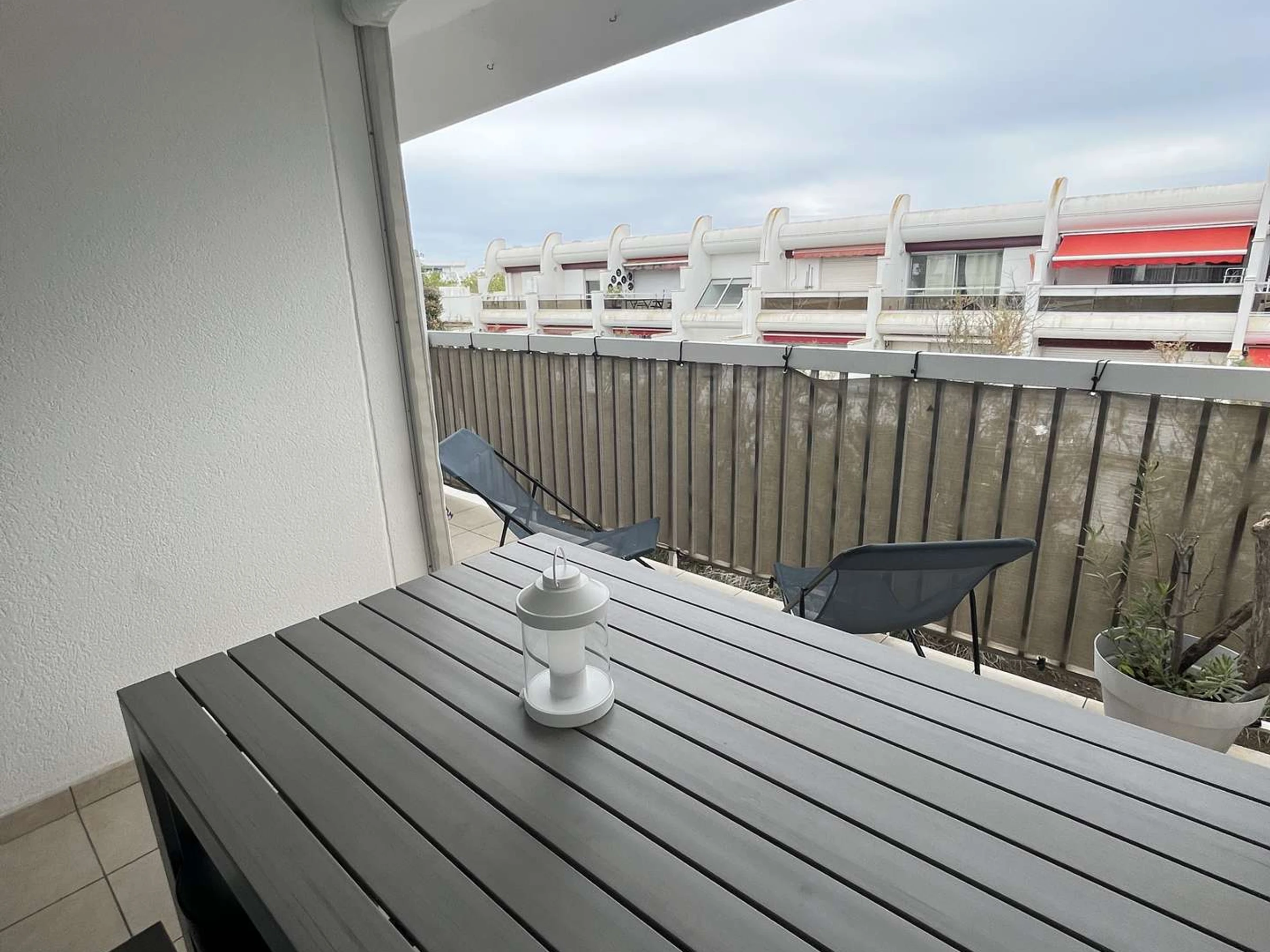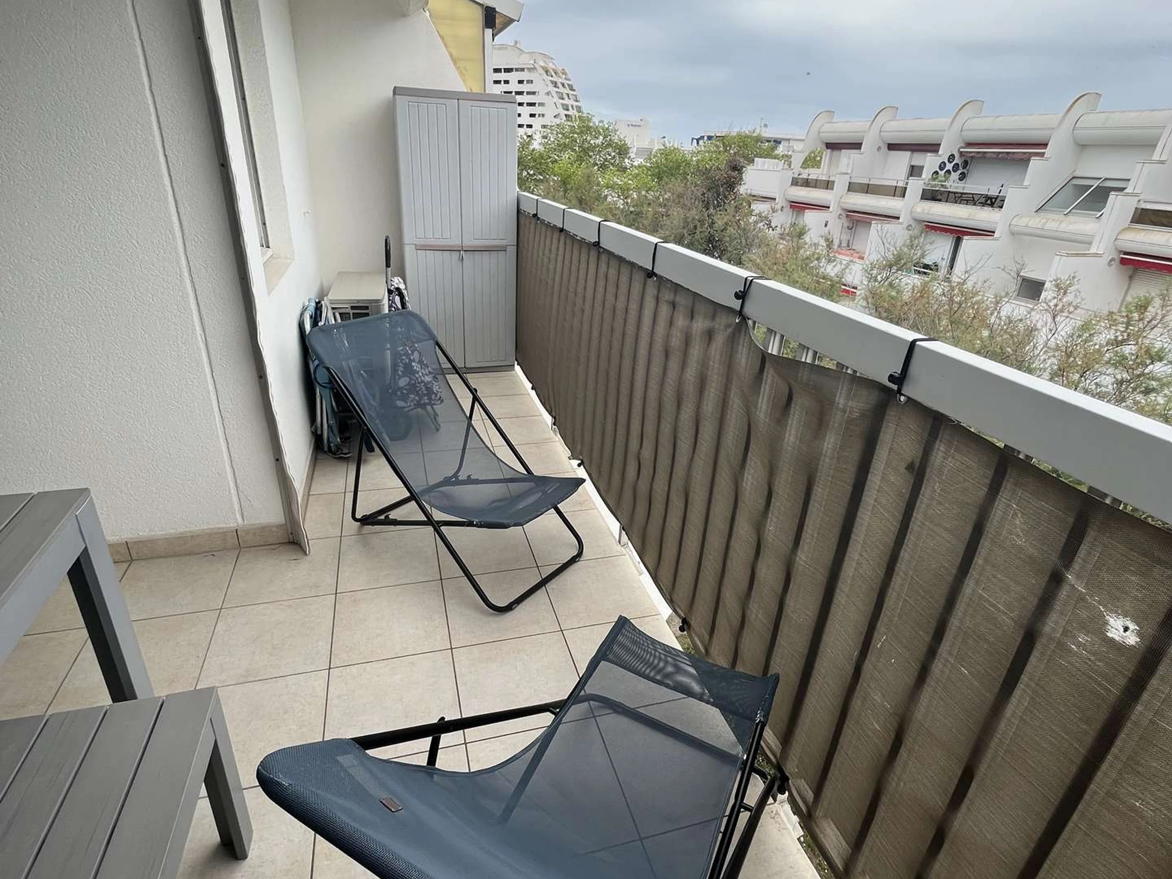 GRANDE MOTTE LE COUHANT in the Port Athena residence, 200 m from the beach and shops, this air-conditioned 24 m² one-bedroom apartment in good condition, very bright and southwest-facing, is on the 2nd and top floor. It sleeps 4. It features an air-conditioned living room with TV and a non-convertible sofa opening onto a beautiful, large 10 m² terrace. It has a functional kitchen equipped with a dishwasher. It has a bedroom with a double bed, a cabin with bunk beds (one of which is 140 cm wide and the other 90 cm wide), a bathroom with a toilet and a washing machine. It has shared parking in the residence.