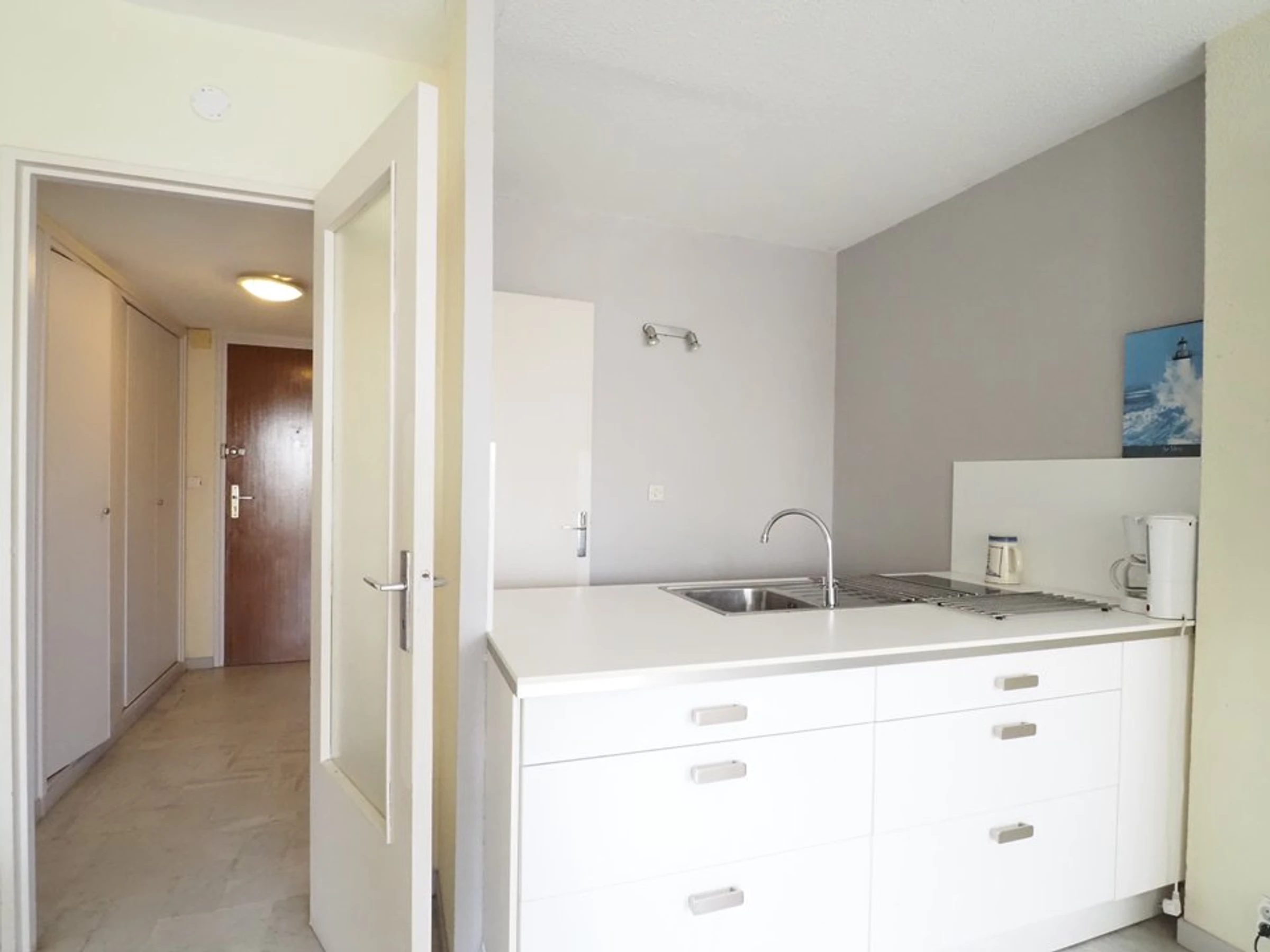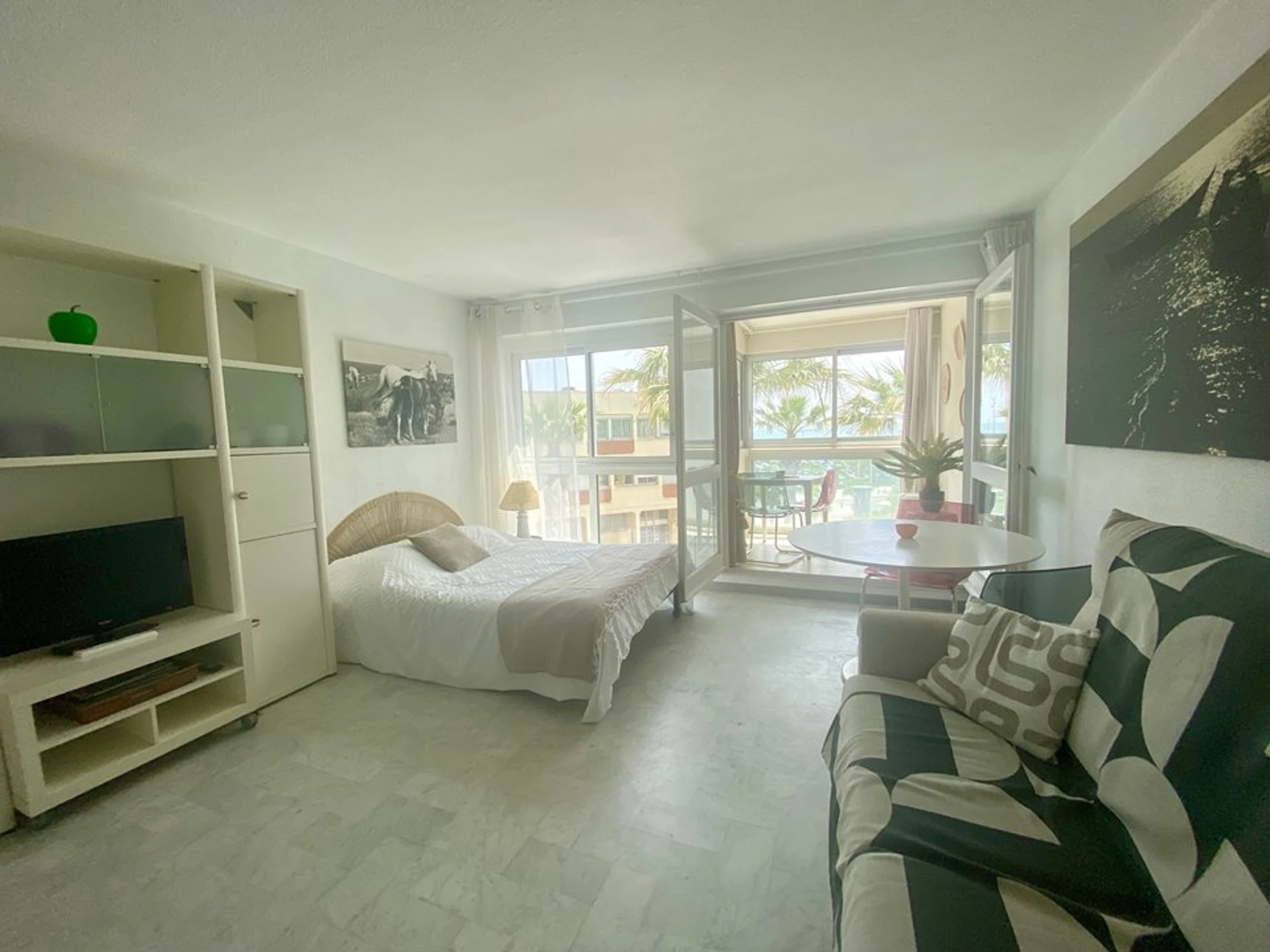 You'll have an entrance hall with large closets, a bathroom with a bathtub and toilet, a fully equipped kitchen with a microwave, electric stovetop, mini-fridge, coffee maker, etc. A sunny living room features a brand new, high-end sofa bed (140cm) and a double bed (140cm), as well as a television. It opens onto a closed loggia with a table, perfect for enjoying the city and sea views during breakfast or a family meal.