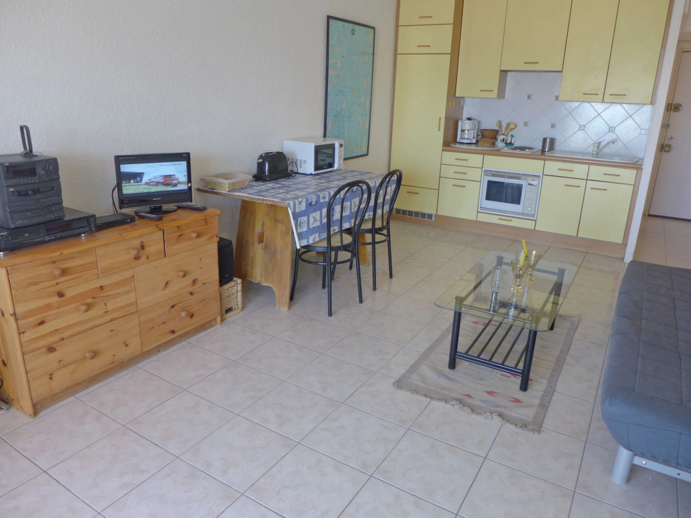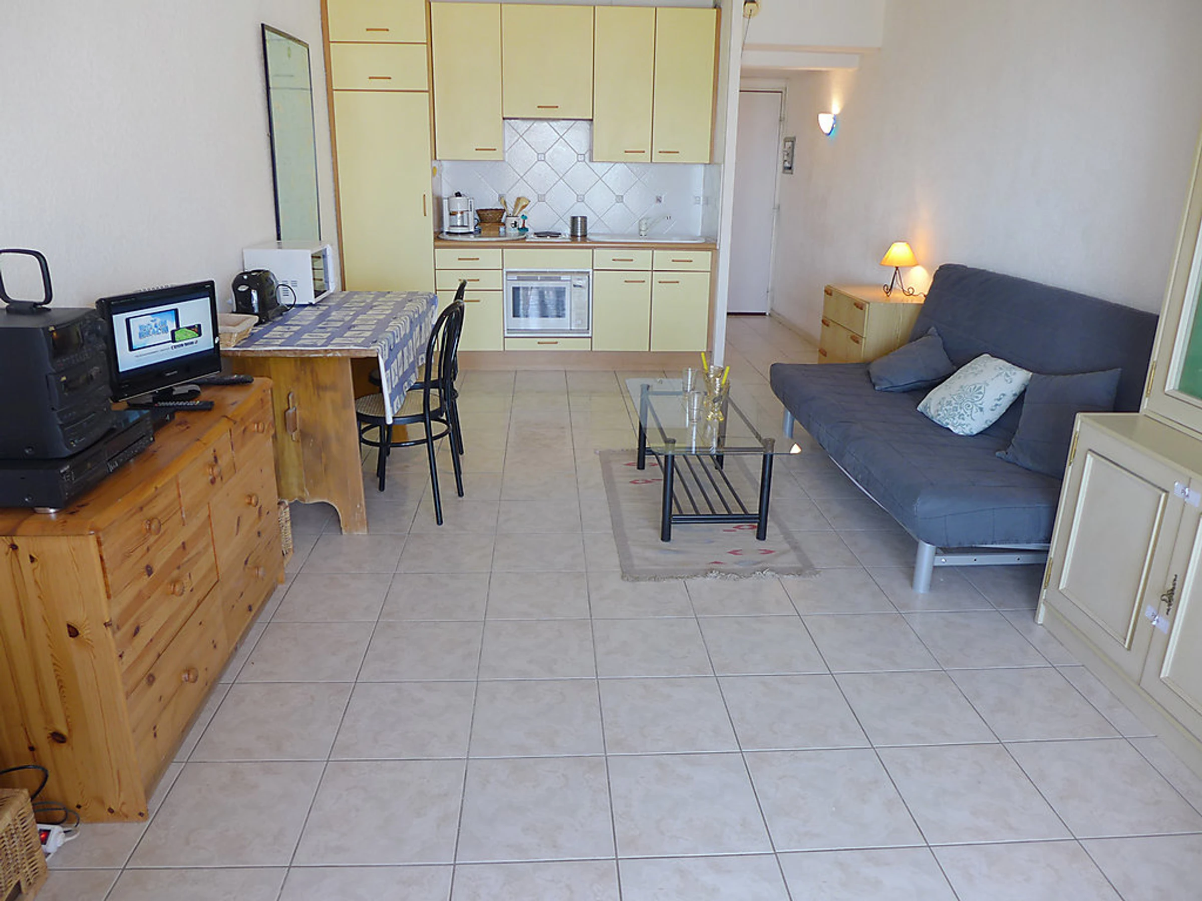 1-room studio 28 m2 on 6th floor. Partly renovated in 2015: living/dining room with 1 double sofabed (140 cm), TV (flat screen). Open kitchen (2 hot plates, mini-oven, microwave, freezer). Shower, sep. WC. Small terrace 6 m2, roofed, south facing position. Balcony furniture. Beautiful view of the sea. Facilities: washing machine. Internet (WiFi, extra). Please note: no parking. Included: Final cleaning, ERV assurance annulation gratuite Available on site with supplement: Towels (initial supply) 5.0EUR per person, Bed linen (initial supply) 10.0EUR per person, Pushchair (Buggy) 3.0EUR per day, WIFI (max. 10 connecting devices – LIMIT 2 GB per day) 5.6EUR per day, Booster seat (for children) 3.0EUR per day, Cot (up to 2 years) 3.0EUR per day Mandatory extra services on site: Local tax 0.83EUR per person/day, Local tax babies (0-2) (per person/day), Local tax children (per person/day)