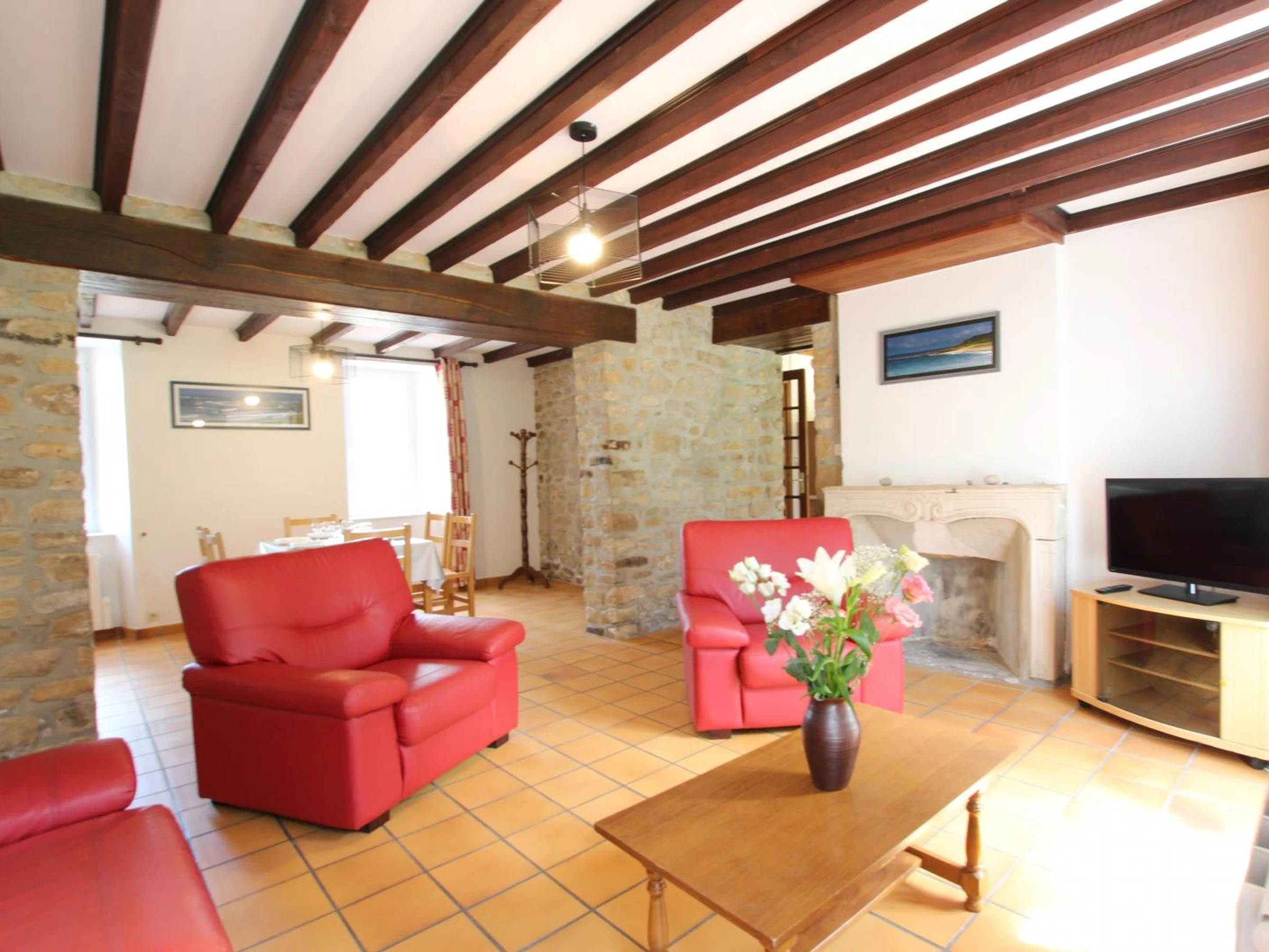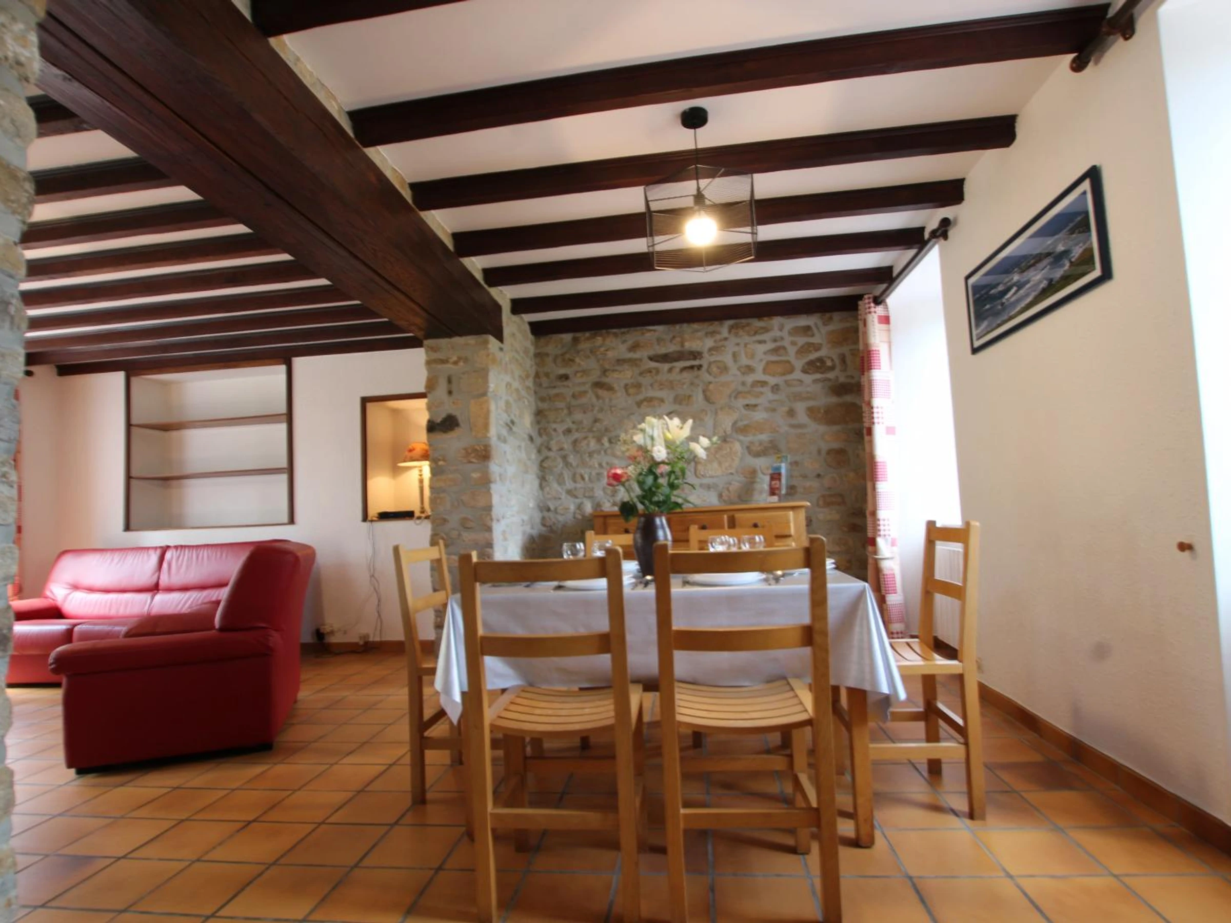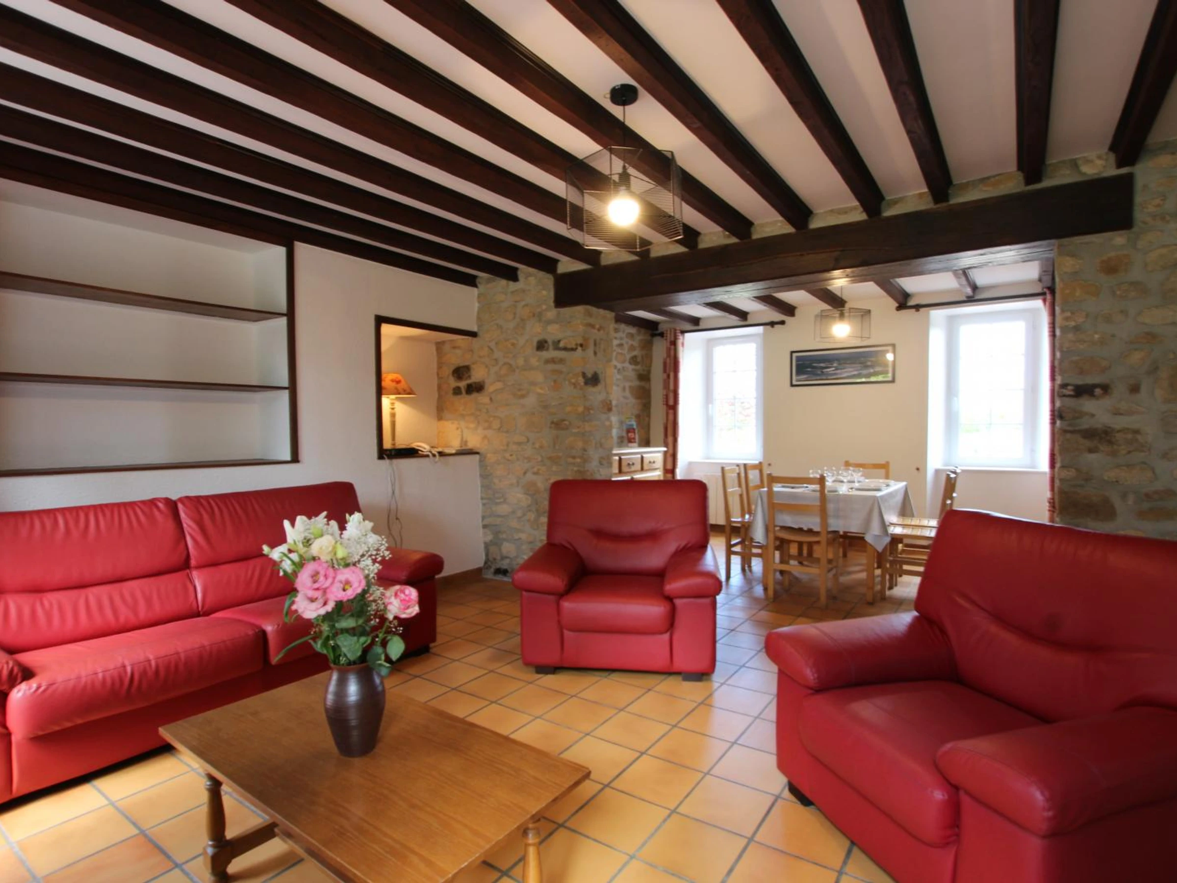 Semi-detached house adjoining another rental property. Living room. Kitchen. Bedroom 1 (1 double bed 140x190cm). Bedroom 2 (2 single bunk beds 90x190cm). 1 sofa bed. Shower room. 2 toilets. TV. Internet. Dishwasher. Washing machine. Bed linen and towels not provided. Electric heating is charged at the current rate. Cleaning service is also charged at the additional cost. Shared, unfenced grounds. Garden furniture. Barbecue. Shelter. Cleaning deposit required on arrival. Two gîtes have been created in this beautiful stone house. A very pleasant dining area with large bay windows allows you to fully enjoy the garden.
