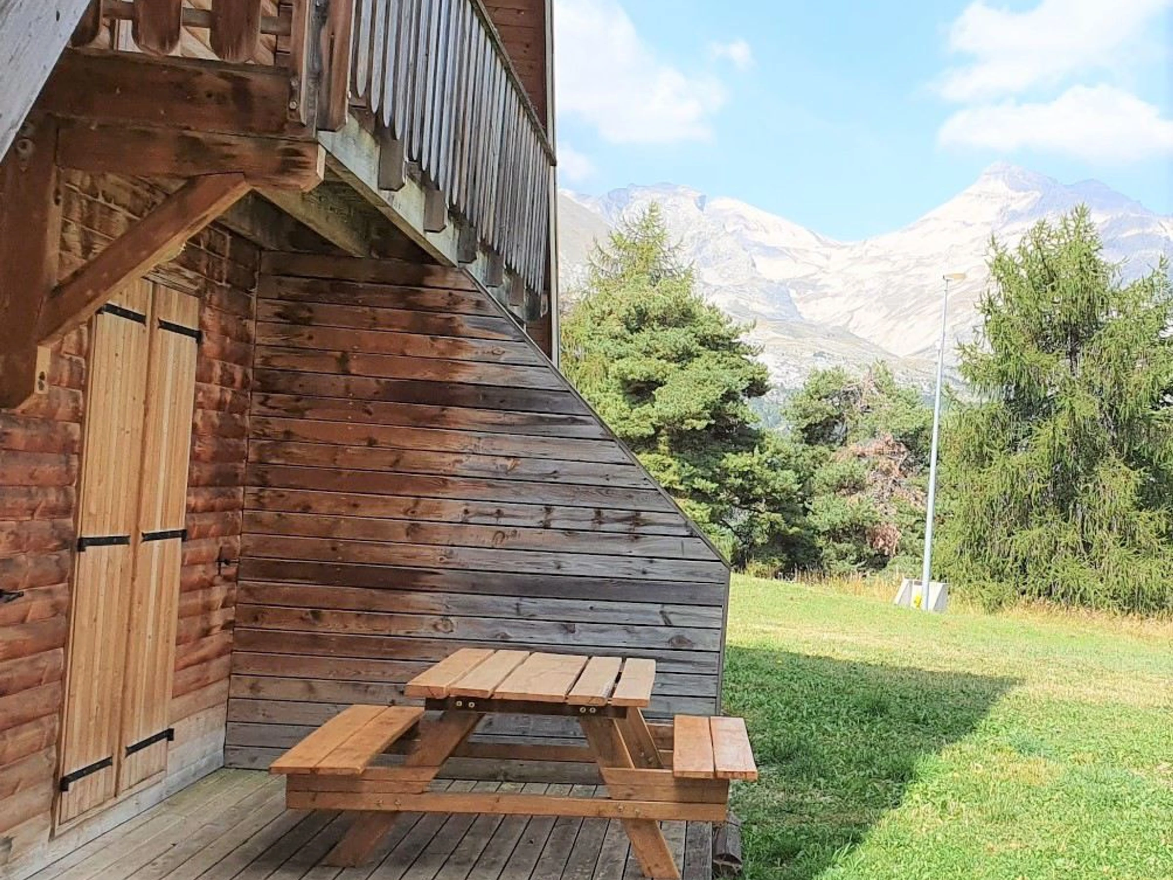 Terrasse avec table et transats vue montagne. Local à skis. Parking gratuit.