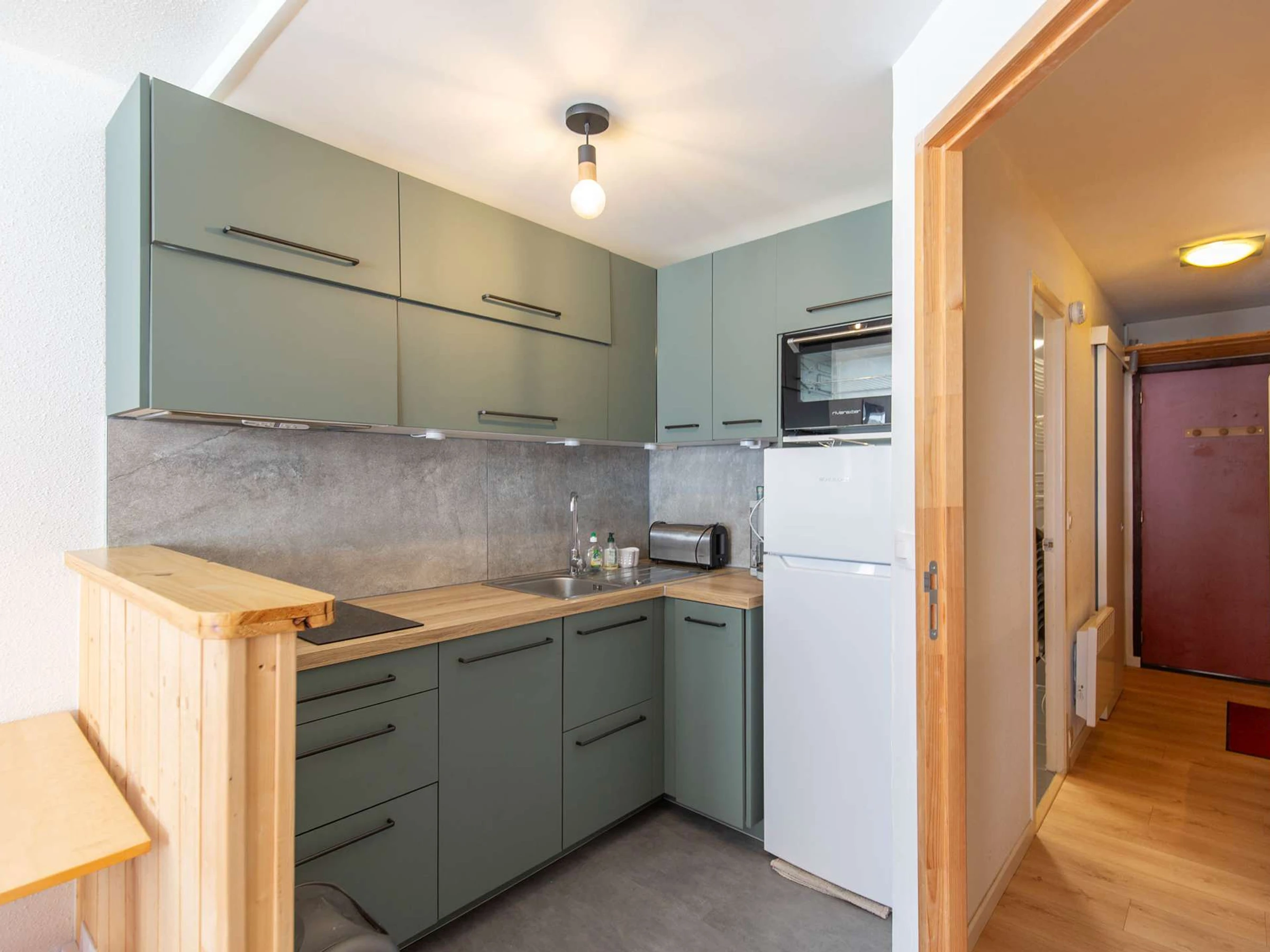 Living room equipped with a television and a double sofa bed. Alcove with two 70cm bunk beds. PVC flooring. Kitchenette open to the living room with a two-burner induction cooktop, microwave, 120-liter refrigerator, toaster, and filter coffee maker.