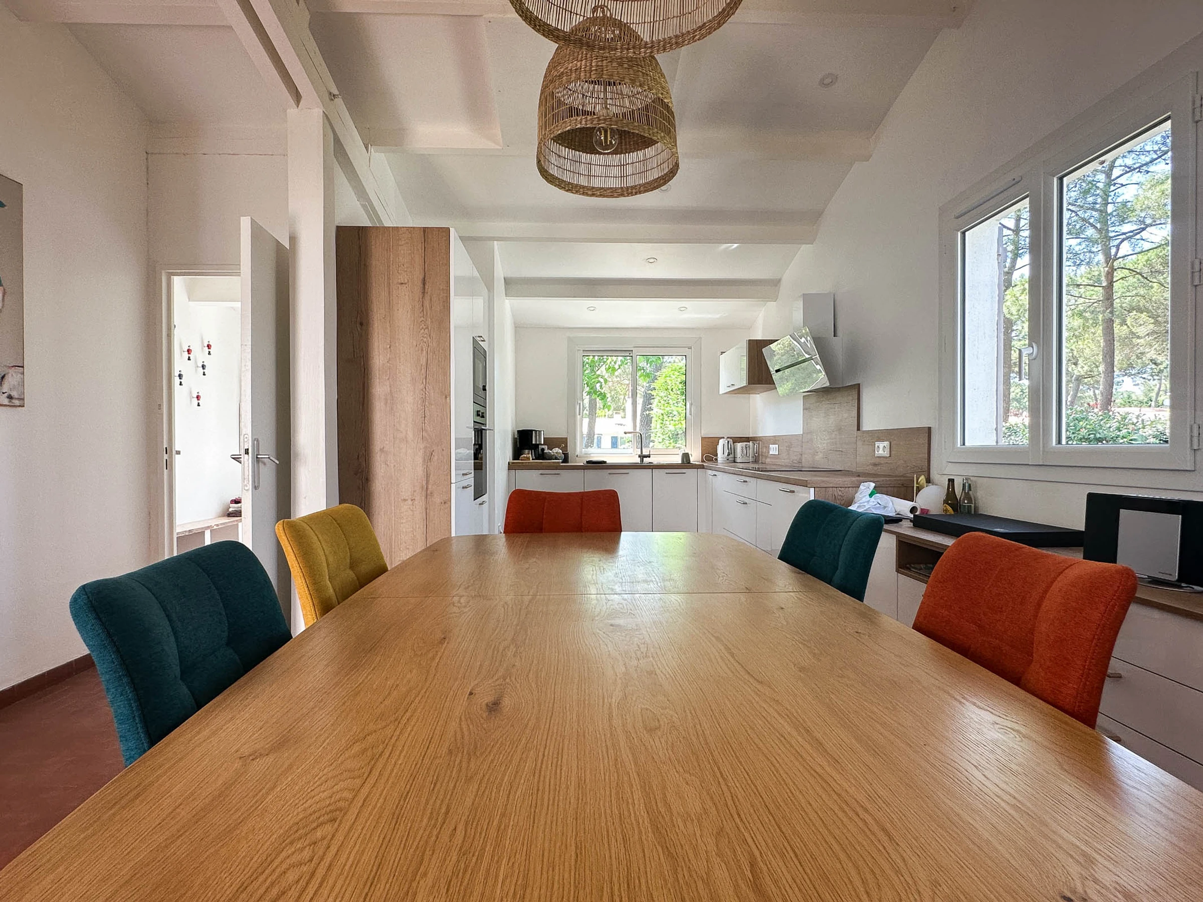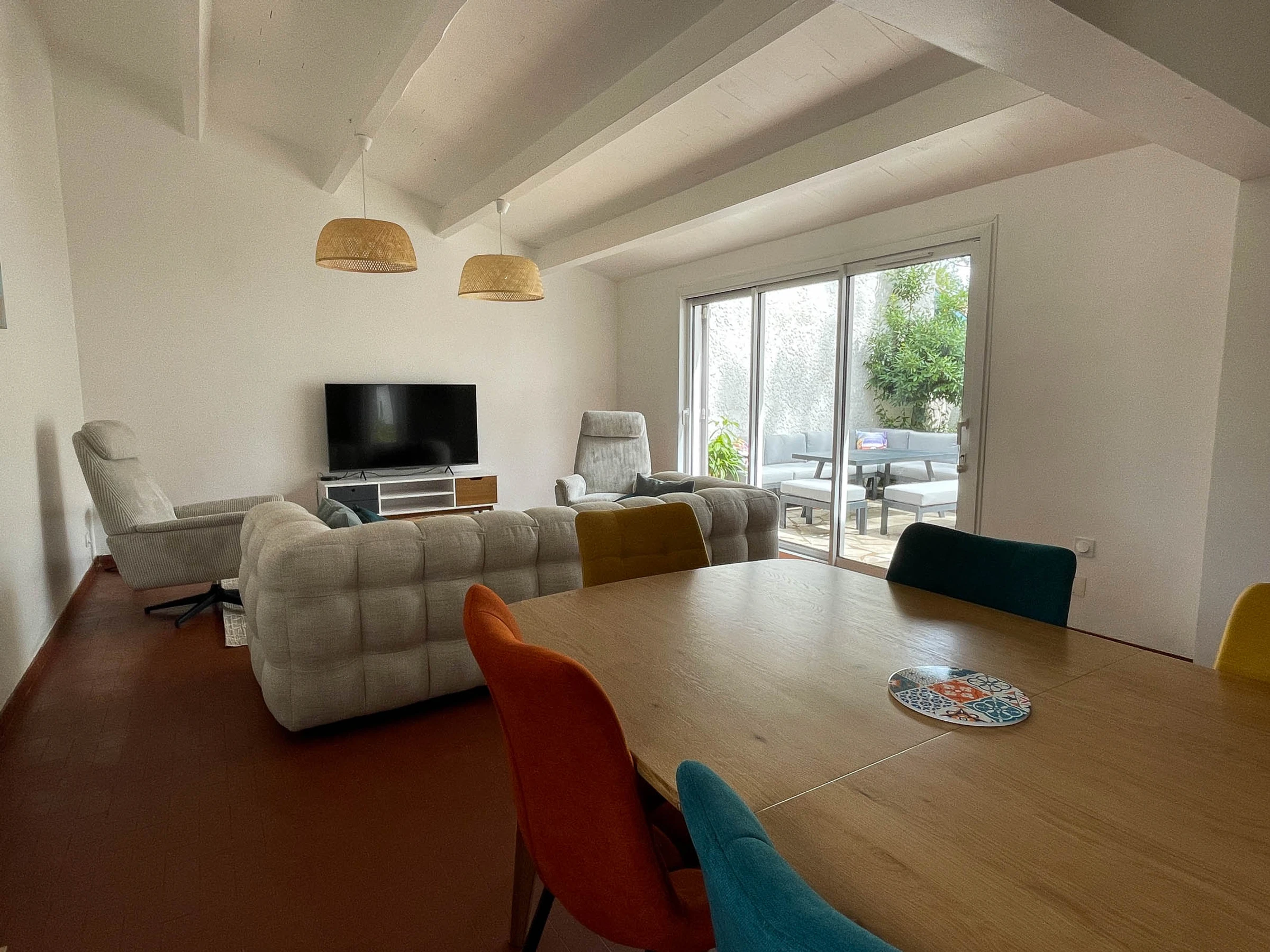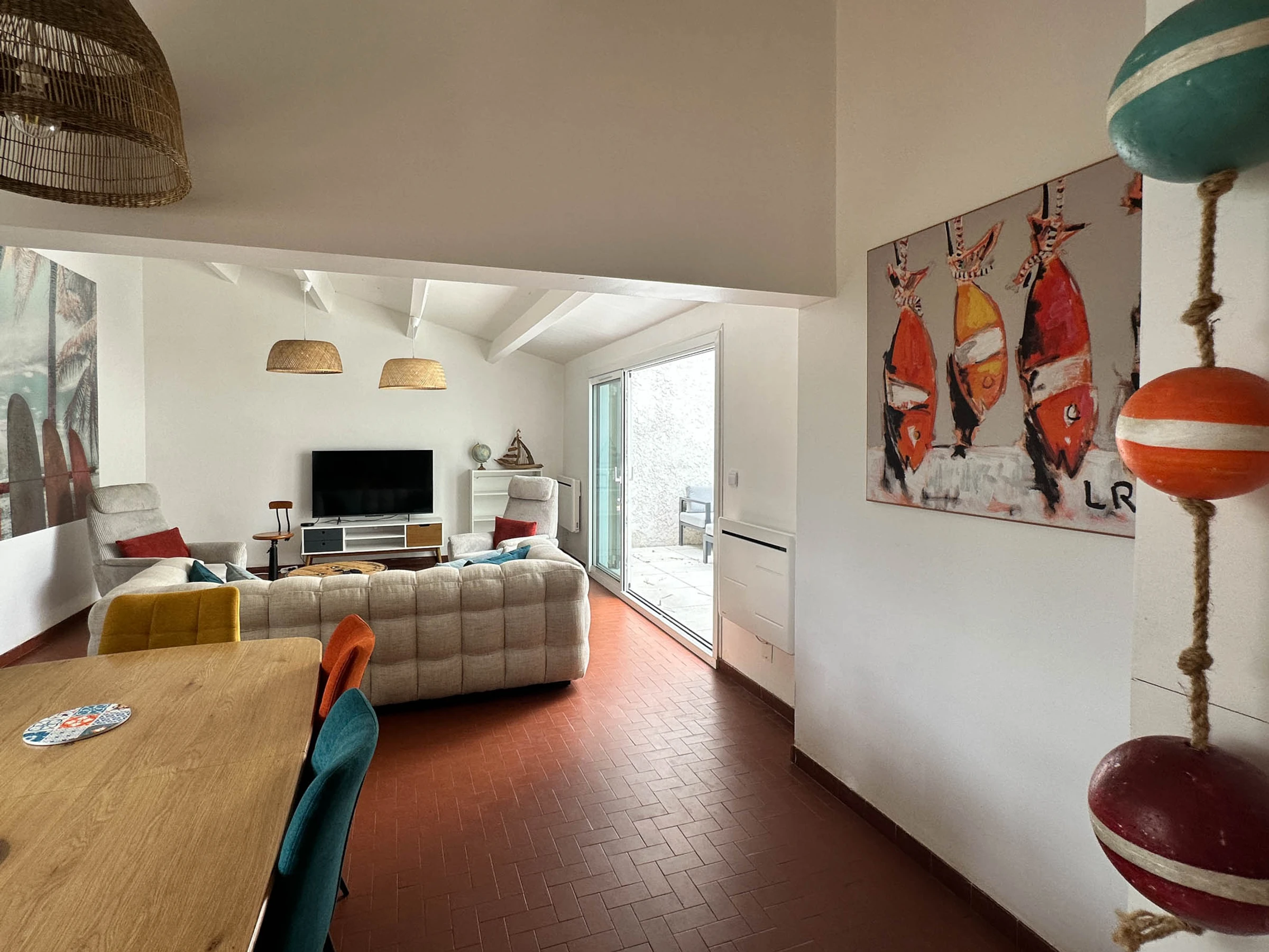 - Entrance hall with built-in wardrobes - Open-plan living area with fitted and equipped kitchen: induction hob, fridge/freezer, oven, microwave, dishwasher, washing machine, coffee maker, toaster, kettle, lounge area with TV, armchairs and sofa, internet access, and French doors opening onto a terrace.