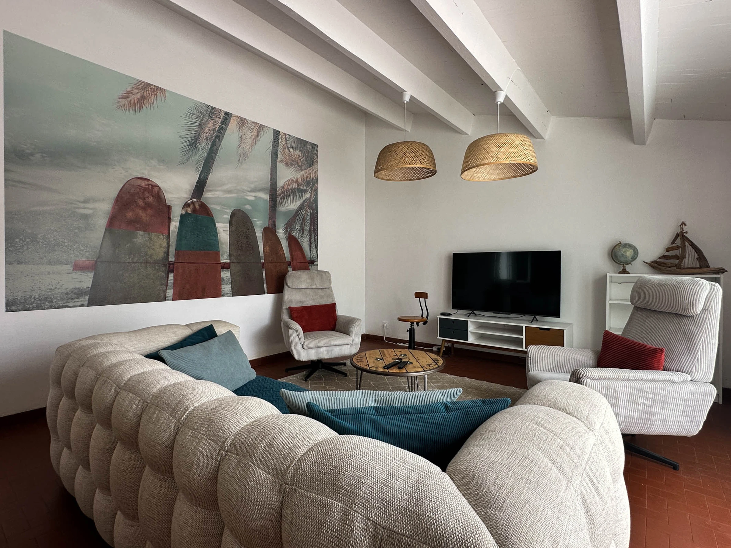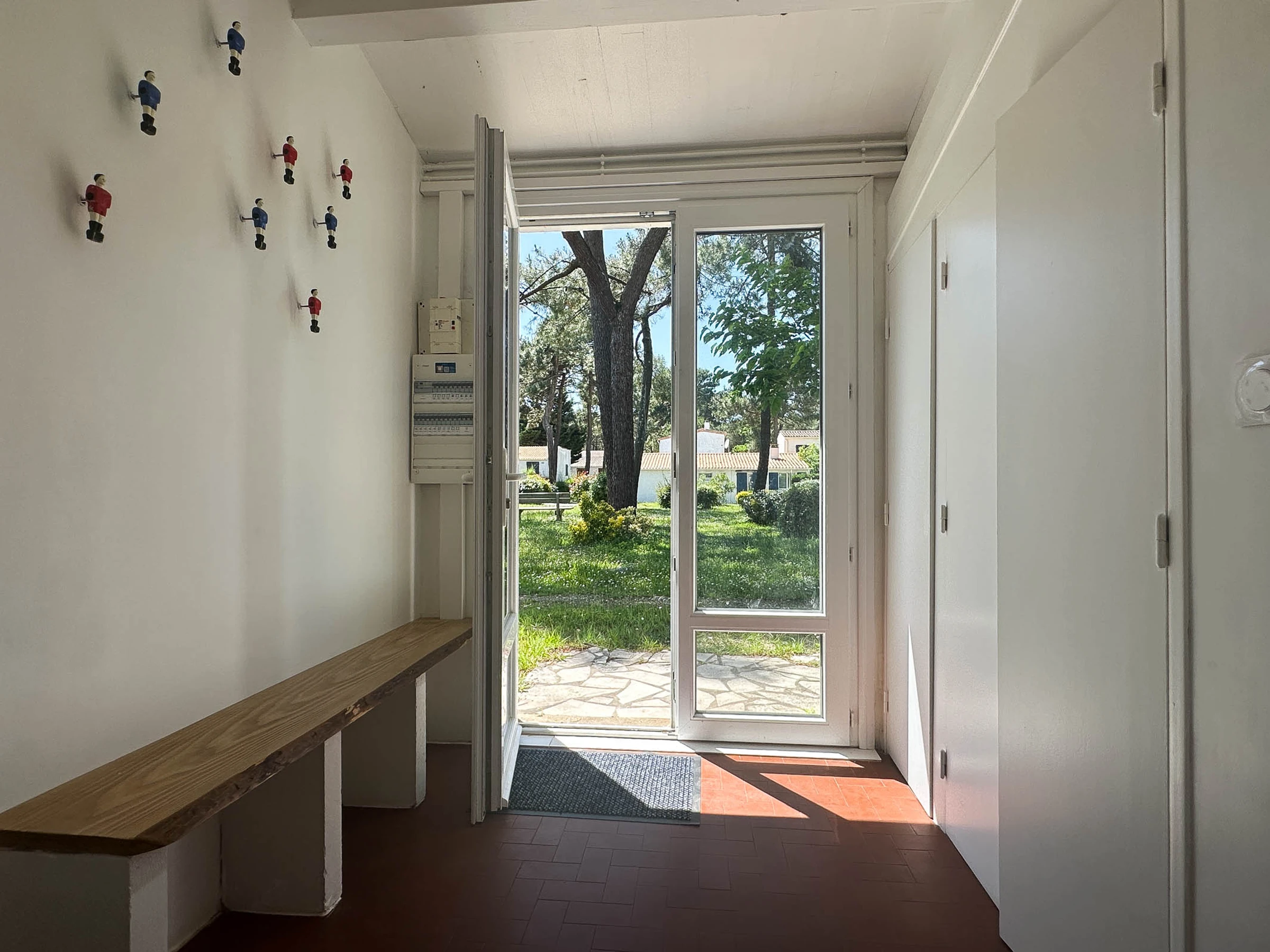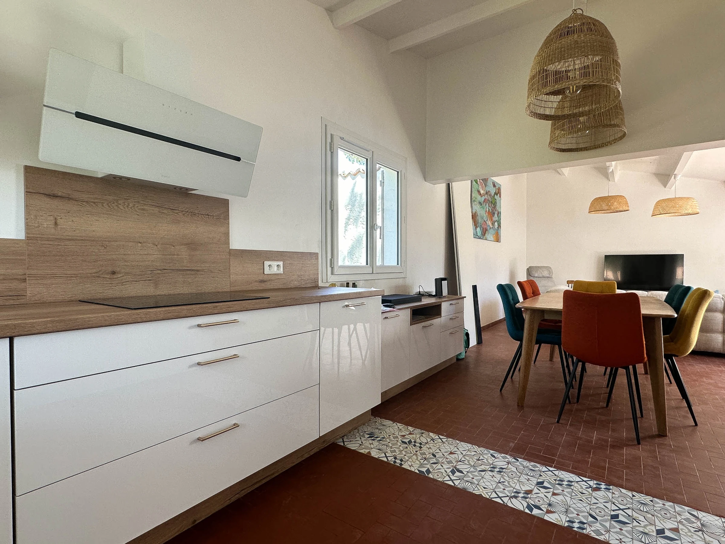 - Entrance hall with built-in wardrobes - Open-plan living area with fitted and equipped kitchen: induction hob, fridge/freezer, oven, microwave, dishwasher, washing machine, coffee maker, toaster, kettle, lounge area with TV, armchairs and sofa, internet access, and French doors opening onto a terrace.