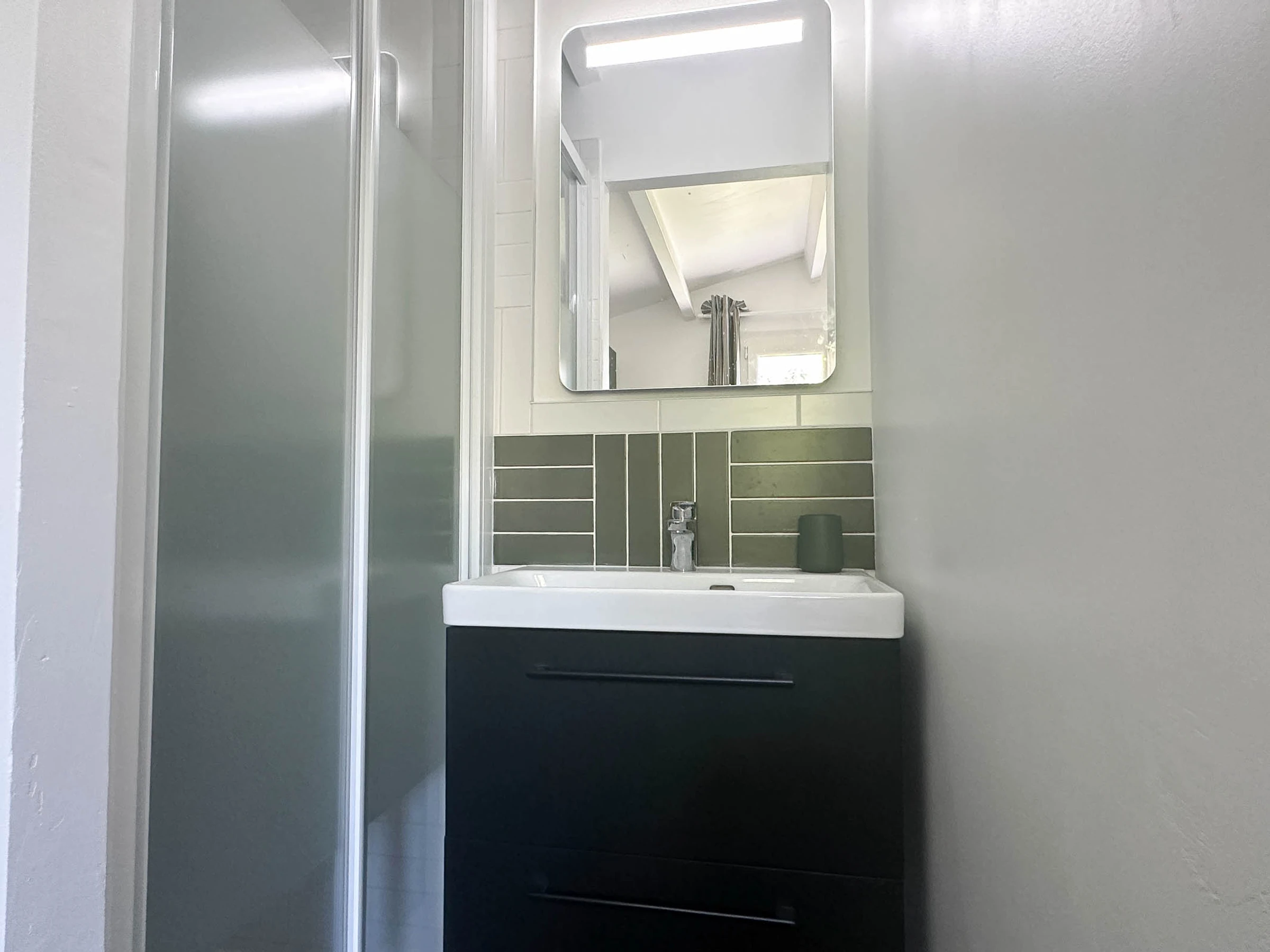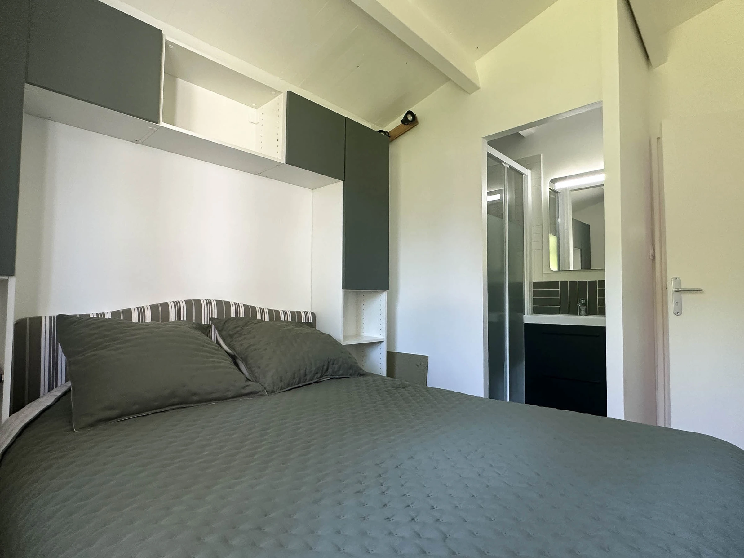 1 bedroom with a double bed (140cm), en-suite shower and washbasin, 1 bedroom with a double bed (140cm), wardrobe and desk area, and a third bedroom with four single bunk beds (90cm).