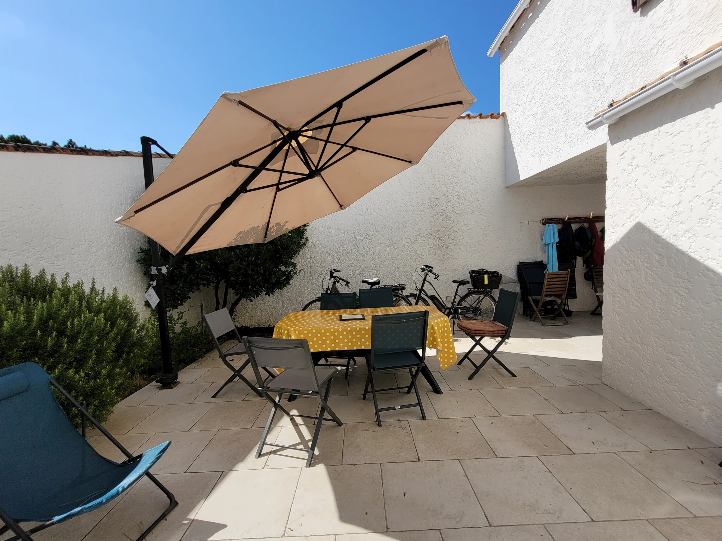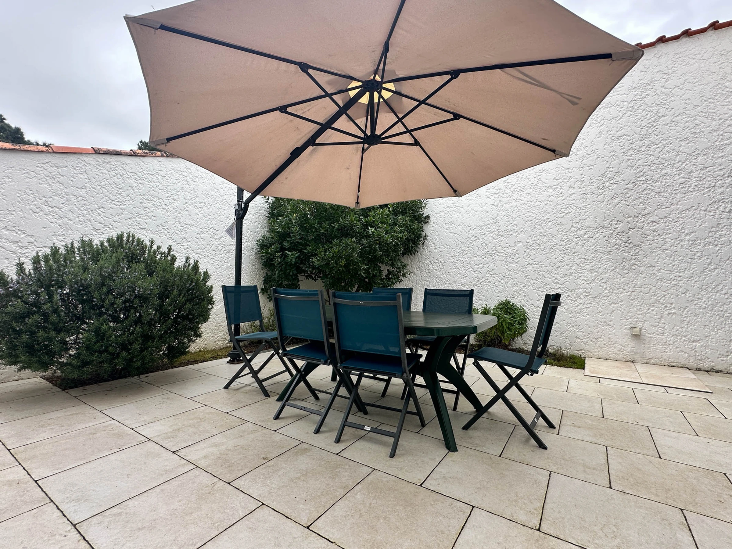 Covered patio with shower room and suspended toilet ideal for returning from the beach, and tiled open area with garden furniture, offset parasol, charcoal barbecue.