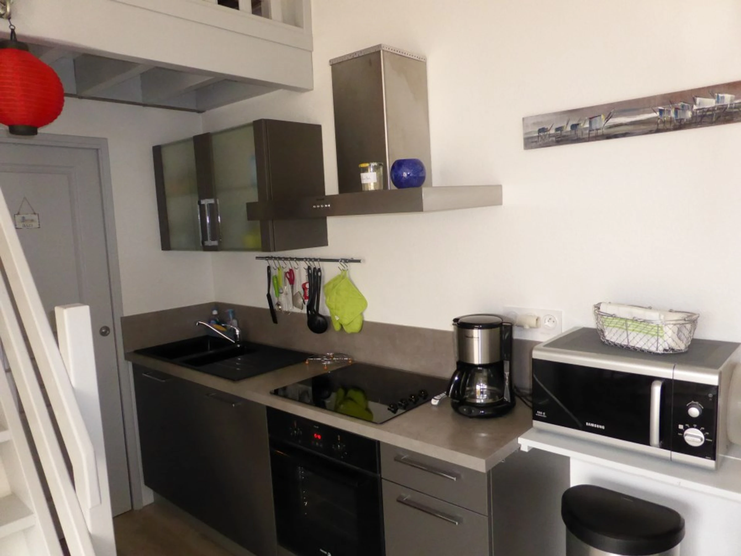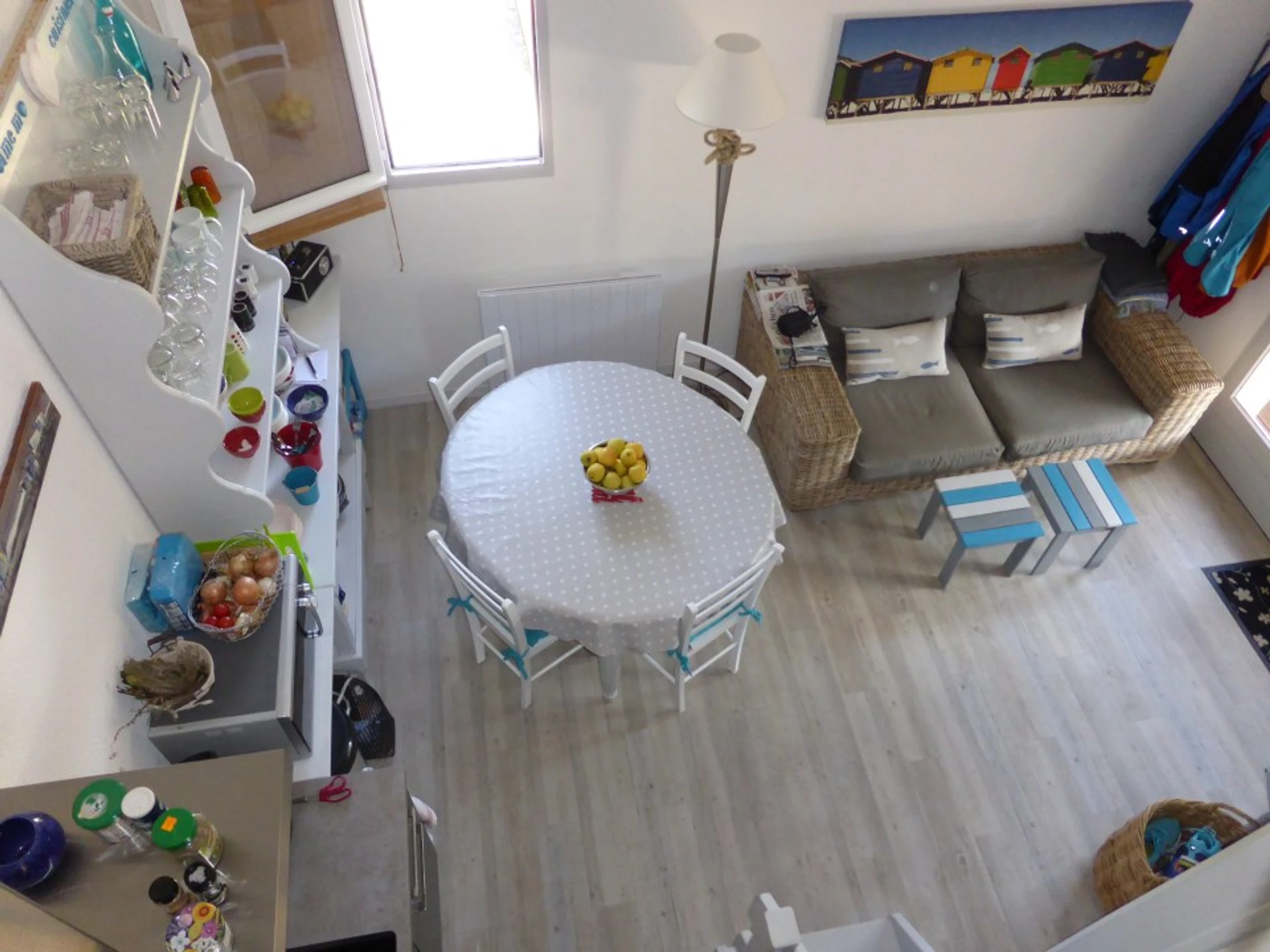 About 1200 m from the sea and 900 m from shops - In residence with swimming pool and tennis court - Terraced house that can accommodate 4/5 people - Living area around 32 m² - Very nice decor - Living room with sofa and TV opening onto south facing wooden terrace with awning -Fitted US kitchen, induction hob, extractor hood, LL, LV, MO, freezer -