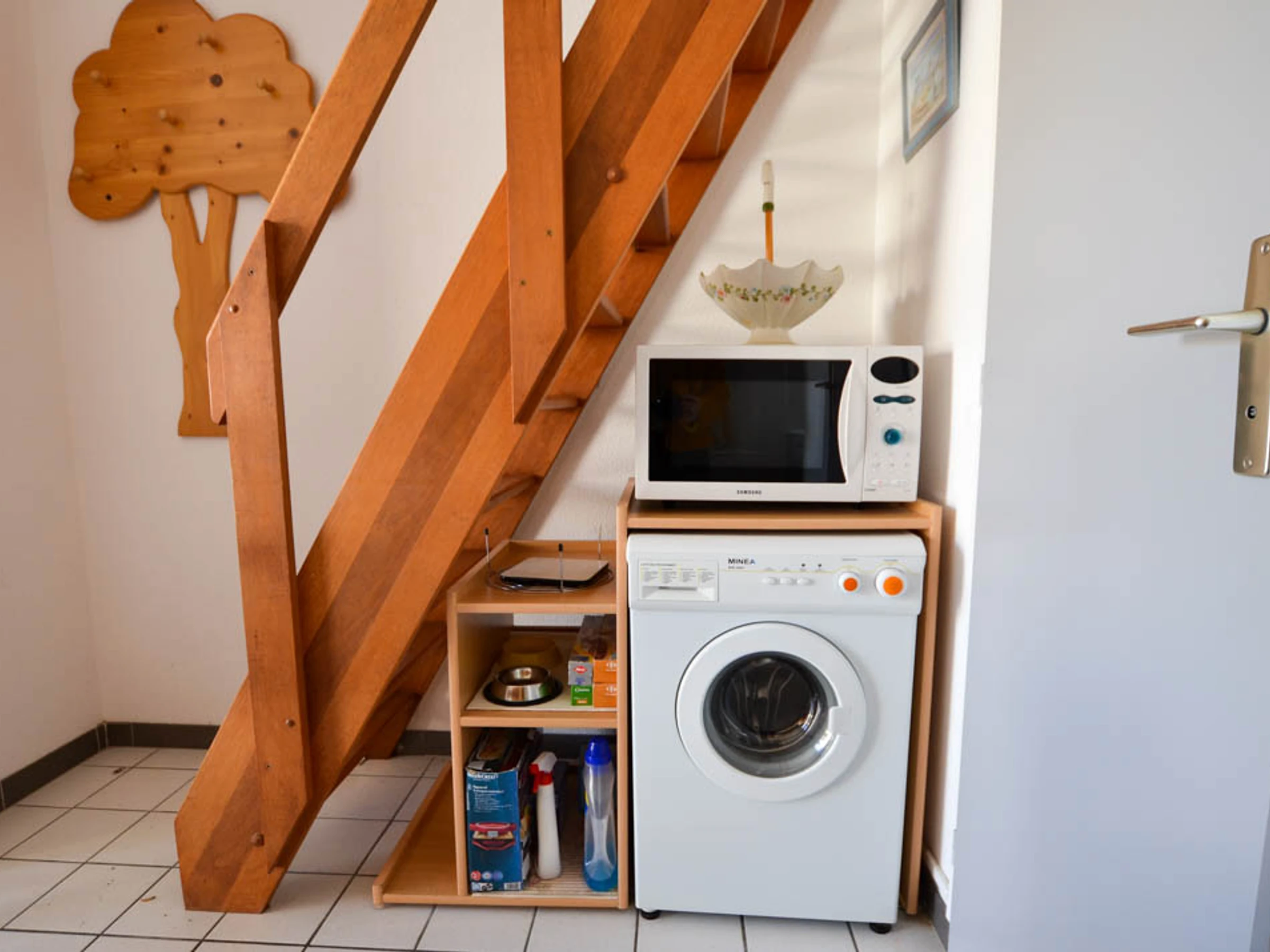 On the ground floor: - a living room with equipped kitchenette (table-top fridge with feezer, 2-burner ceramic hob, washing machine, toaster, microwave, coffee maker) - dining area - sofa with TV opening onto the east-facing terrace
