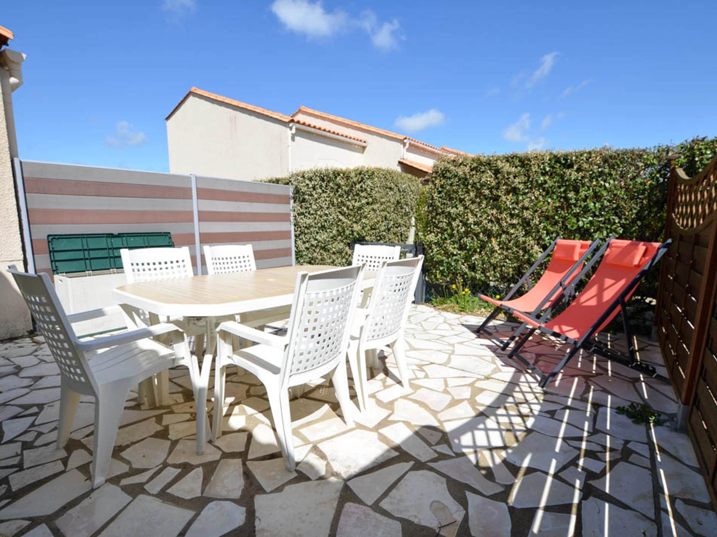 Enclosed terrace closed by a gate with garden furniture - sun loungers and parasol