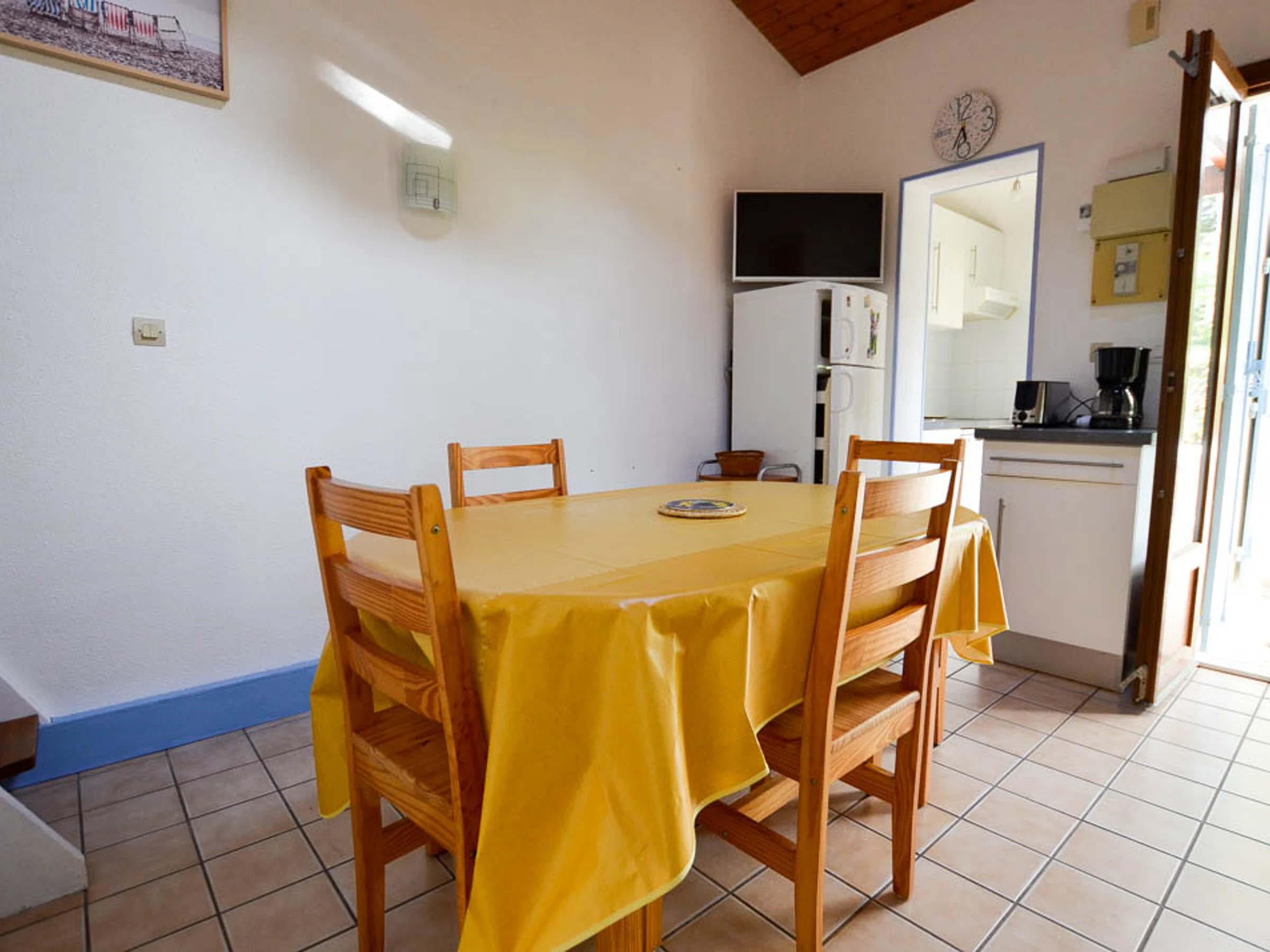Corner house T3 bis of 43m² located in a quiet residence, close to the center and its shops, on the edge of a lake, comprising: On the ground floor: Living room with sofa and TV - separate kitchen, fitted and equipped ( oven/microwave, ceramic hob, fridge/freezer, dishwasher, coffee maker, toaster) opening onto the terrace - Bedroom with 1x140 bed - Cabin bedroom with 2x90 bunk beds - Shower room with WC and washing machine.