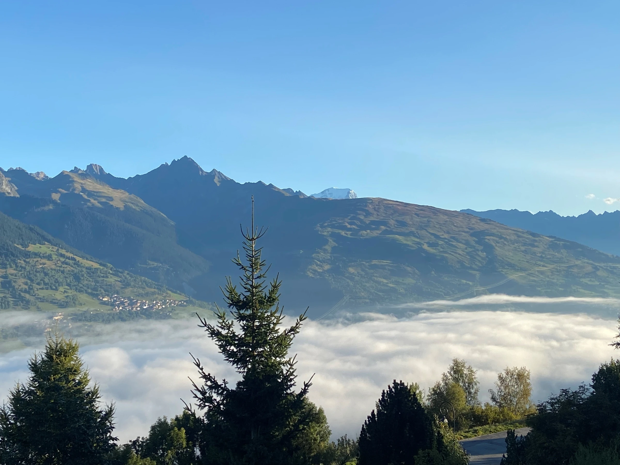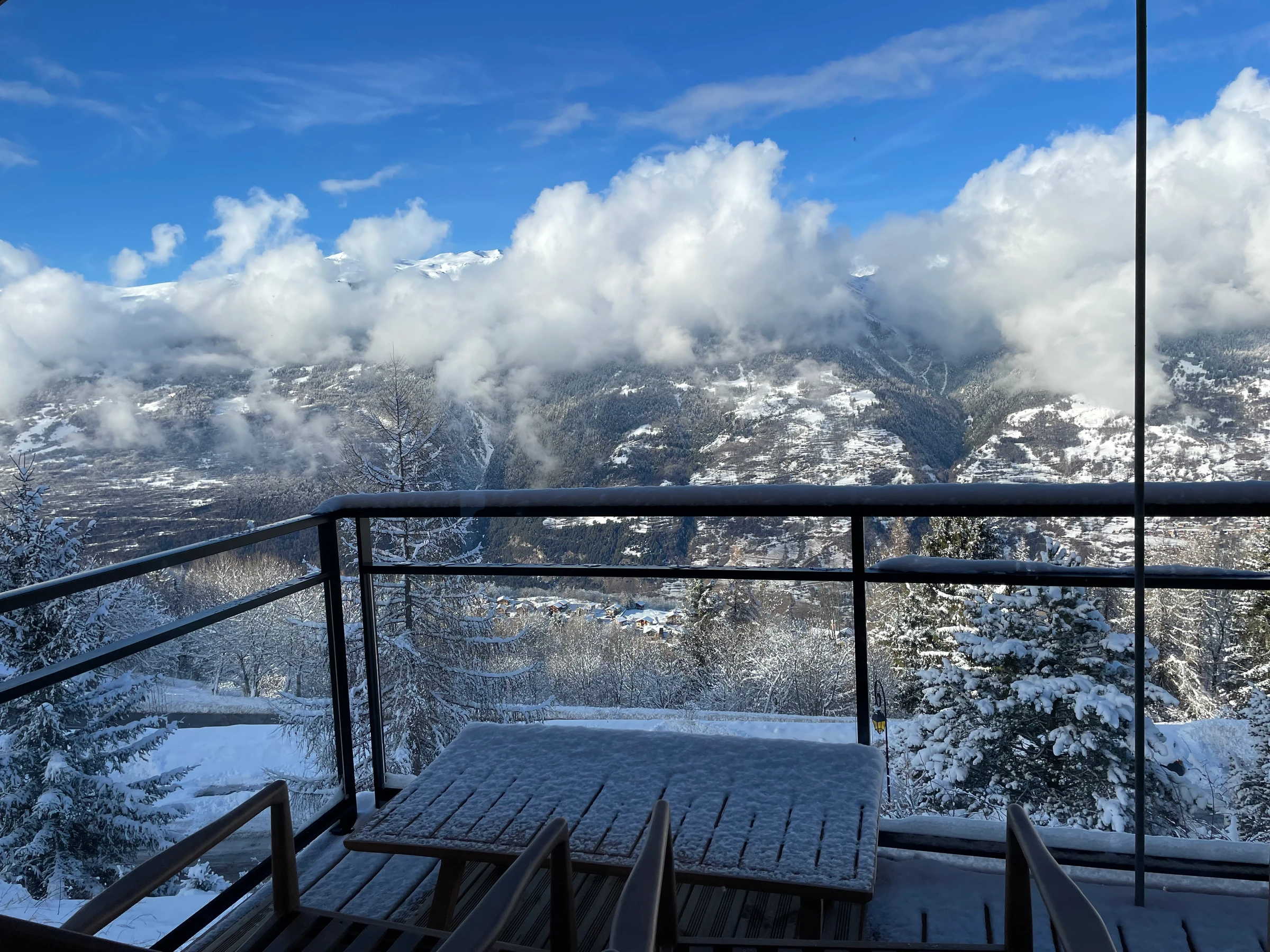 An open living room – dining room – kitchen with a splendid view of the mountains not overlooked, from the Beaufortain massif to Mont Blanc, connected TV, stove and armchairs, access to a large balcony.