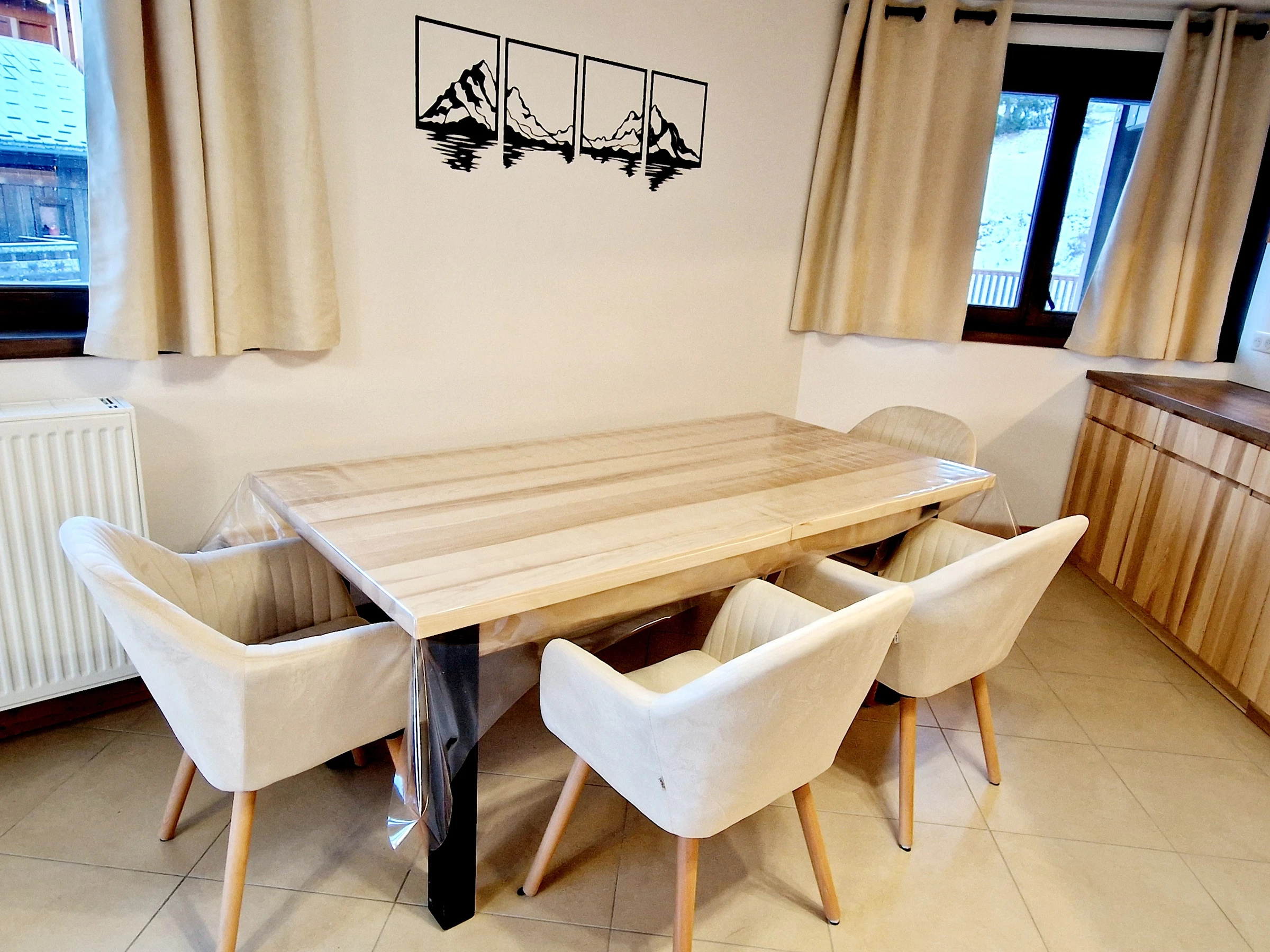 A fully furnished and equipped kitchen with all necessary comforts: fondue and raclette sets, refrigerator, oven, stove, microwave, kettle, coffee maker, toaster, dishwasher, and more.