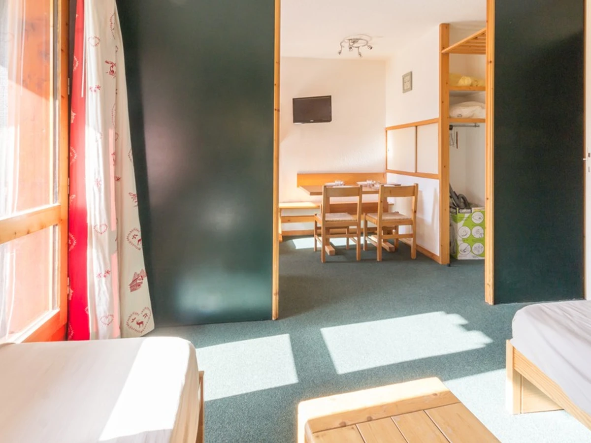 This divisible studio with a south-facing view on the slopes consists of an equipped kitchen (electric hob, oven, coffee maker, dishwasher, microwave, and table top fridge), a bathroom with a bathtub and a separate toilet. The sleeping area has two single sofa beds and the living and dining area has two single beds. These two rooms can be separated by a sliding partition to take advantage of two separate sleeping areas.