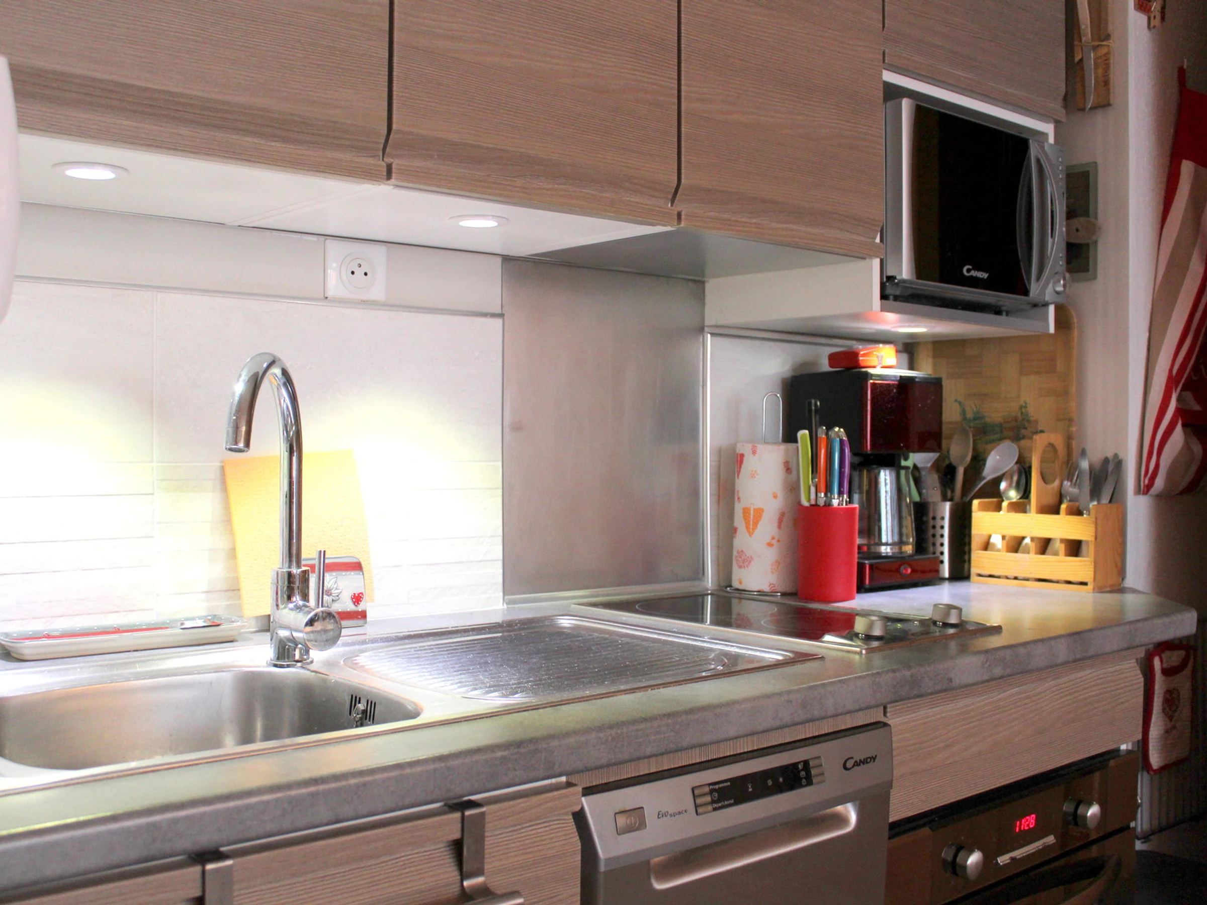 Kitchenette : ceramic plates, fridge, dishwasher, oven and microwave.