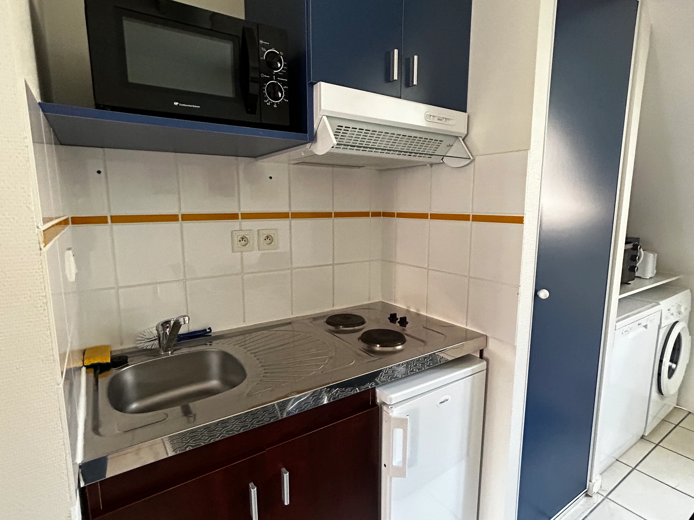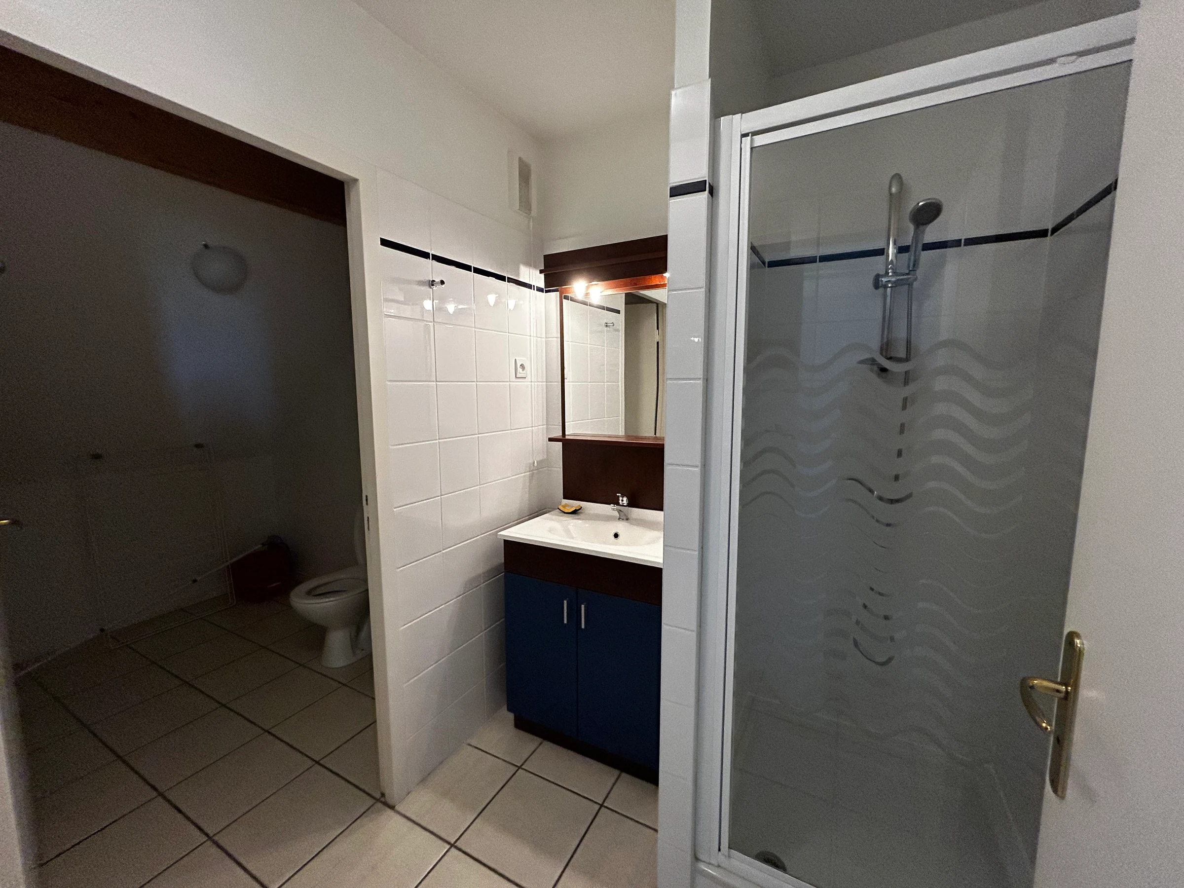 This apartment comprises a large living room with a lounge area including a sofa bed, a double bed (140 x 190 cm), and a fully equipped kitchenette, a shower room, and a separate toilet.