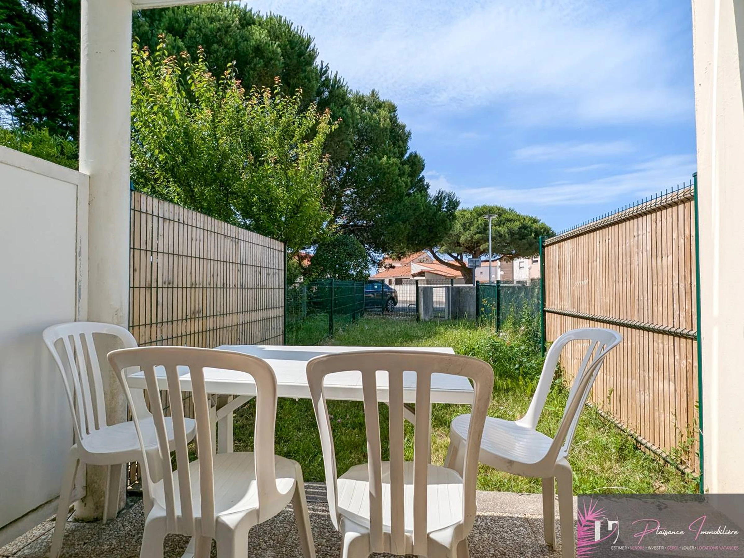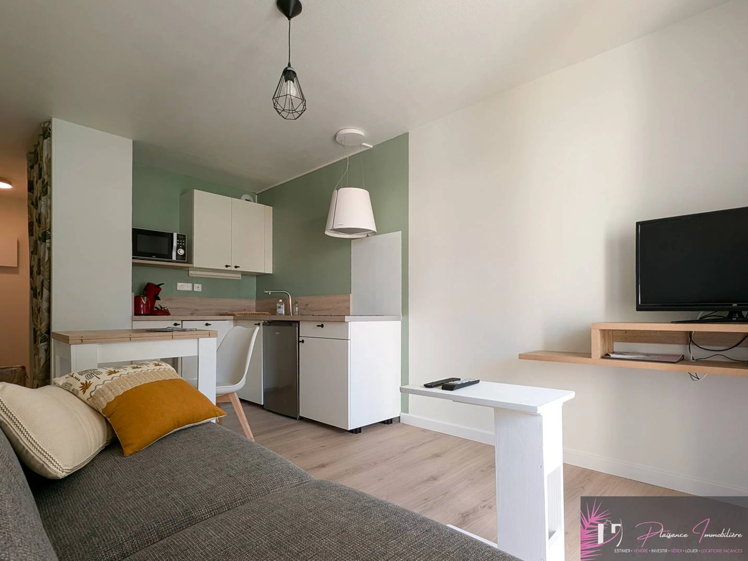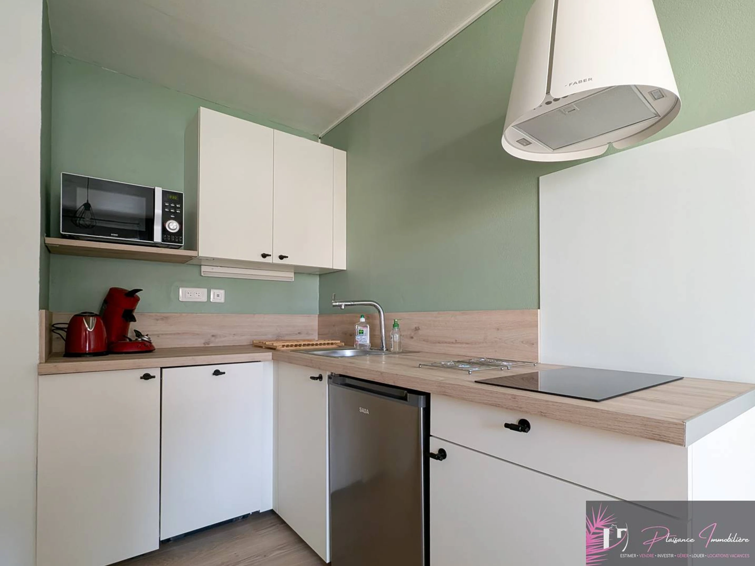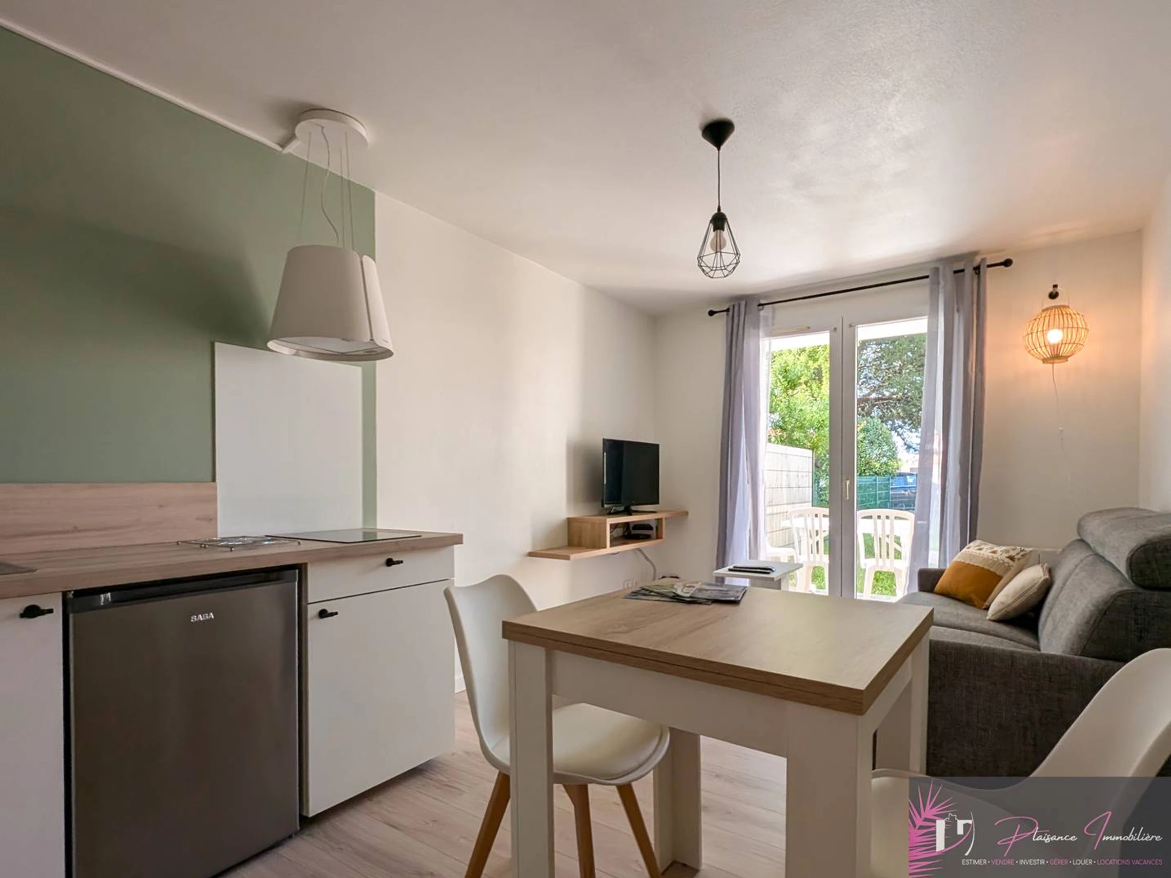 Very pleasant studio renovated and equipped for 2 people on the ground floor with pretty garden. Access to the swimming pool of the residence. Living room with a sofa bed, storage unit, TV, dining area. The kitchenette is equipped with 2 hotplates, a table top fridge and an electric oven. Shower room (walk-in shower and vanity unit). Separate toilets.
