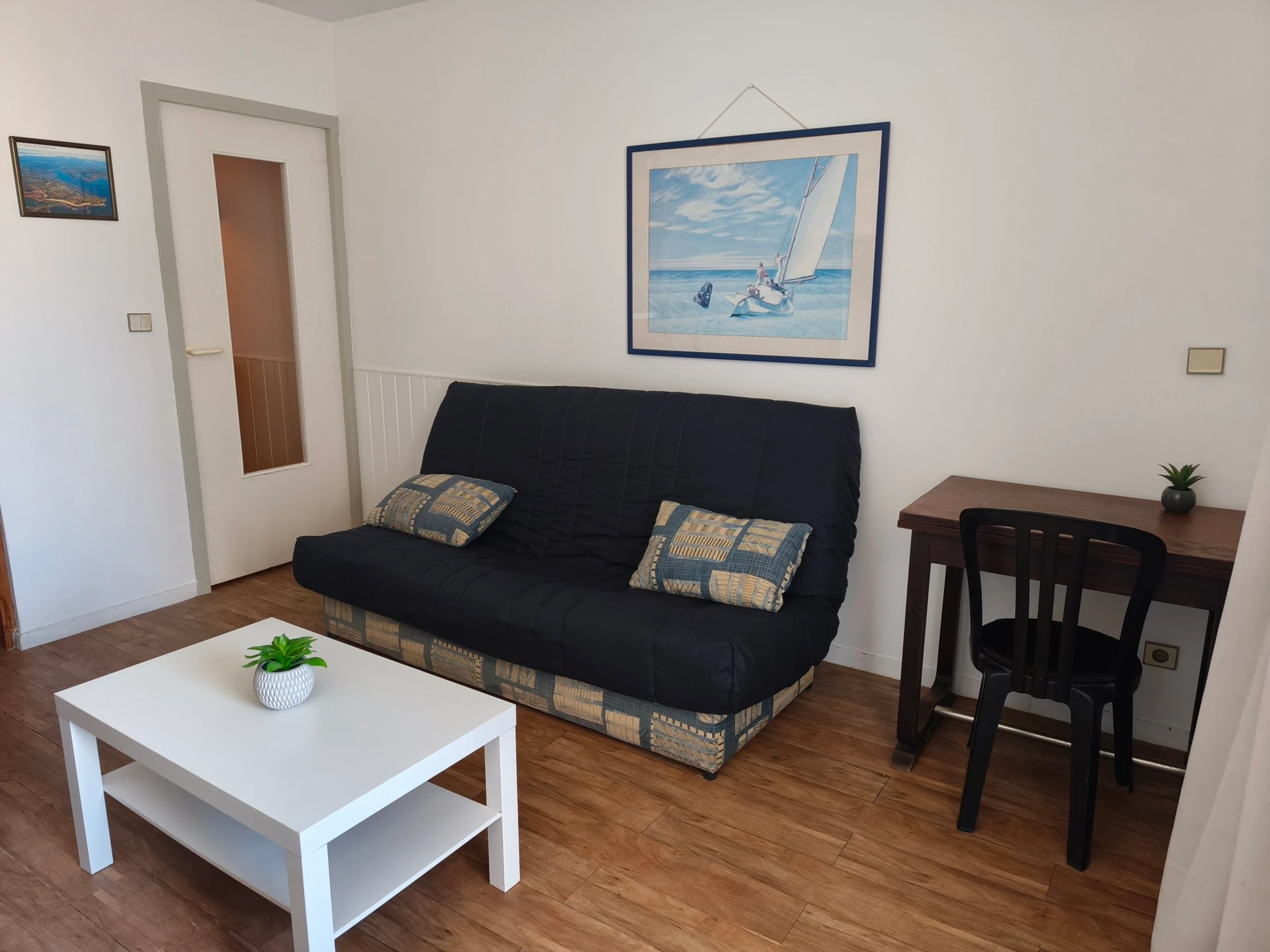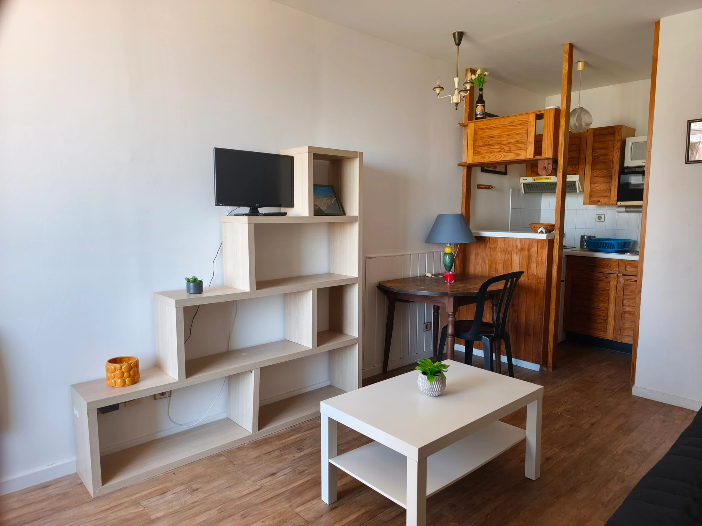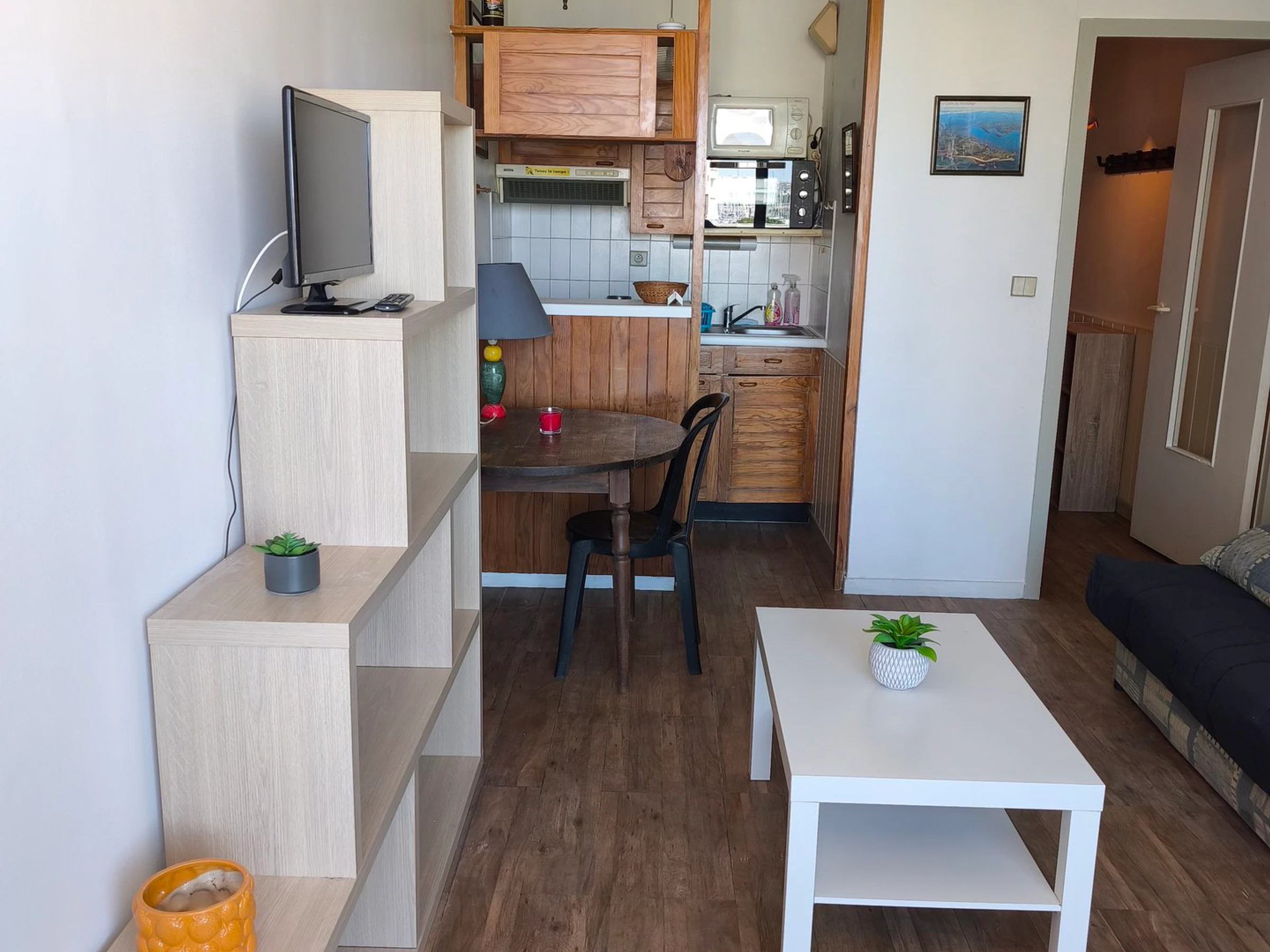 Studio apartment with sea view, located on the 1st floor with elevator, comprising: an entrance hall, living room with a 140cm sofa bed and desk area, equipped kitchenette (electric hob, extractor hood, oven), bathroom with toilet.