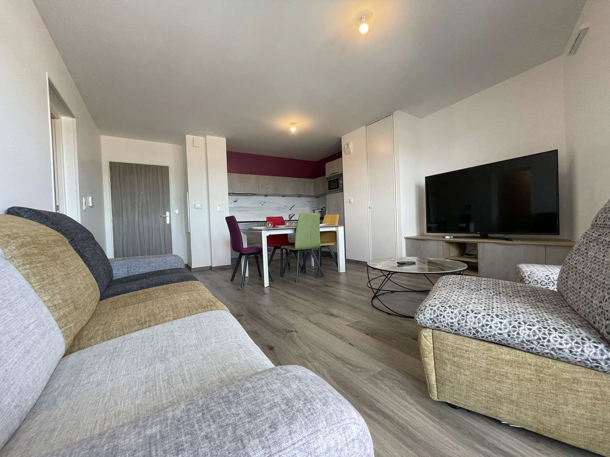 Ce beau logement équipé avec goût et fonctionnalité, tout le confort sera à votre porté de mains. Il se compose d'une entrée, d'un séjour avec cuisine intégralement équipée et aménagée (lave-vaisselle). Dans le séjour, un coin salle à manger et salon pour vous détendre et profiter de votre séjour. Egalement, deux chambres, disposant chacune d’un lit pour deux personnes en 140cm, d’une table de chevet avec lampe et d’un grand placard de rangements. Dans le couloir se trouve également une salle d’eau avec douche, vasque et miroir, ainsi qu’un WC séparé. Une terrasse de 20 m² orienté Est de quoi profiter du soleil dès le réveil.