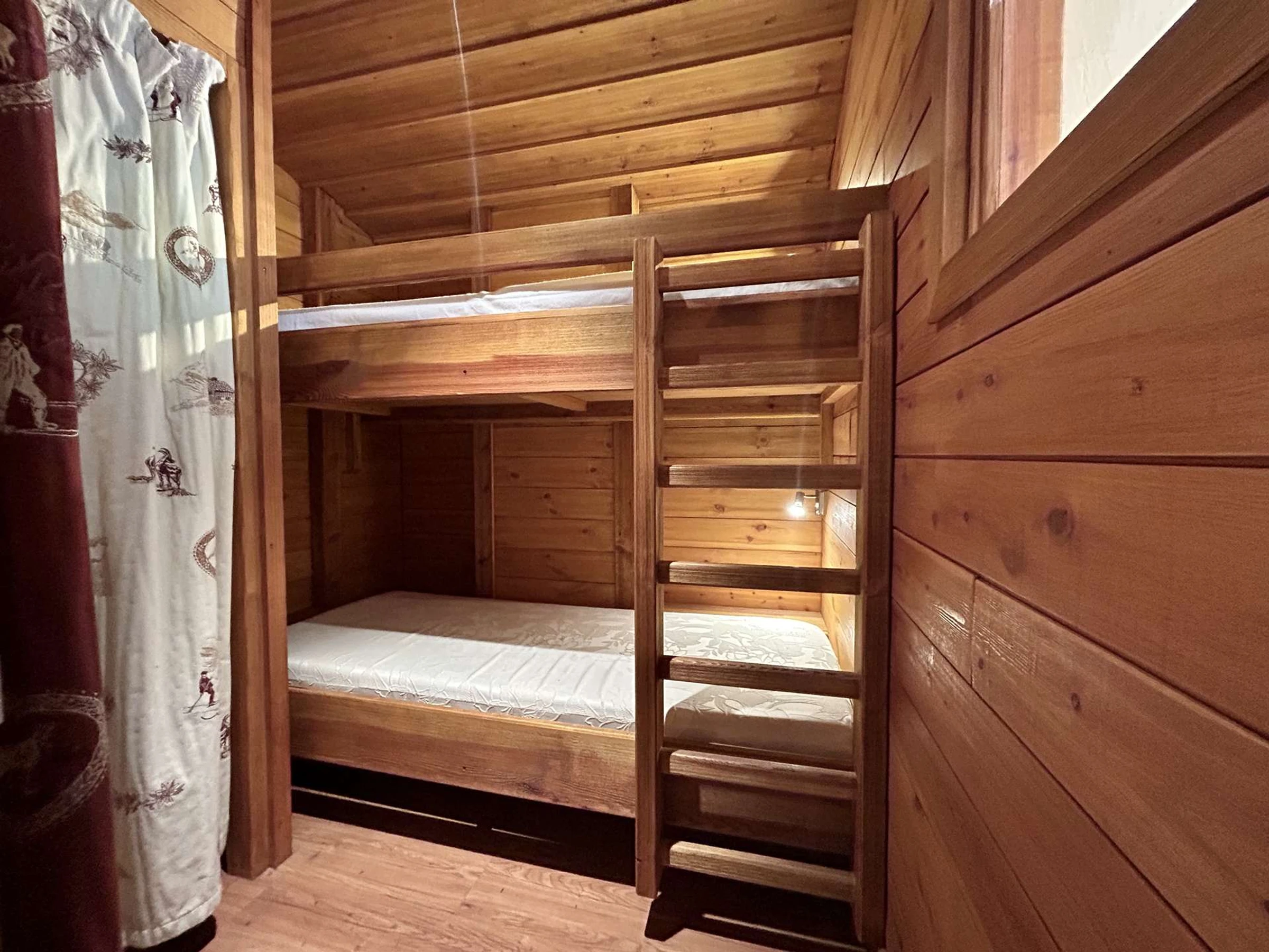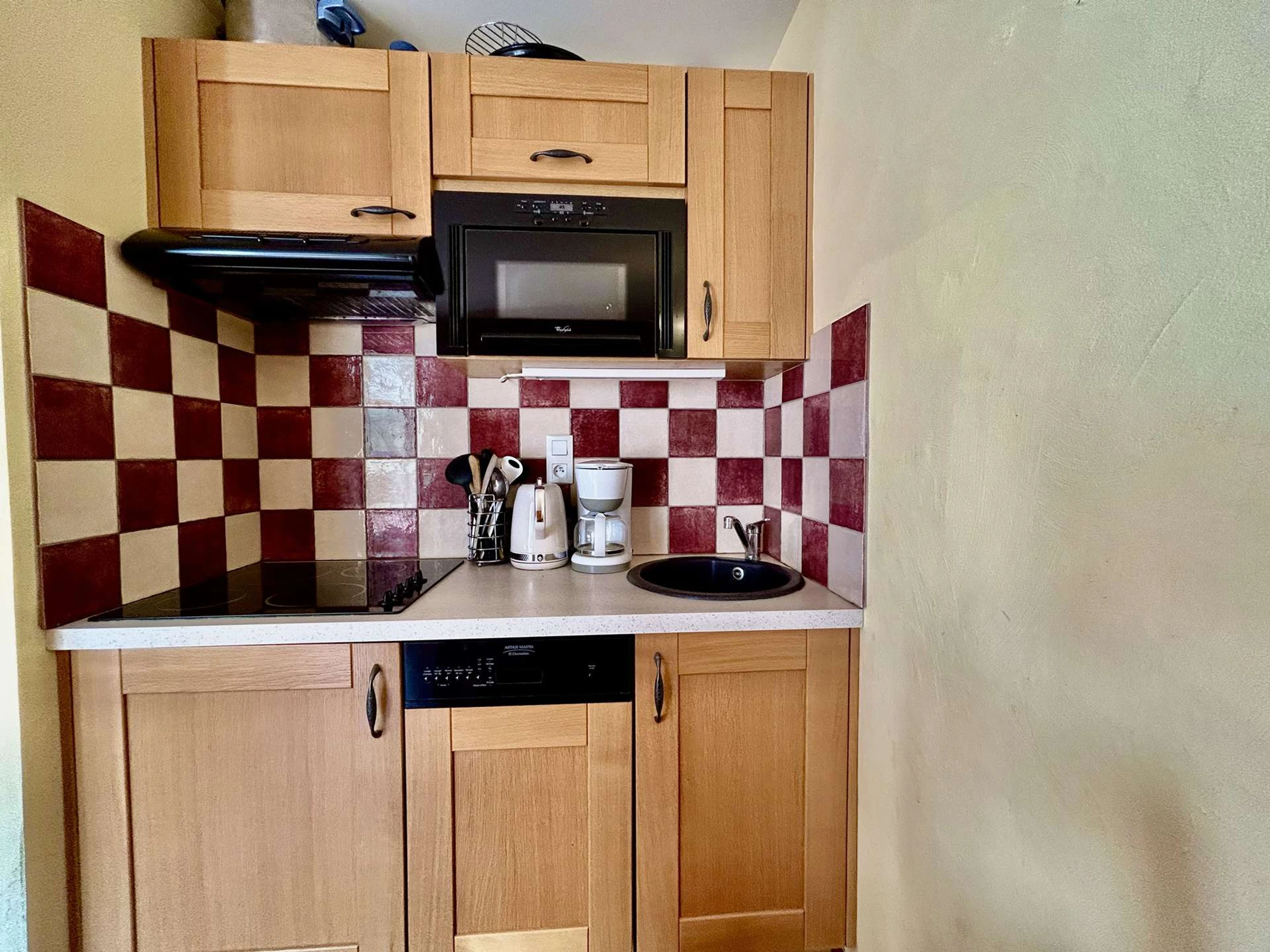 This charming studio consists of an entrance with storage, a shower room with wc, an alcove closed by curtains with bunk beds. The kitchen area is equipped with a fridge, ceramic hob, microwave and electric coffee maker. The living room includes a sofa bed for two people and gives access to a south-facing balcony.
