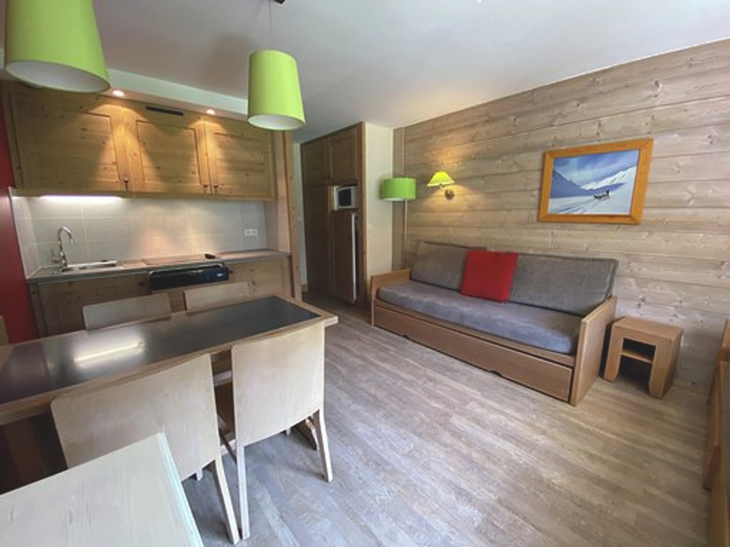 1 bedroom 35 sq-m apartment for 5 people on the third floor of a family's residence with lift. Balcony exposed south with view on the slope and the forest.