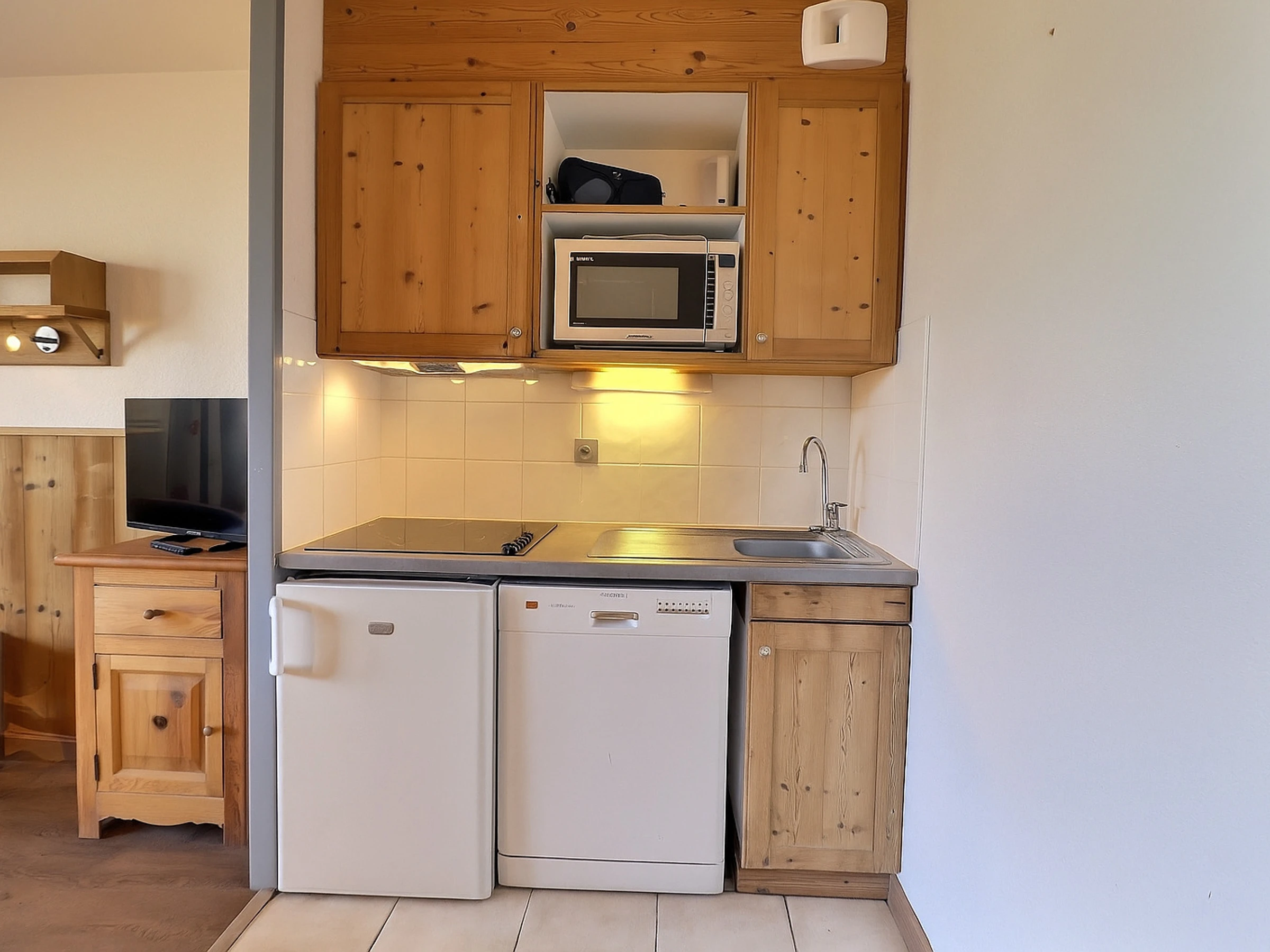 Kitchen corner: oven with micro-waves, fridge, dishwasher, 4 ceramic hobs, hood