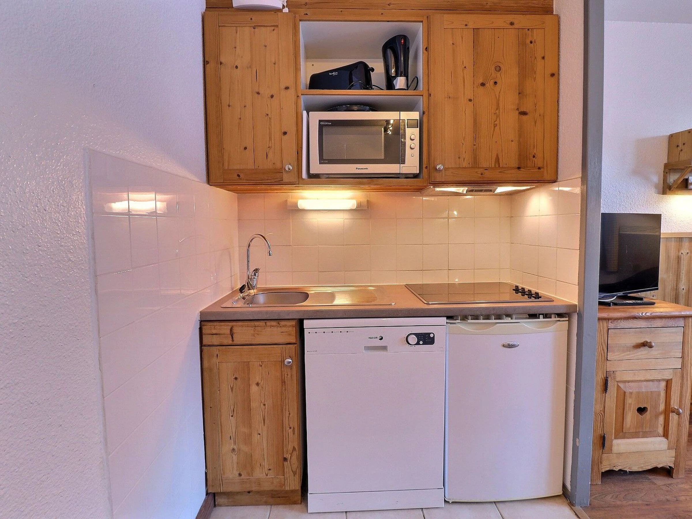 Kitchen corner: oven with micro-waves, fridge, dishwasher, 4 ceramic hobs, hood, normal coffee machine