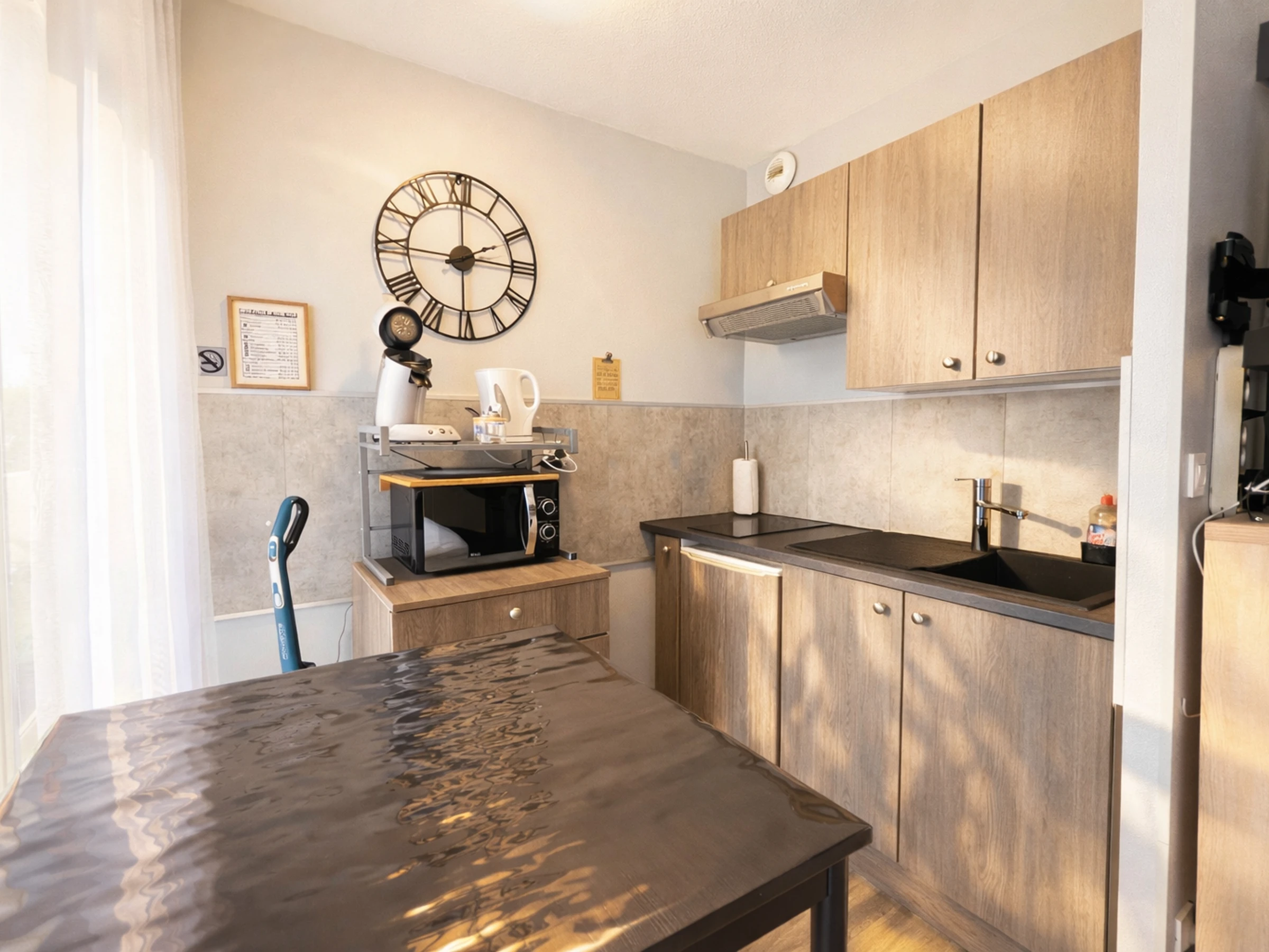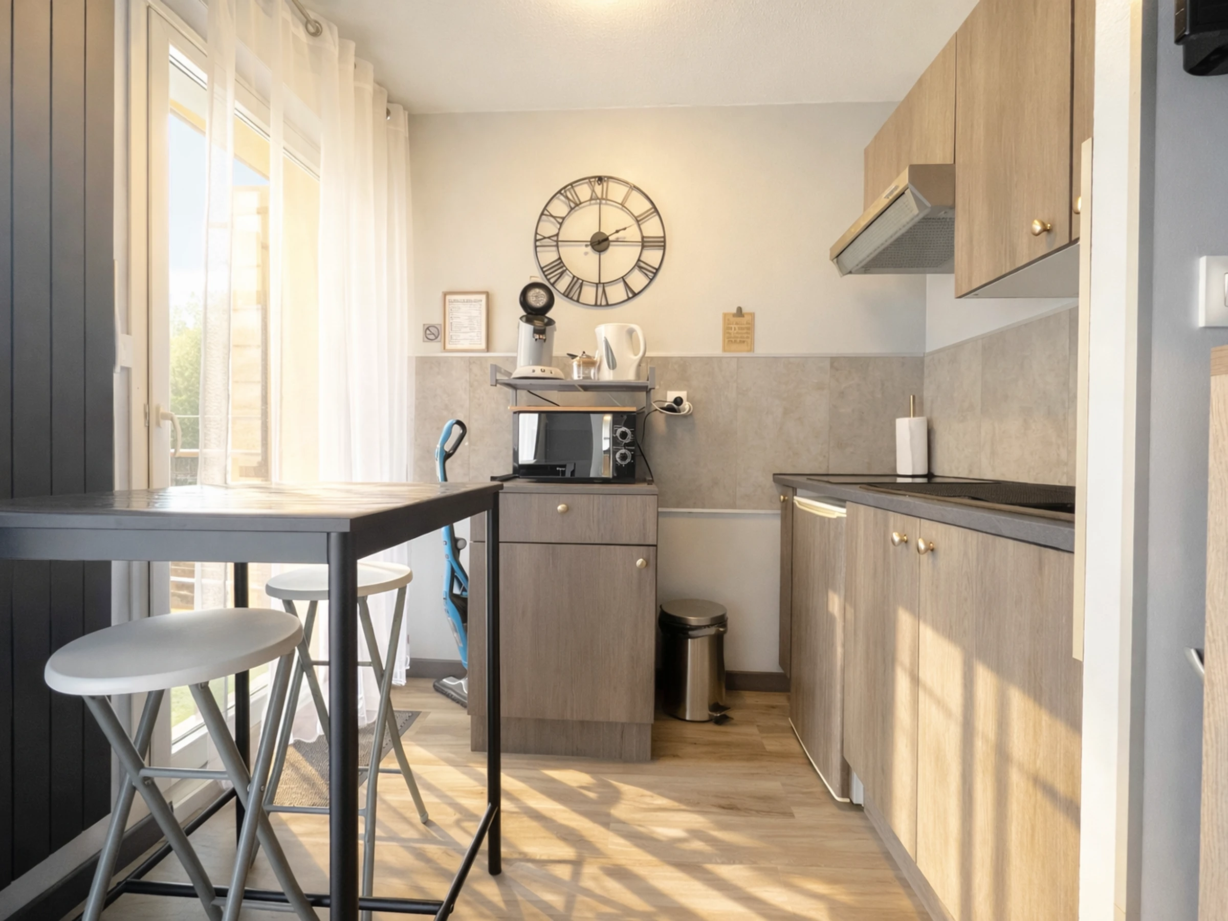 The fully equipped kitchenette includes a stovetop, a microwave/grill oven, a refrigerator, a kettle, and a Senseo coffee machine, allowing for complete independence during your stay.