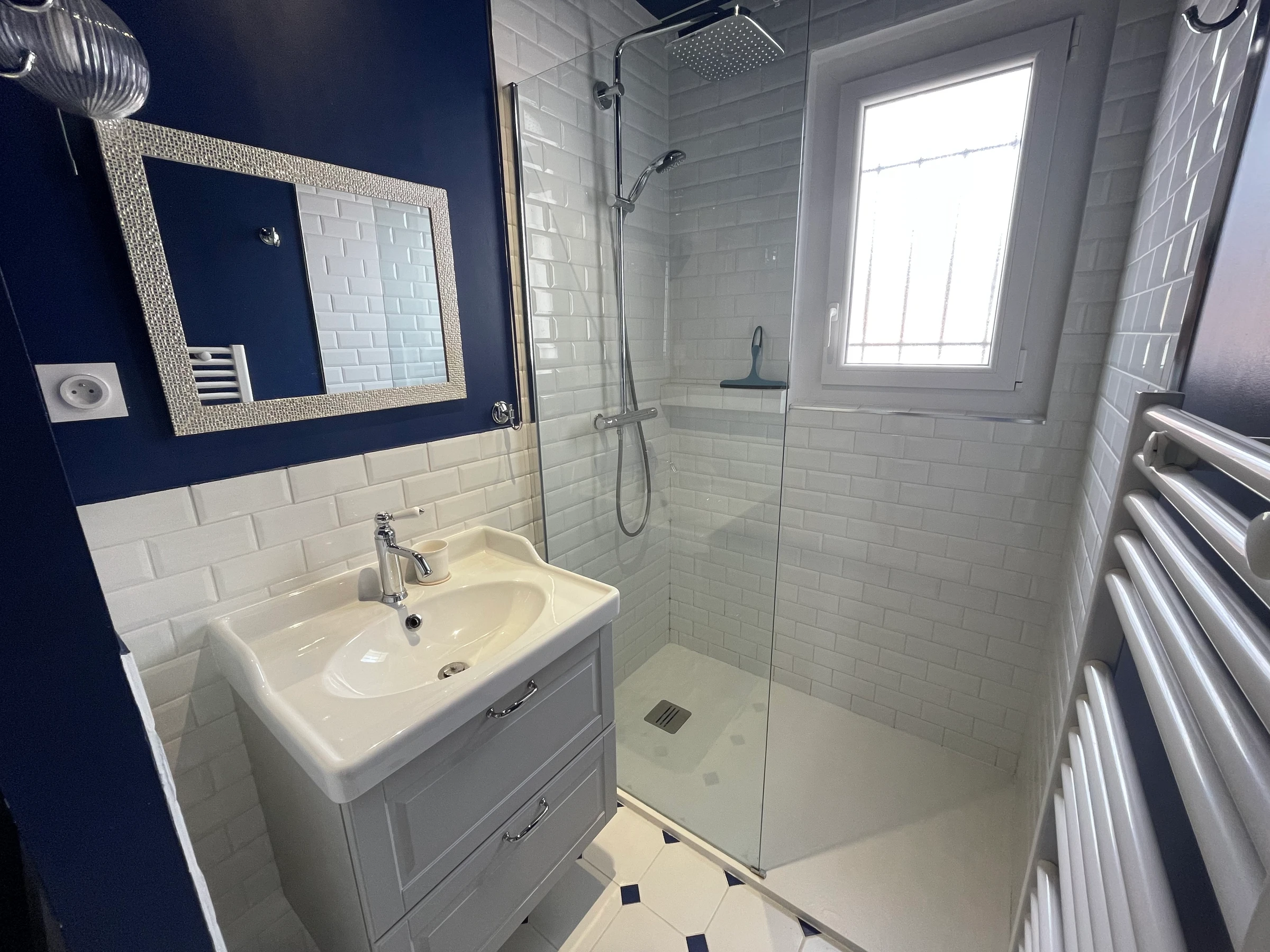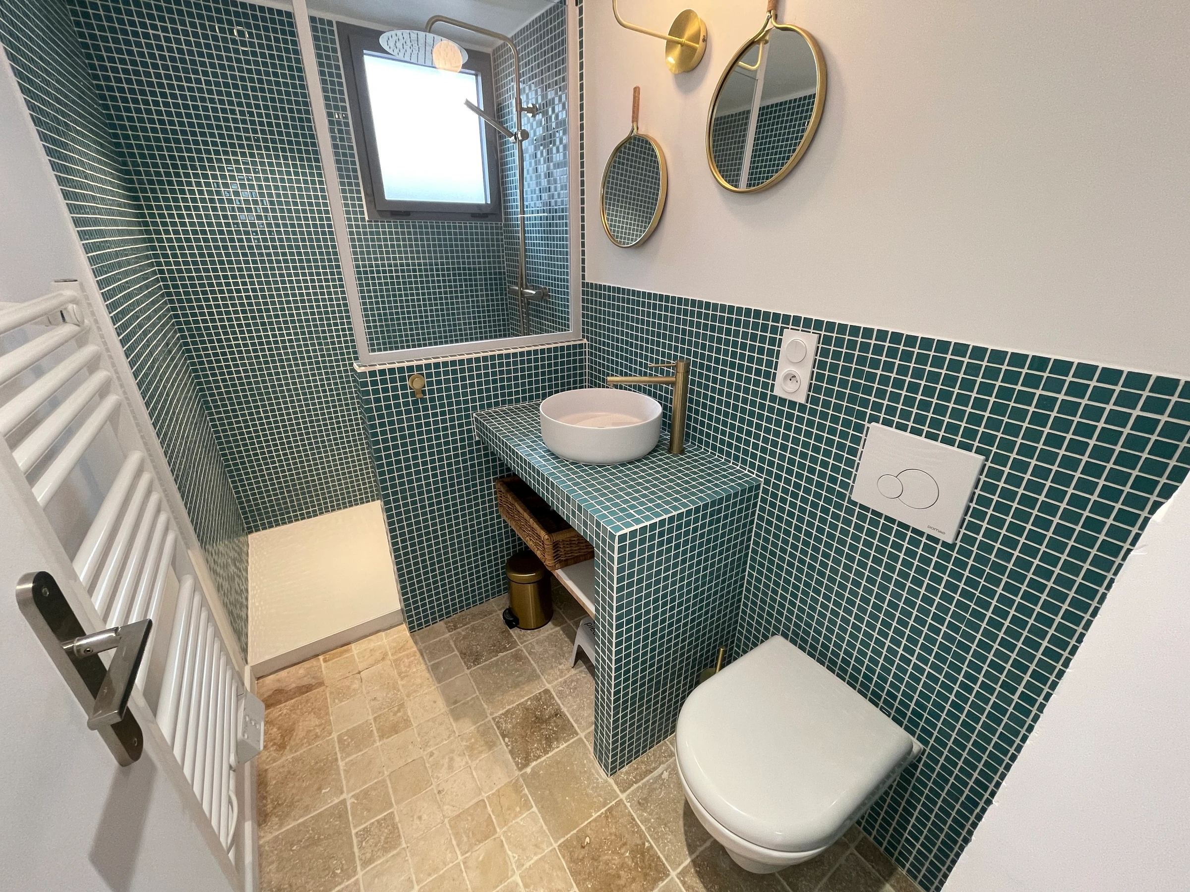 Garden level (street side): open kitchen-living room with lounge, 1 bedroom with 1 queen-size bed, 1 bedroom with 2 single beds, 1 toilet, 1 shower room (sink, shower). Via an internal staircase, Garden level (courtyard side): 1 bedroom with 1 queen-size bed, 1 bedroom with 2 single beds, 1 bedroom with 1 queen-size bed. 1 living room-kitchen opening onto a terrace, shower room with toilet.