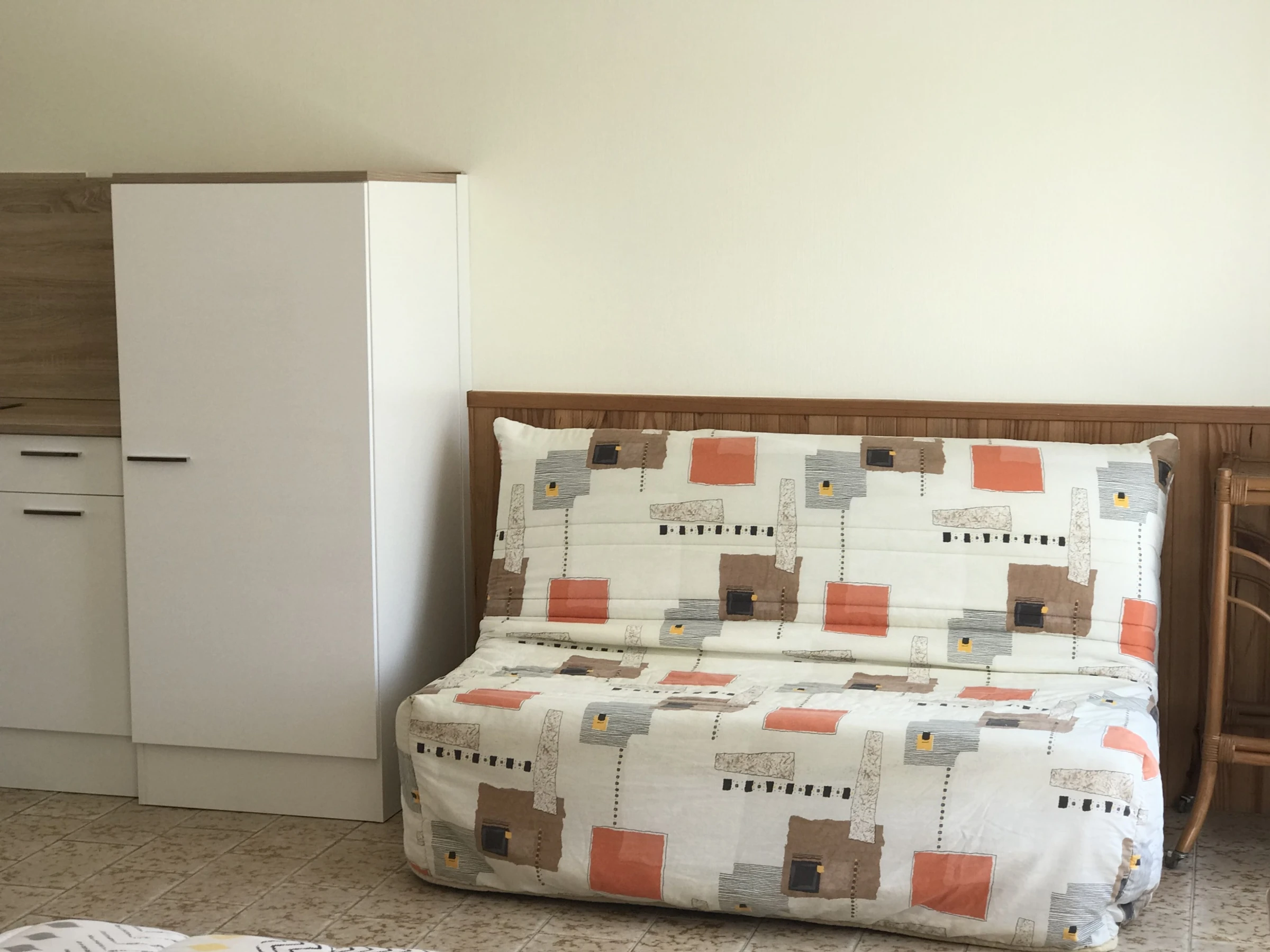A welcoming living area includes a lounge furnished with two beds (one double bed 140 cm and one single bed 80 cm), a sofa, and a functional kitchenette.