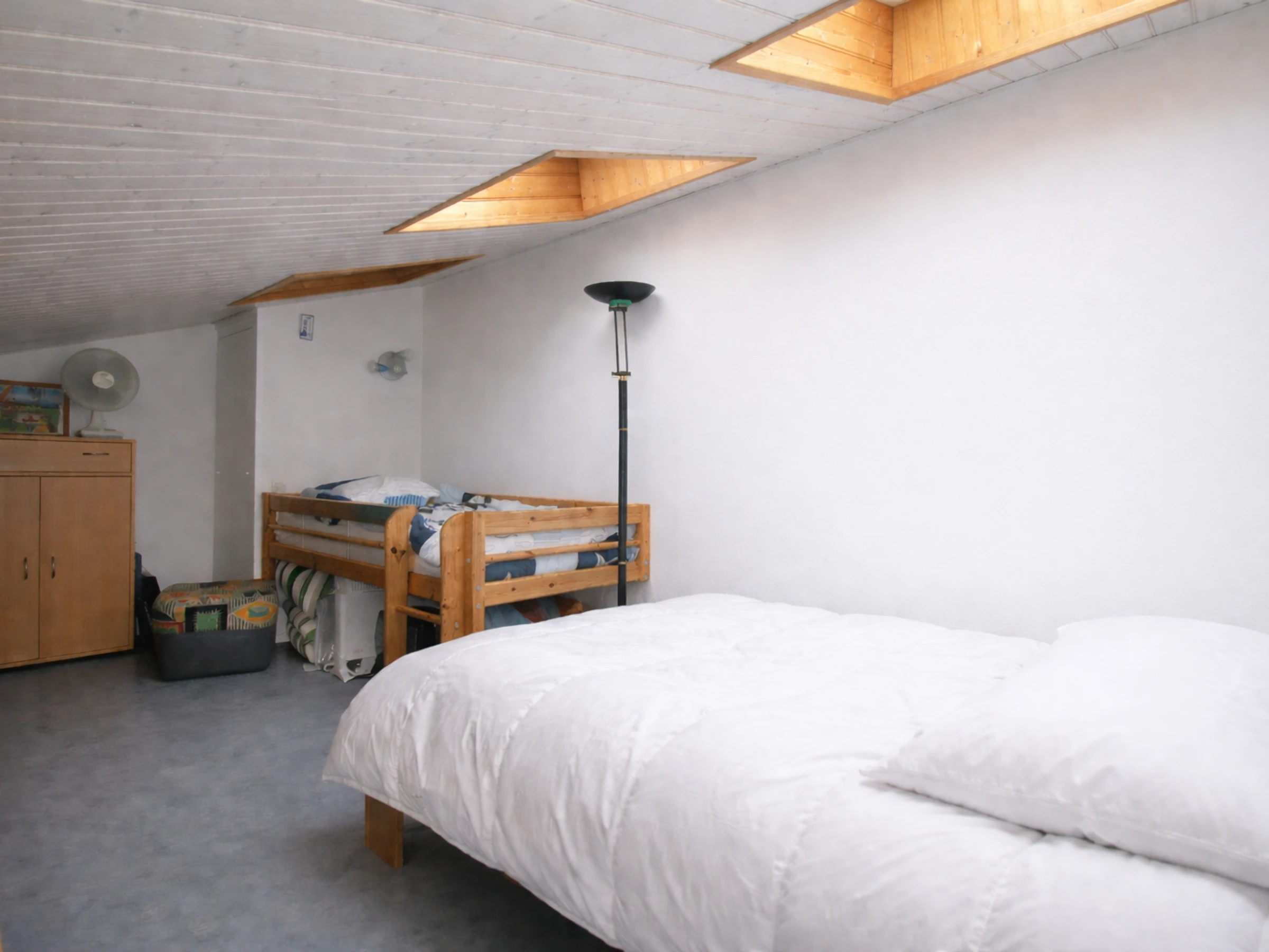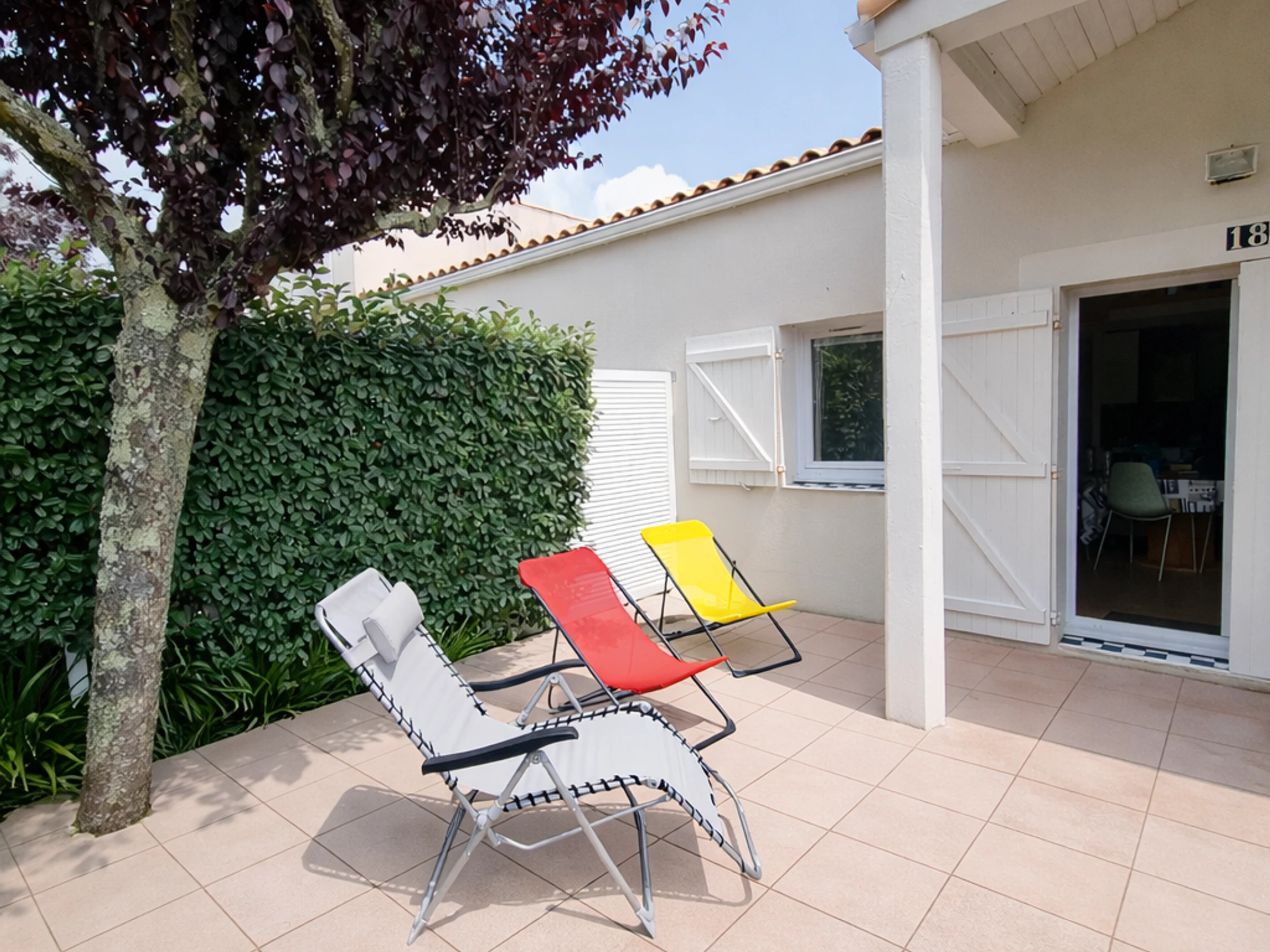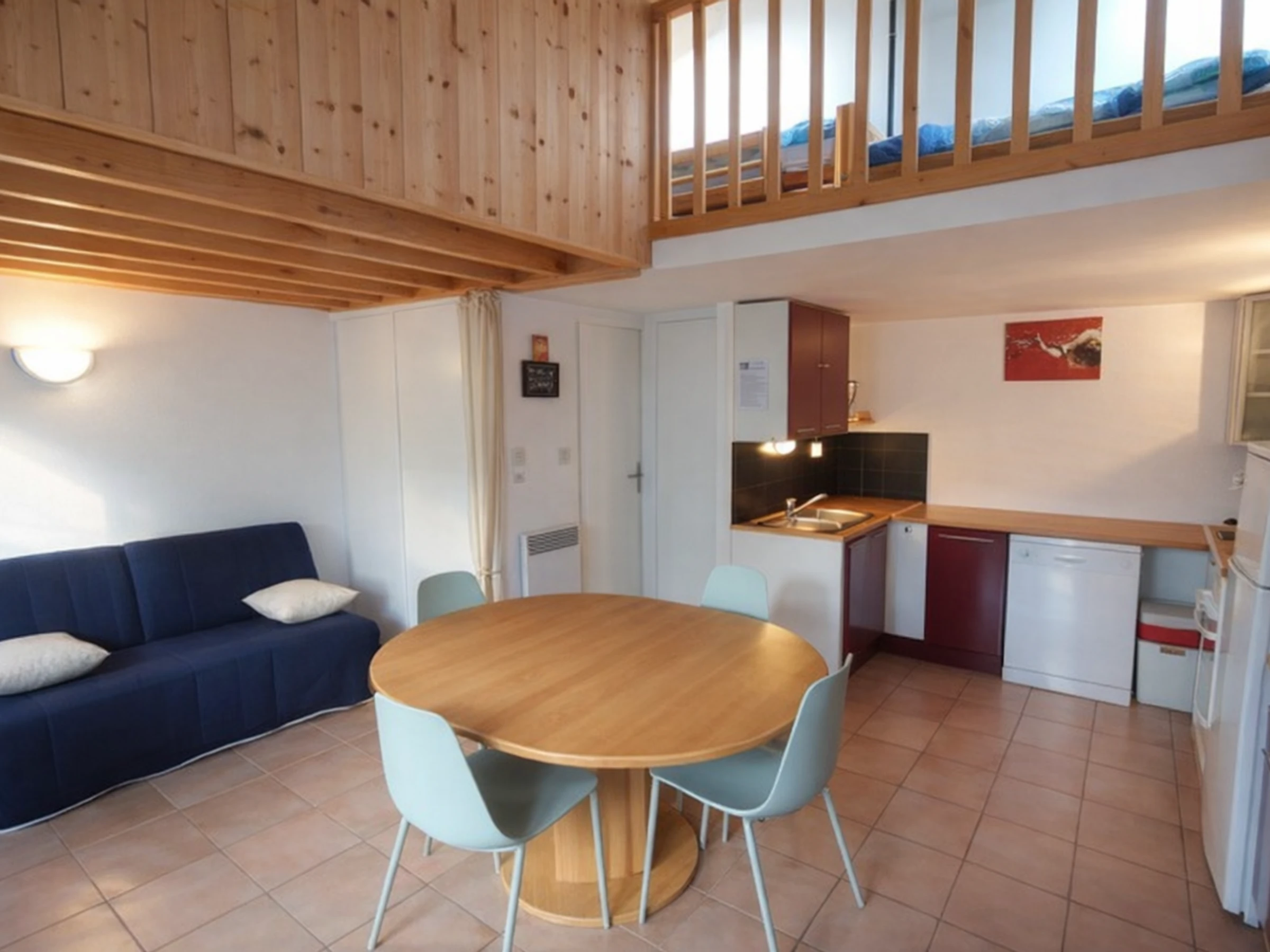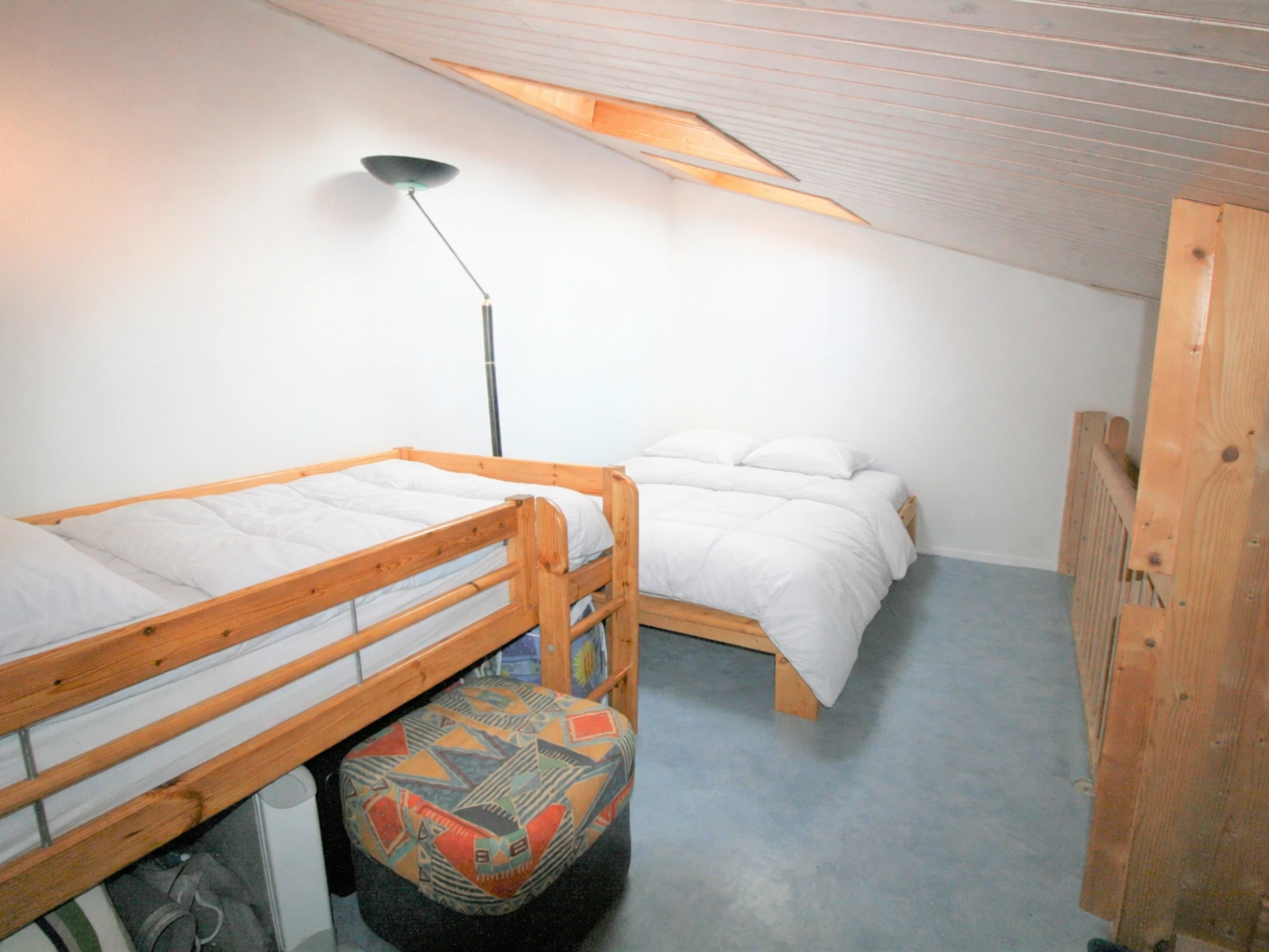 Charming house in a holiday residence with a swimming pool (open July and August) and a parking space. The interior is pleasant and well-decorated. The living room opens onto a terrace with garden furniture, a kitchenette, a shower room (shower, sink), and a toilet. Upstairs: a mezzanine (ceiling height less than 1.80m) with three skylights: one double bed (140cm), two single bunk beds, and one single bed (90cm).