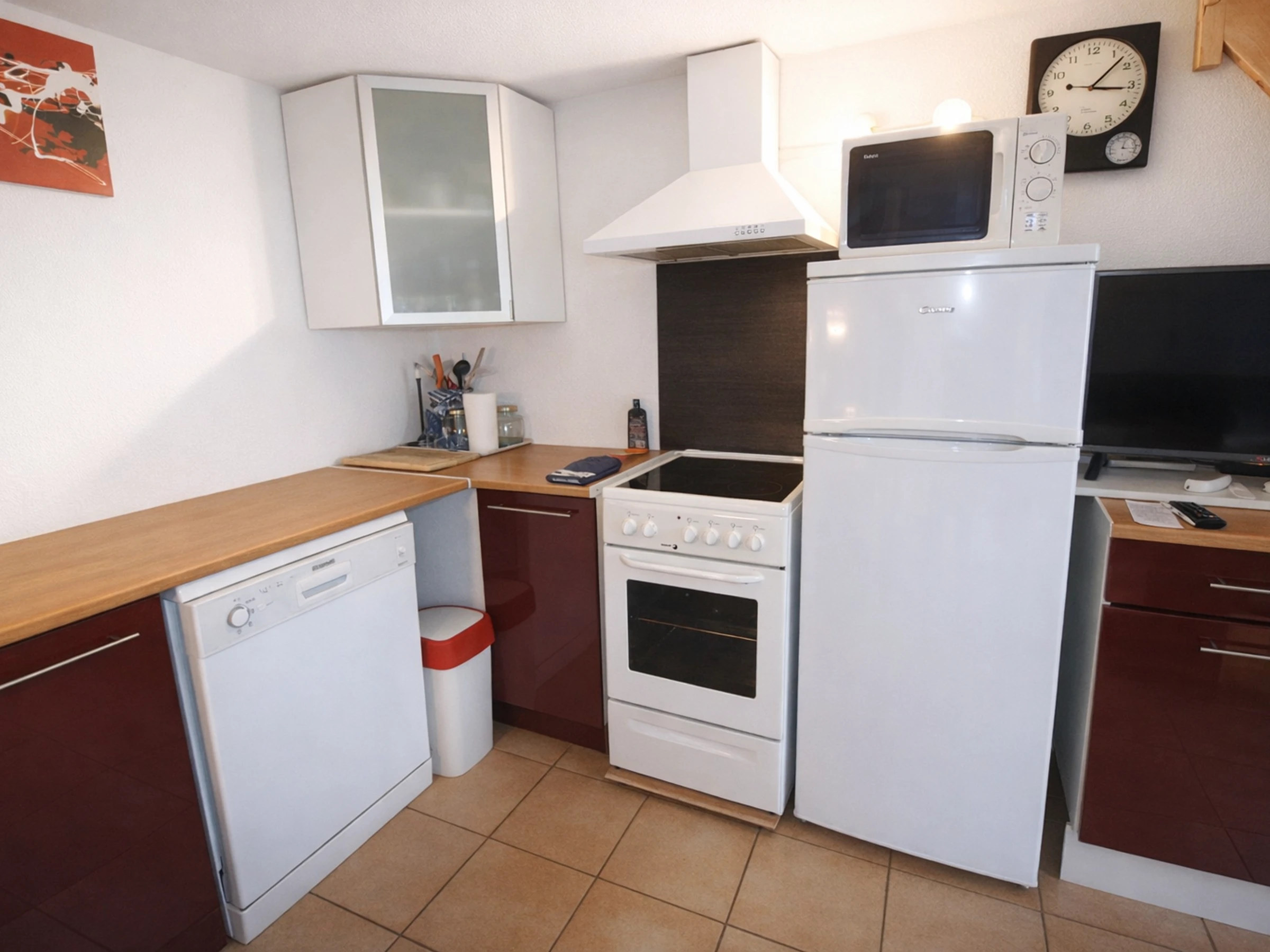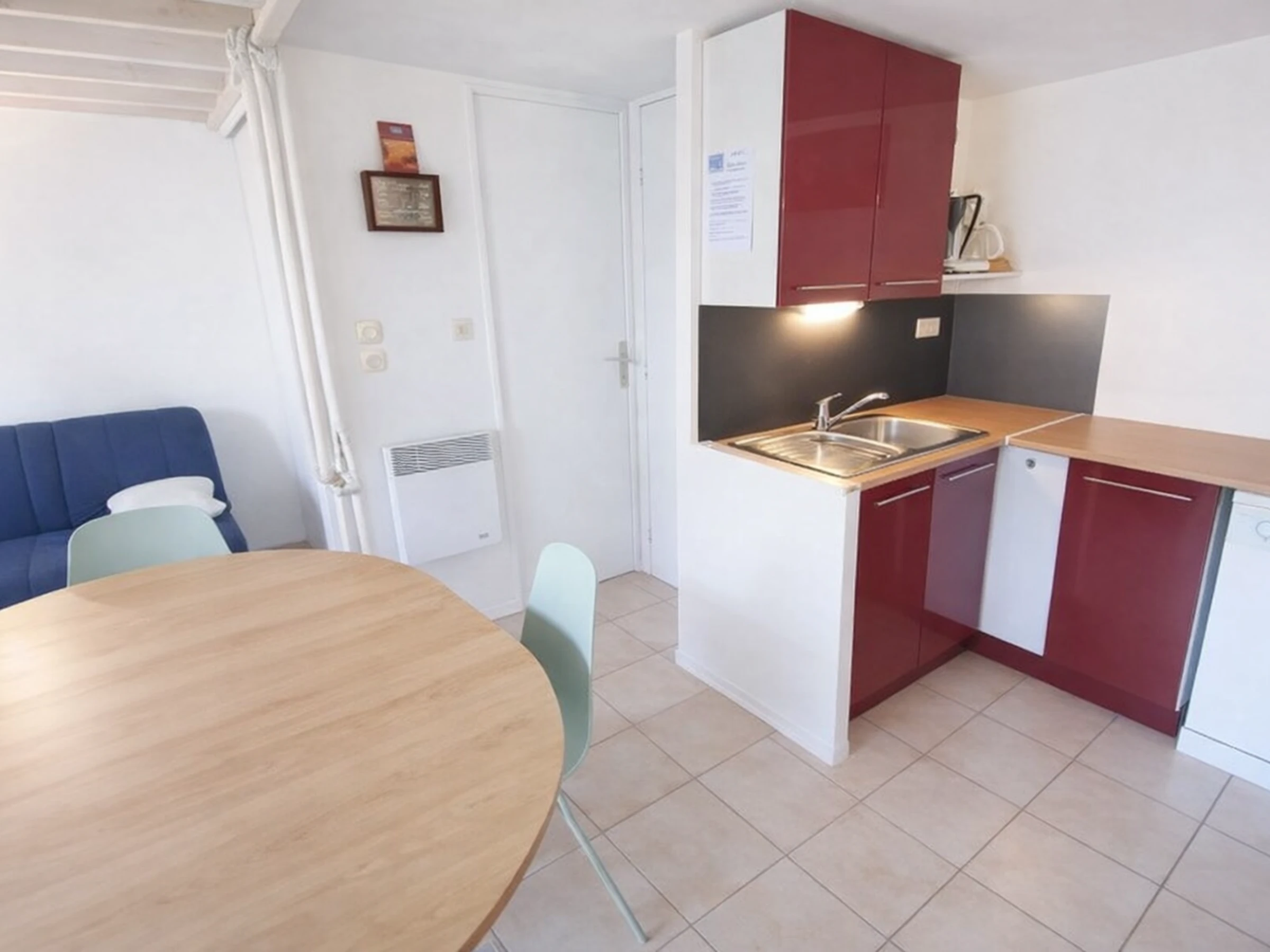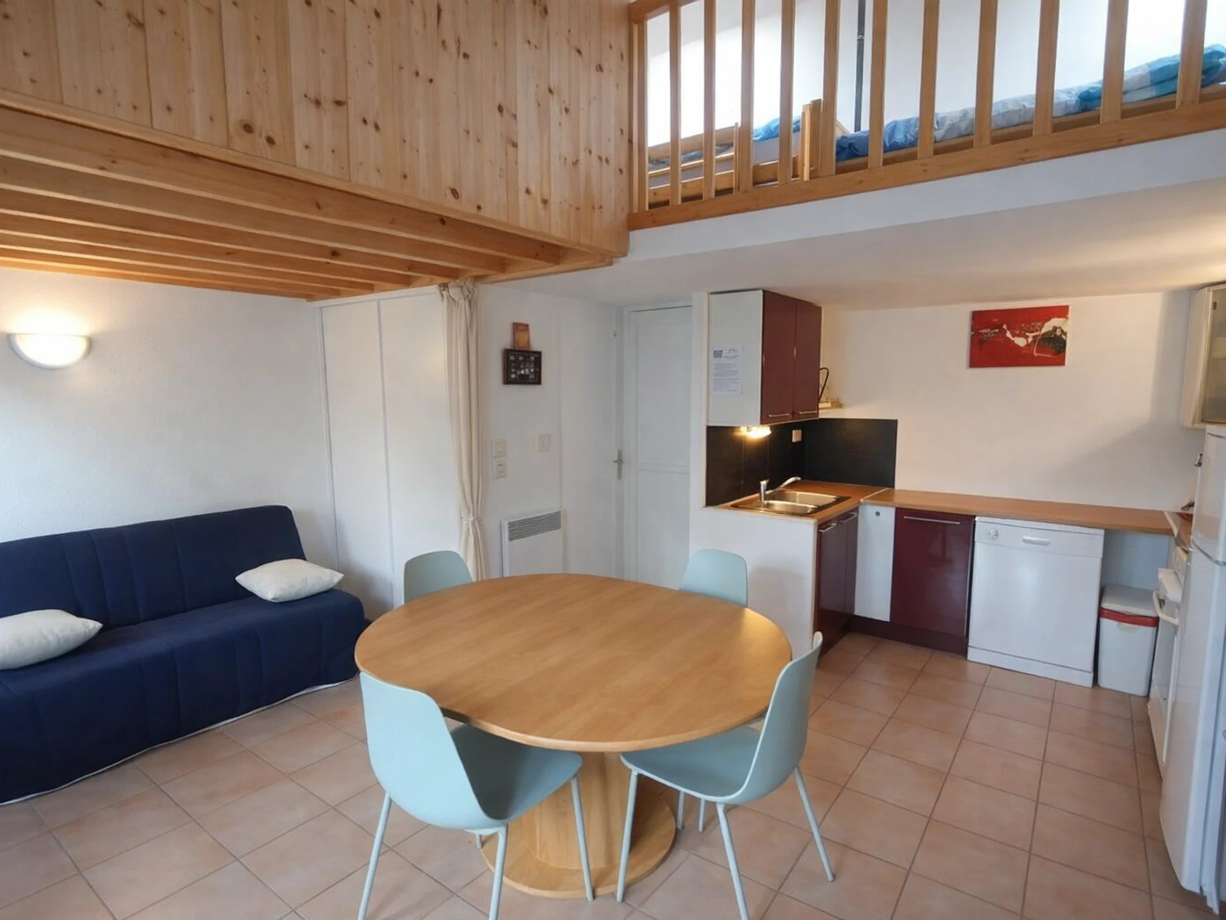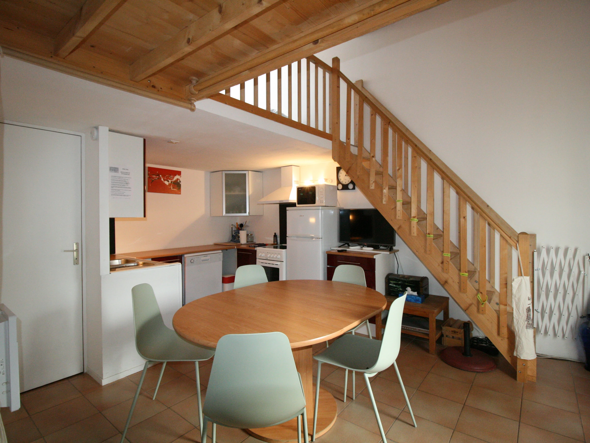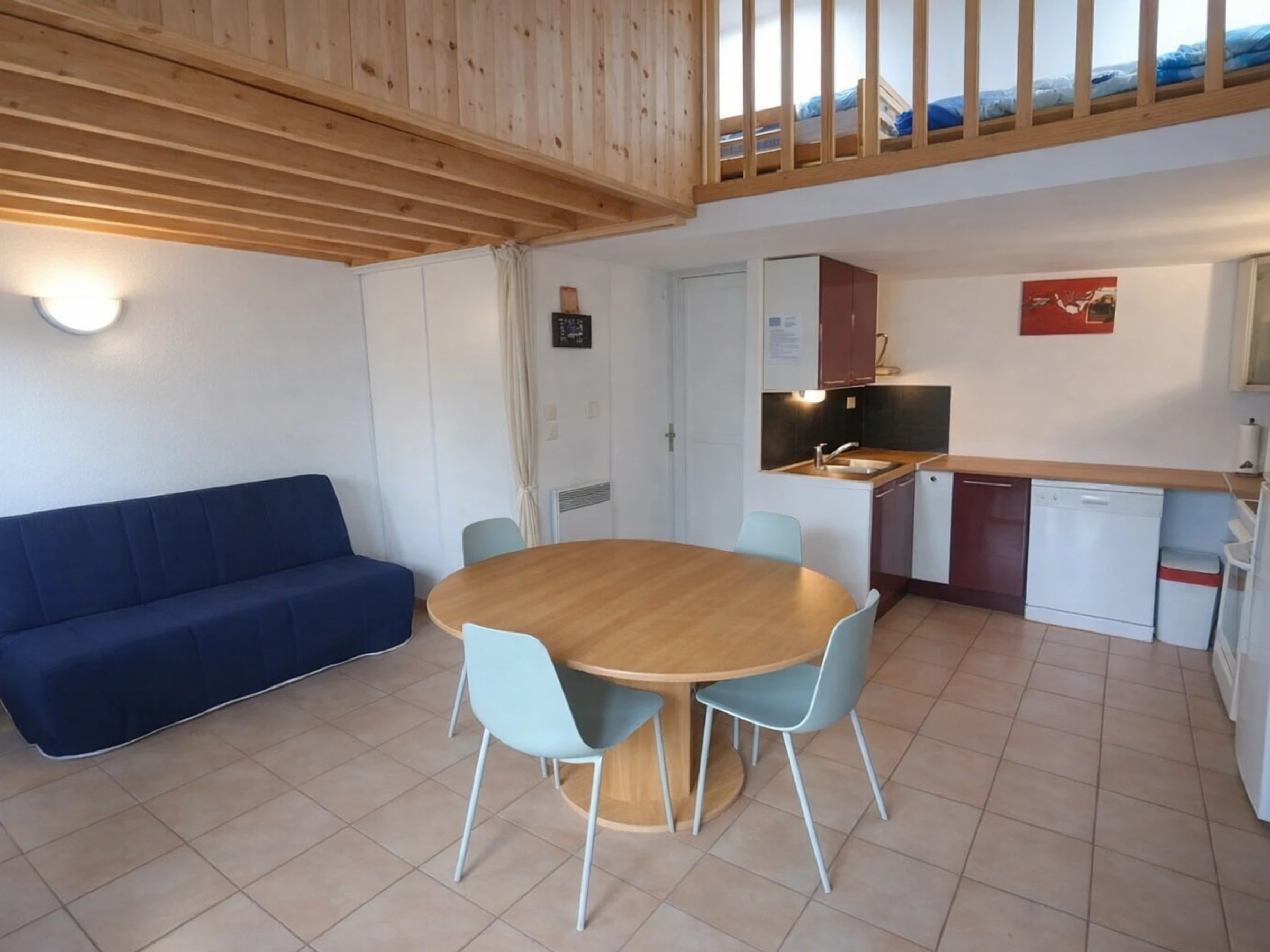 Charming house in a holiday residence with a swimming pool (open July and August) and a parking space. The interior is pleasant and well-decorated. The living room opens onto a terrace with garden furniture, a kitchenette, a shower room (shower, sink), and a toilet. Upstairs: a mezzanine (ceiling height less than 1.80m) with three skylights: one double bed (140cm), two single bunk beds, and one single bed (90cm).