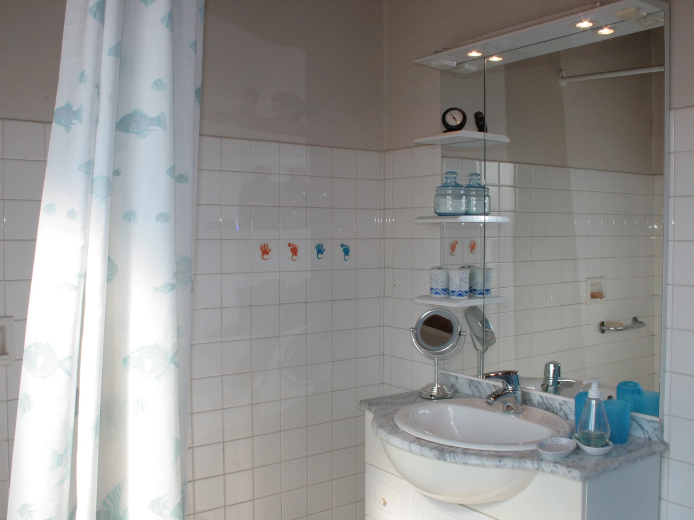 Upstairs: 1 bedroom with two single beds (90 cm), 1 bedroom with a double bed, 1 bedroom with a double bed, and 1 bathroom (shower, sink).