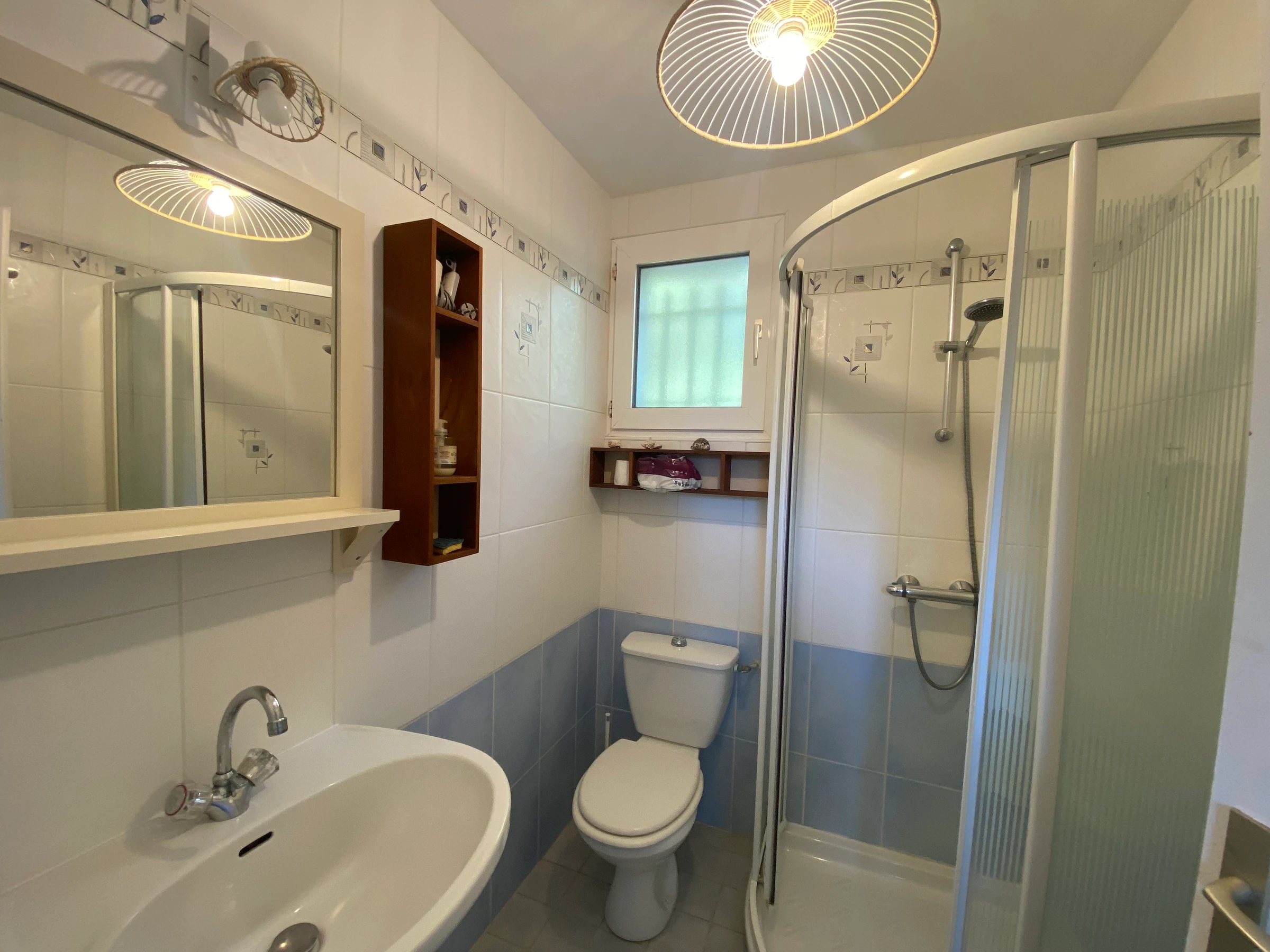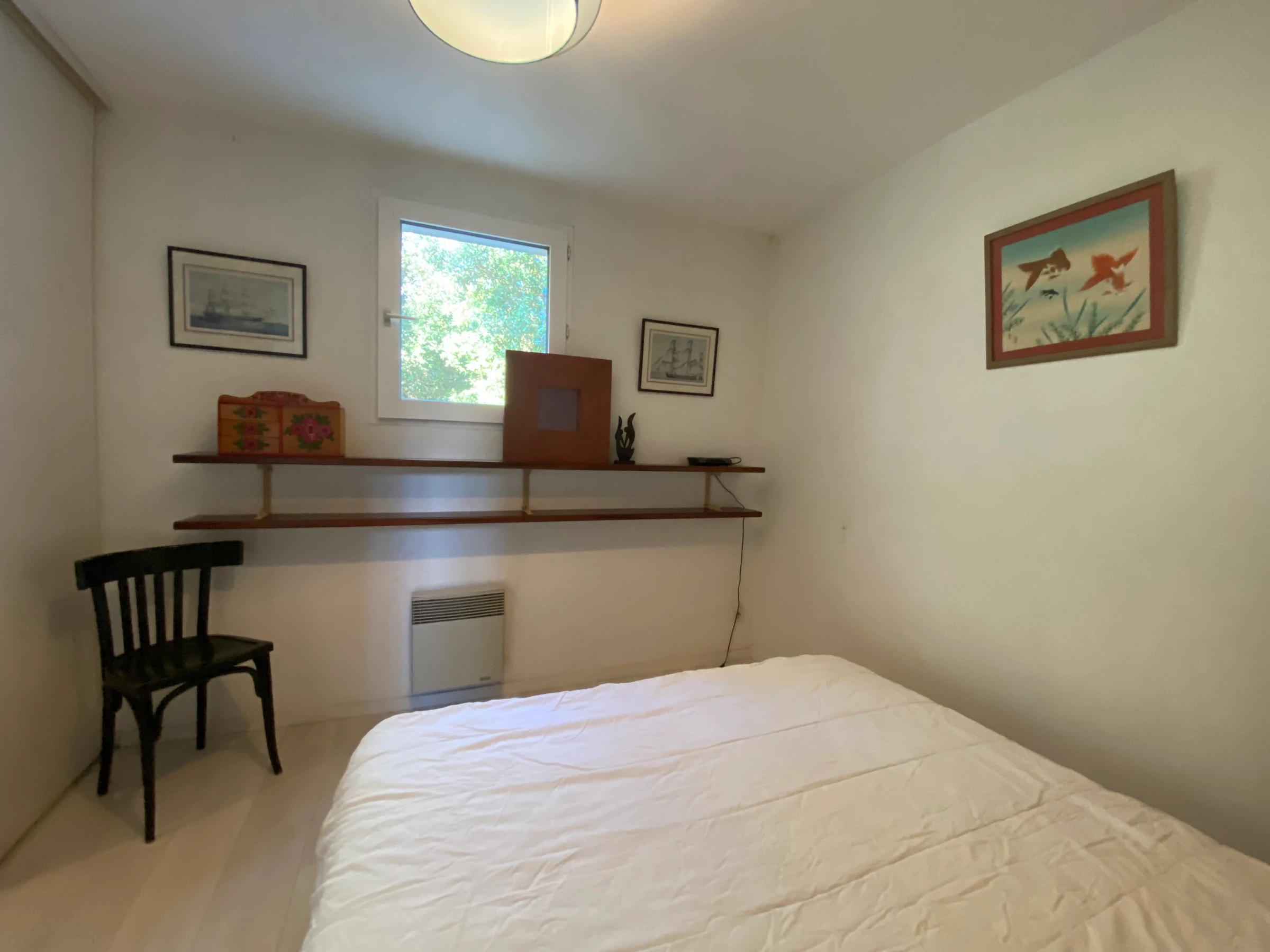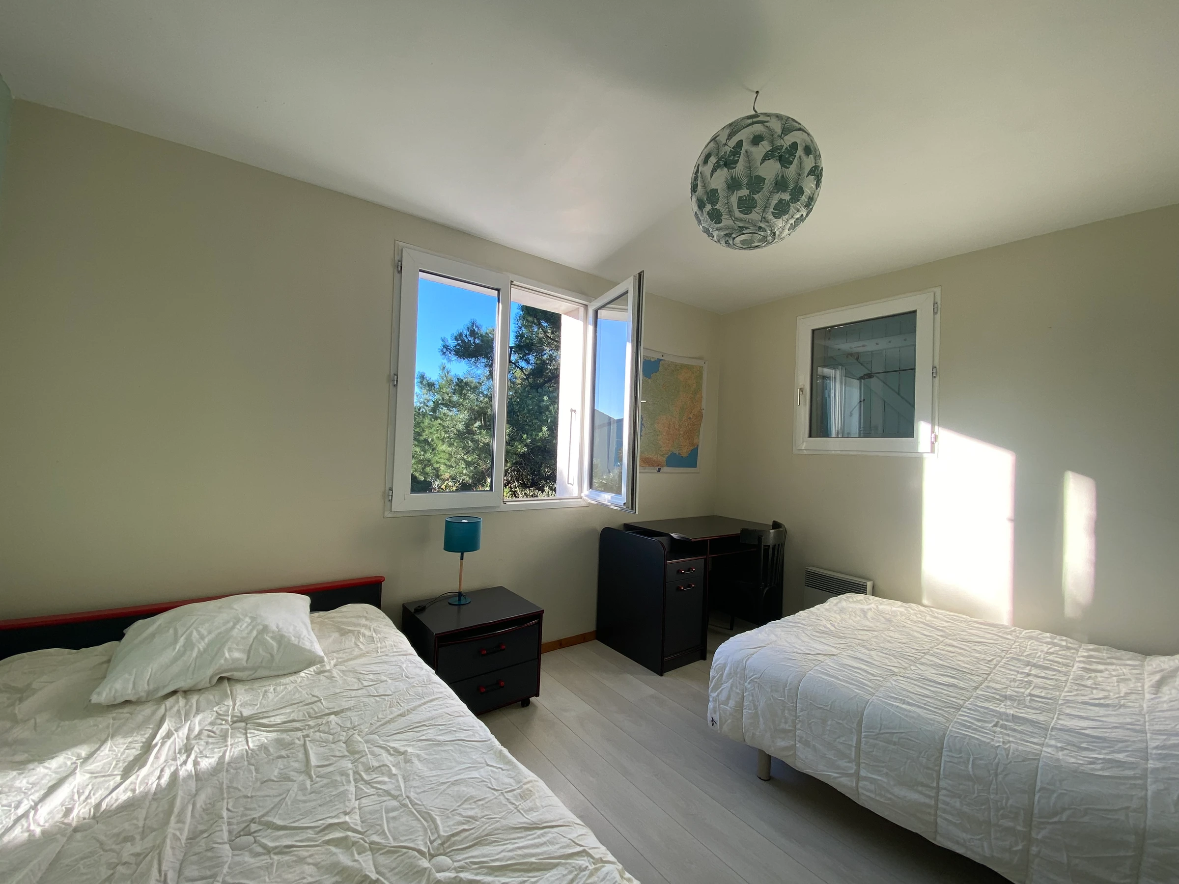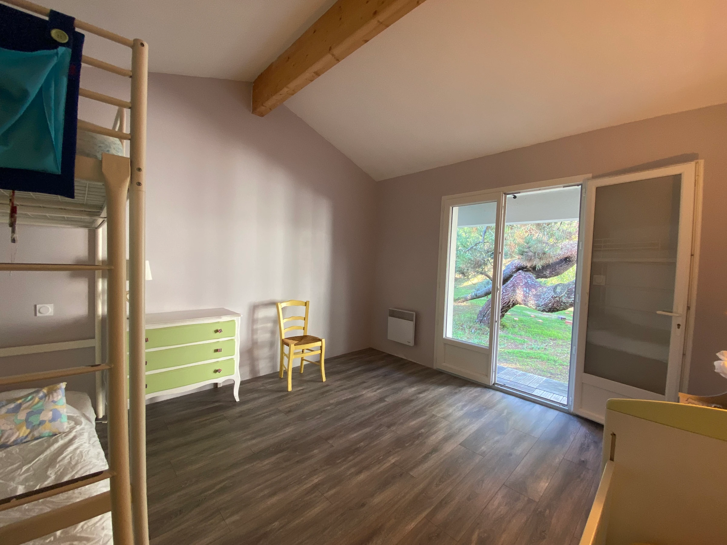 Ground floor: bright living room/kitchen area facing south, large French doors opening onto a shaded terrace with outdoor furniture. Two adjoining bedrooms, each with access to the terrace: one bedroom with a bunk bed (140 cm), one bedroom with a single bed (140 cm), one bathroom with a bathtub and sink, and a separate toilet.