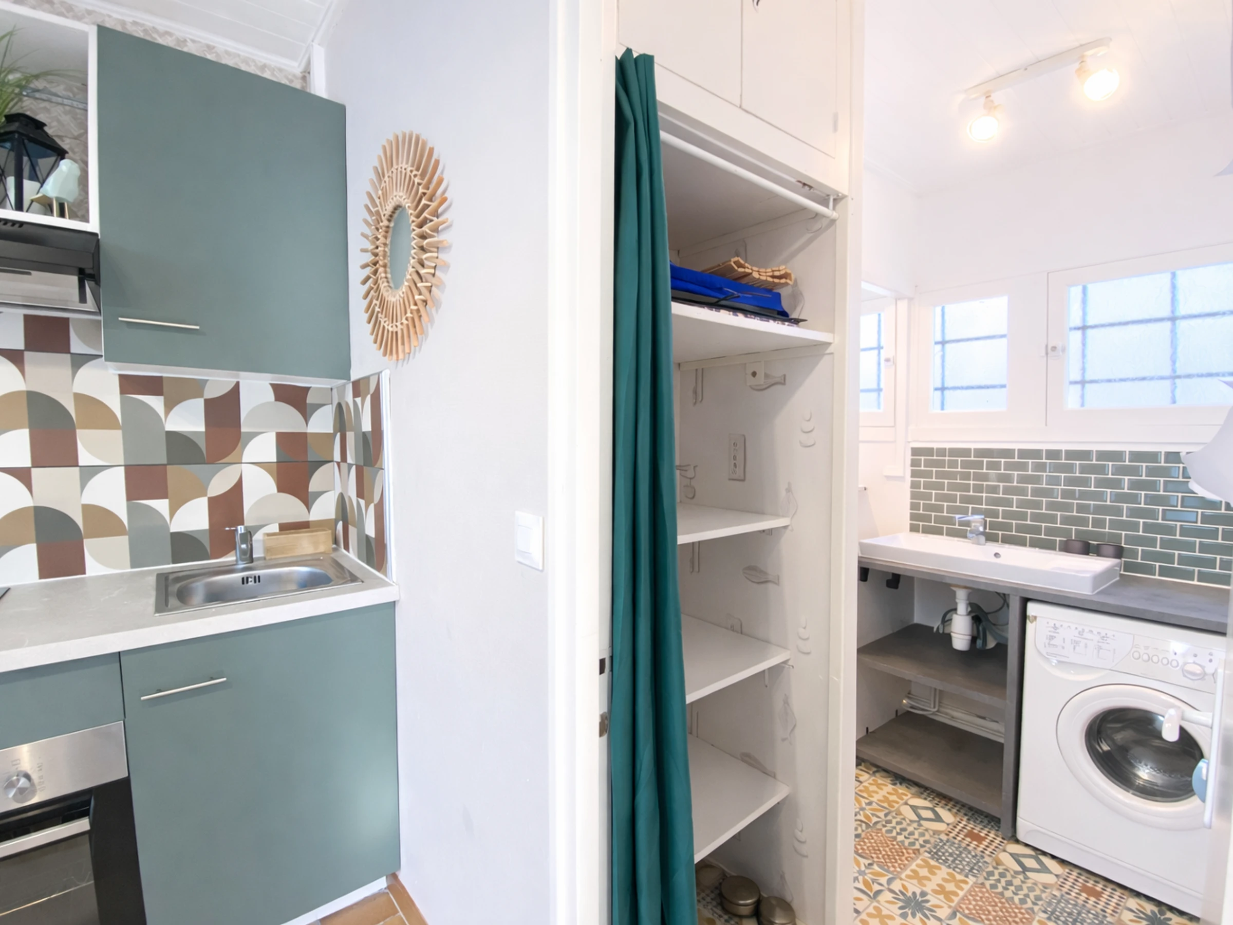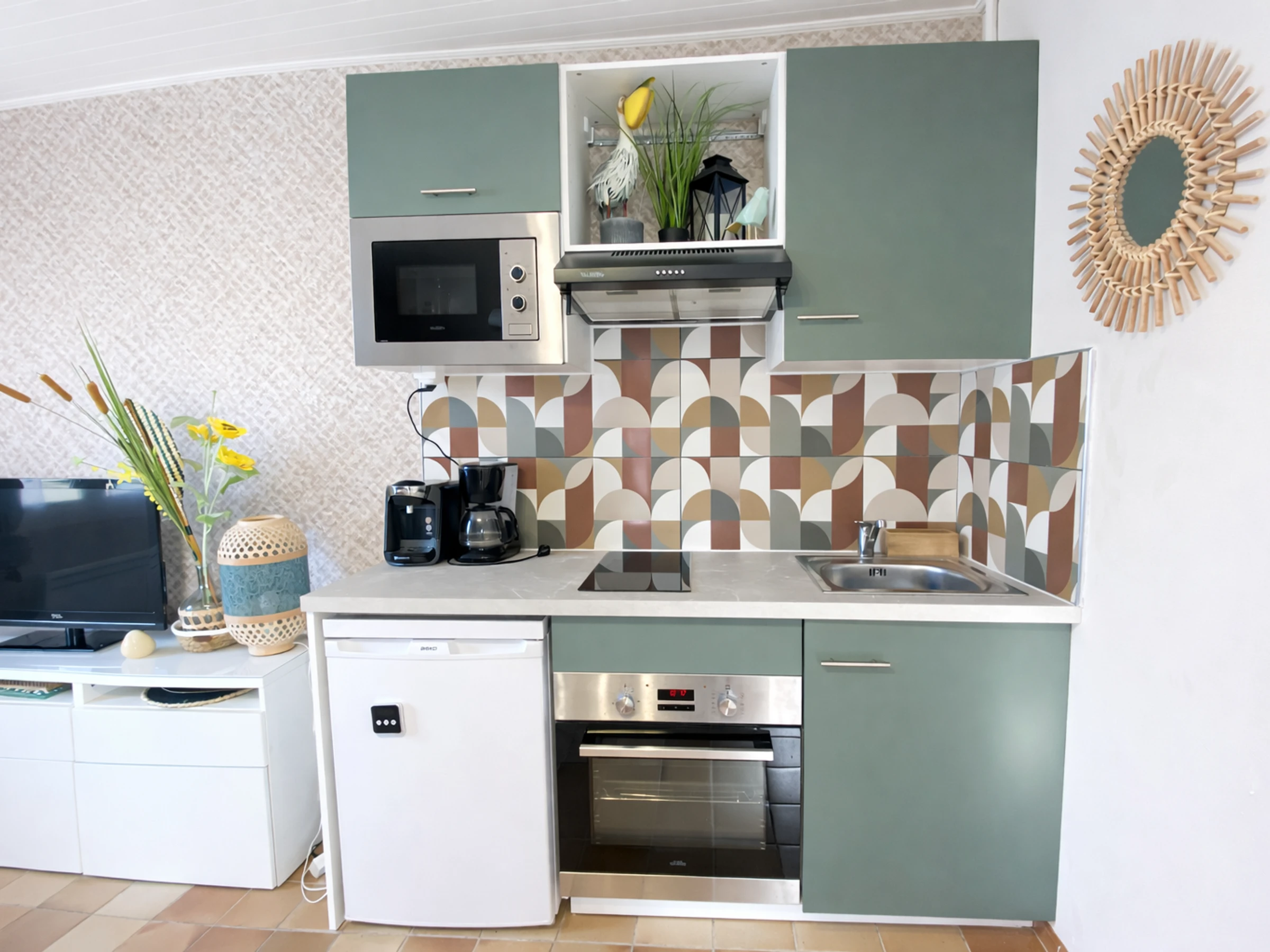 Composition; 1 sofa bed for 2 people, 1 washing machine, 1 microwave, 1 electric oven, 1 induction hob, 1 refrigerator, electric coffee maker, crockery and cutlery, television,