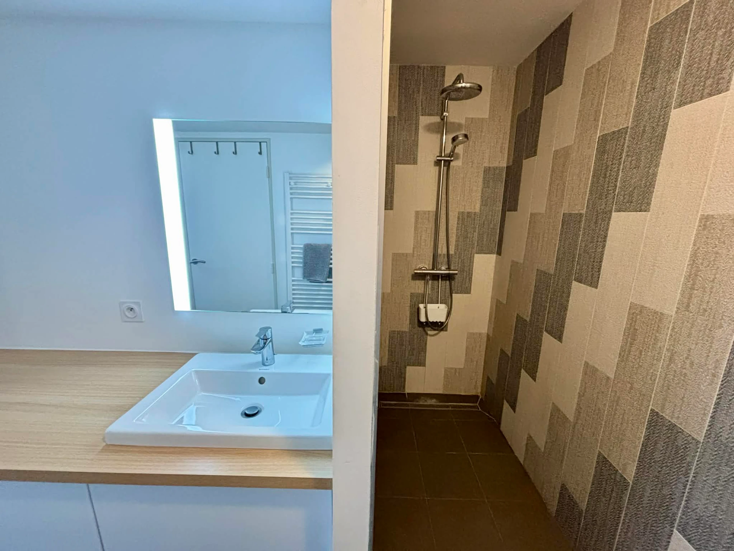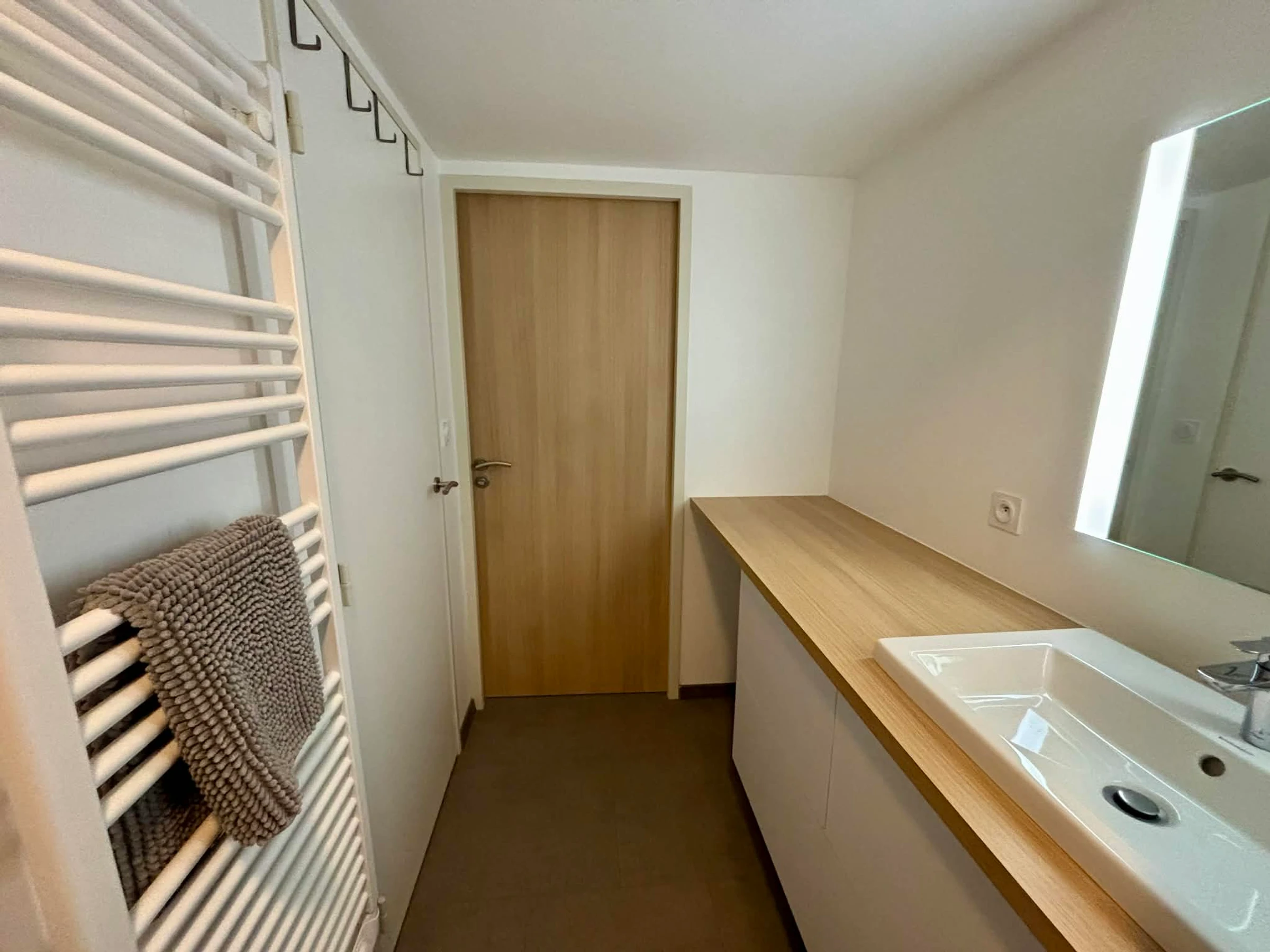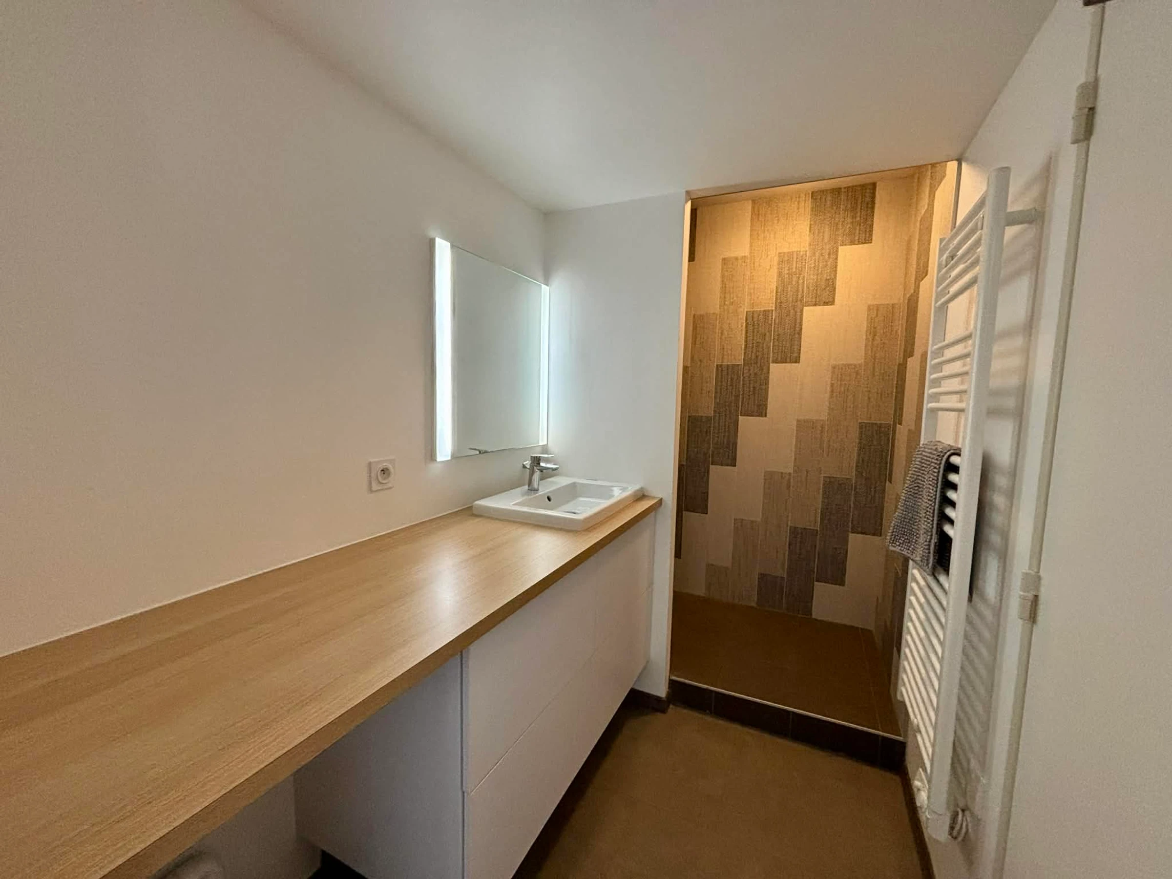 Bathroom with walk-in shower, vanity unit, towel warmer,