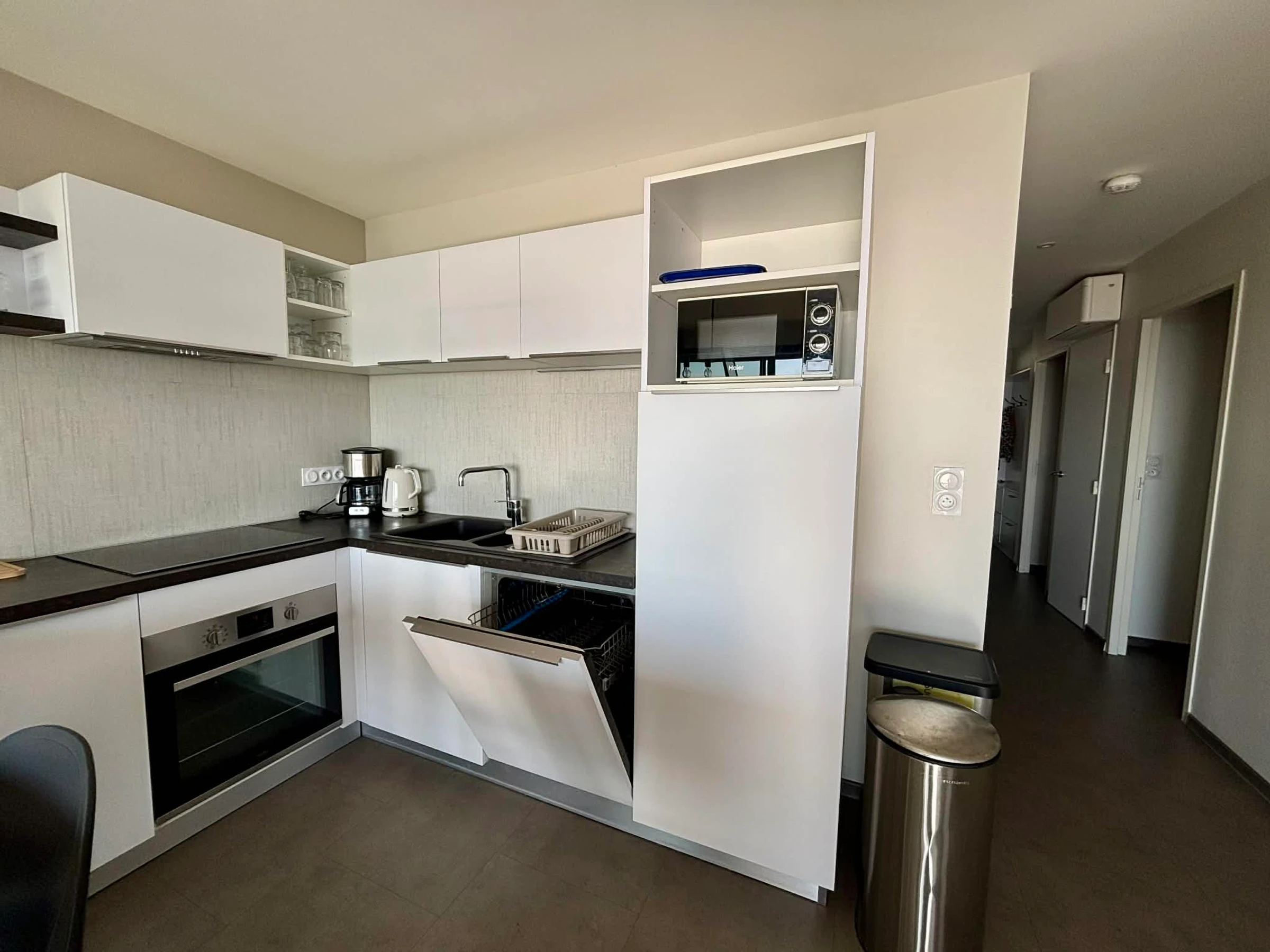 Open-plan fitted kitchen (multifunction microwave, refrigerator/freezer, induction hob, filter coffee maker, toaster, kettle),