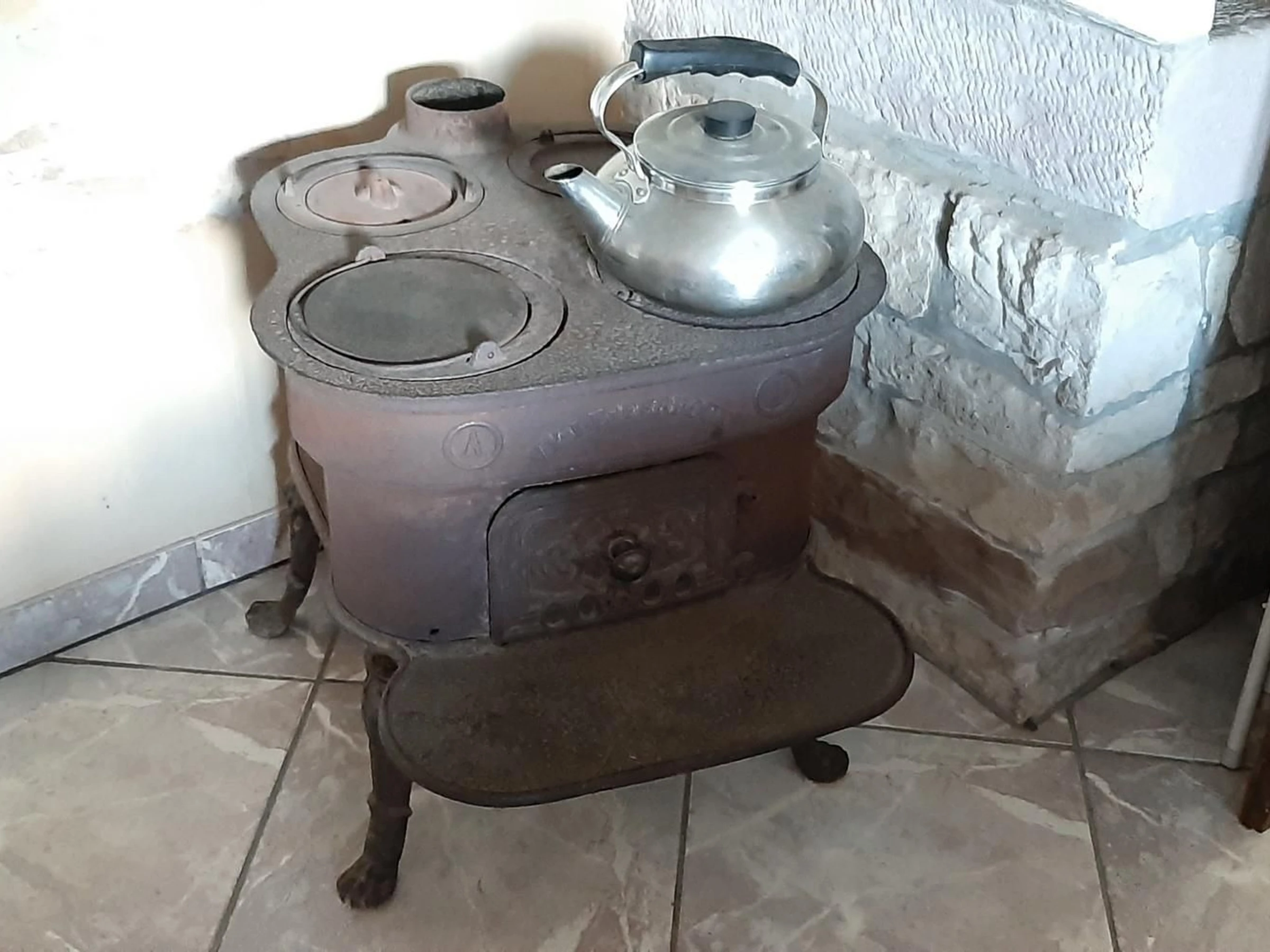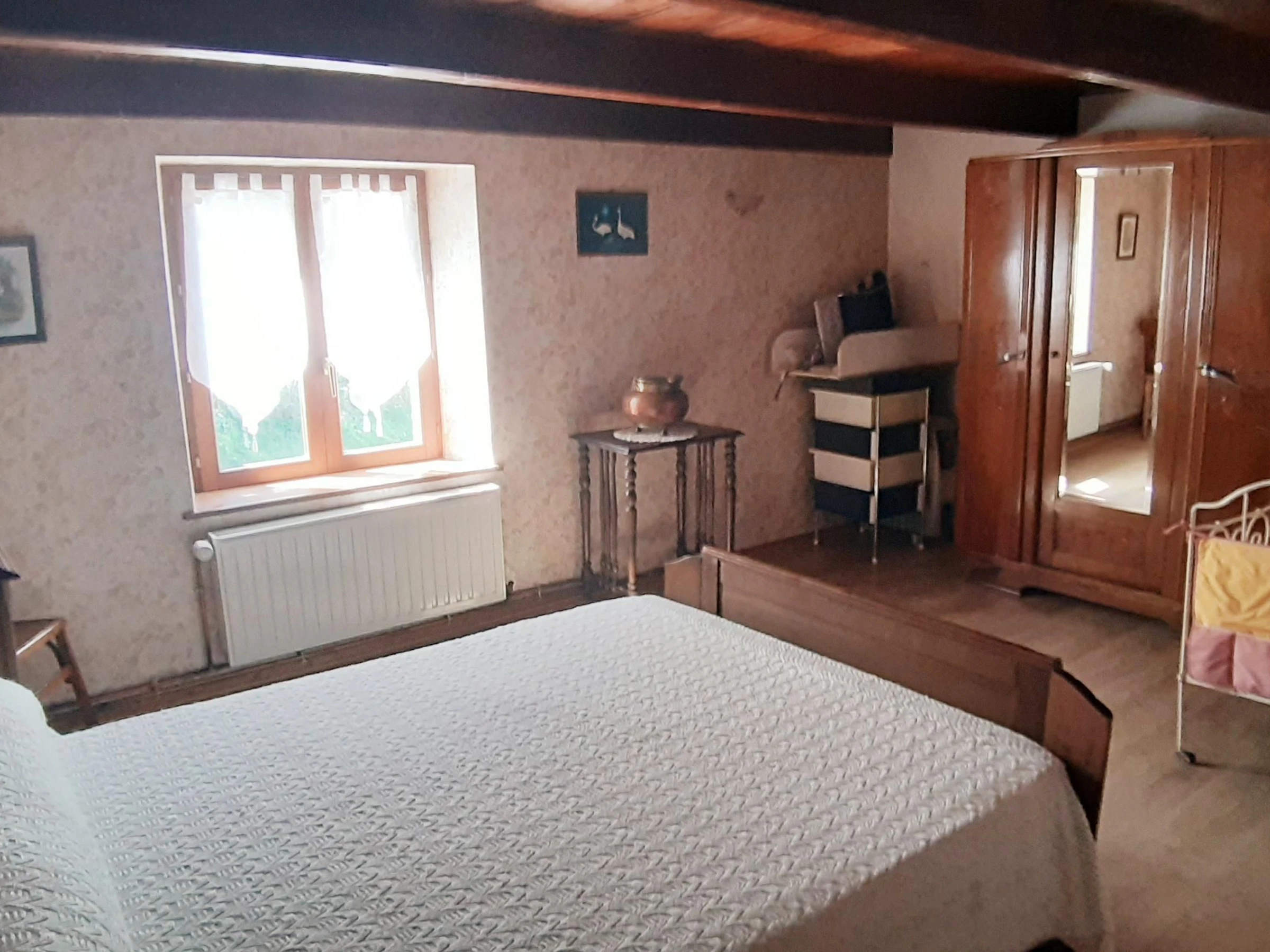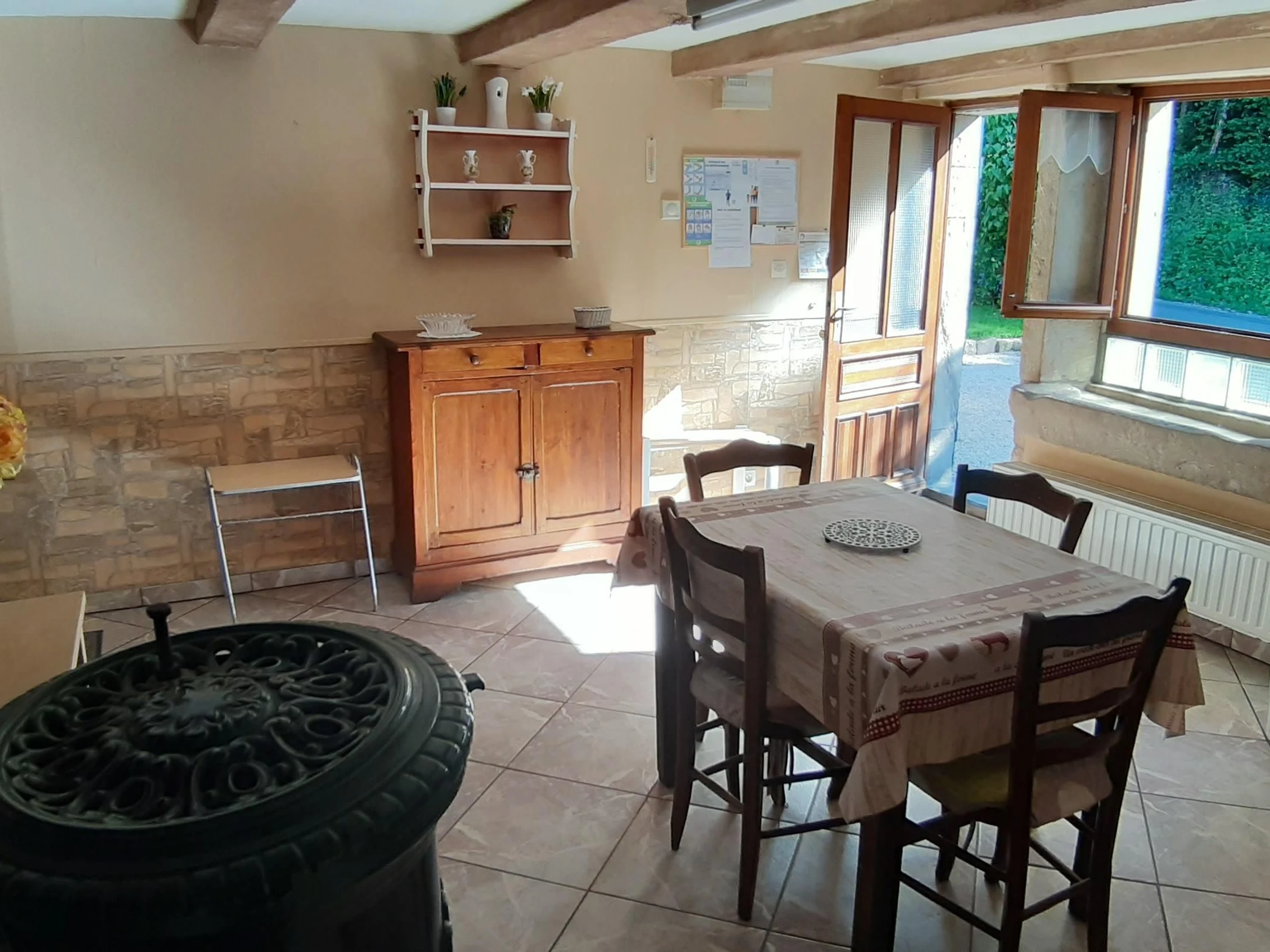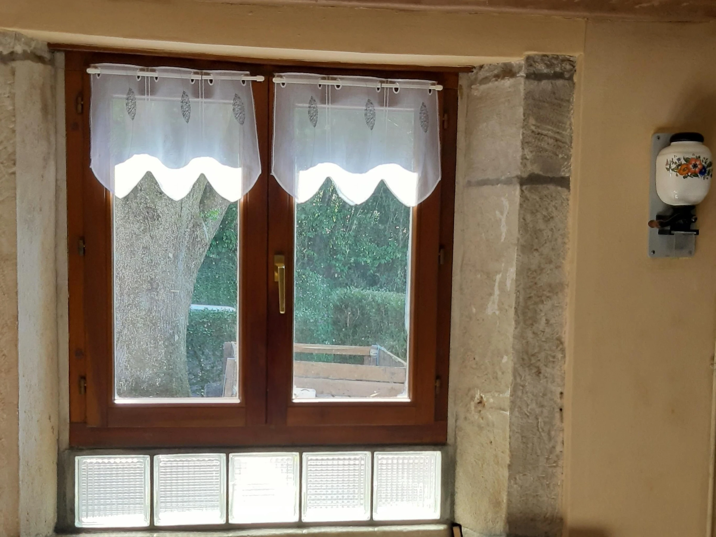 Ground floor: kitchen with sink and Vosges sandstone fireplace, freezer, and microwave. Living room with wood-burning stove, spacious bathroom, separate toilet.