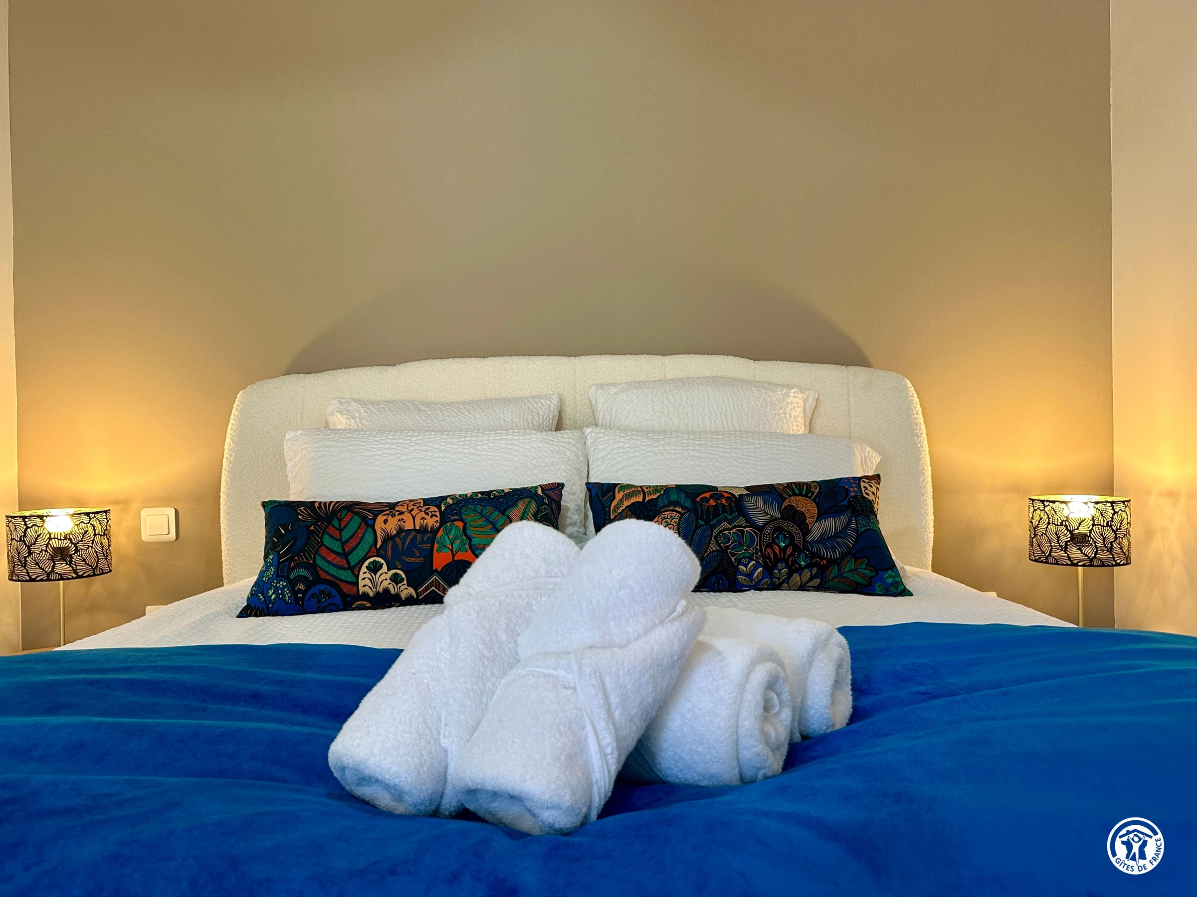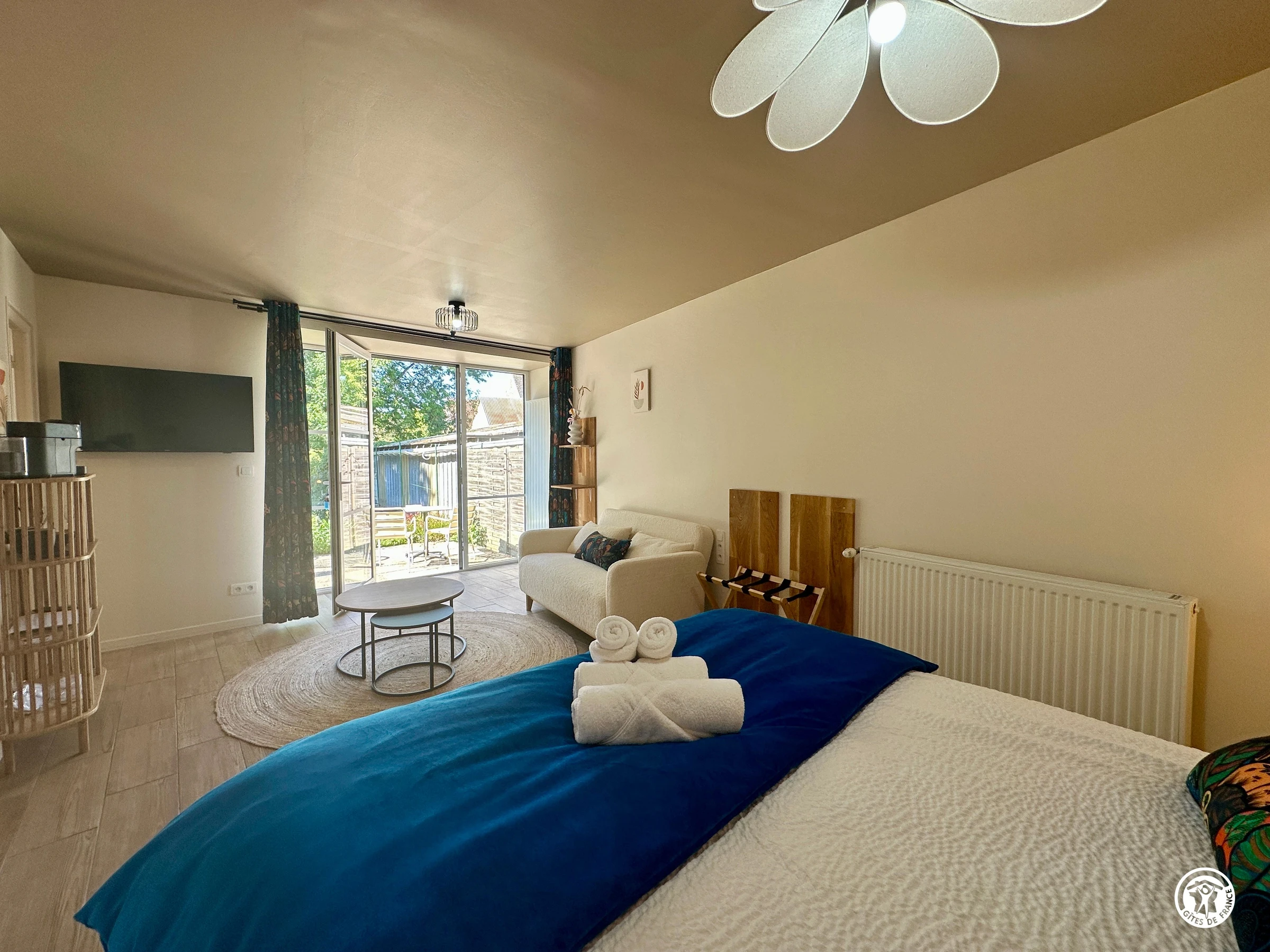 Double room with private entrance, located on the ground floor. The room features a 160x200cm bed, an en-suite bathroom, and a separate toilet.