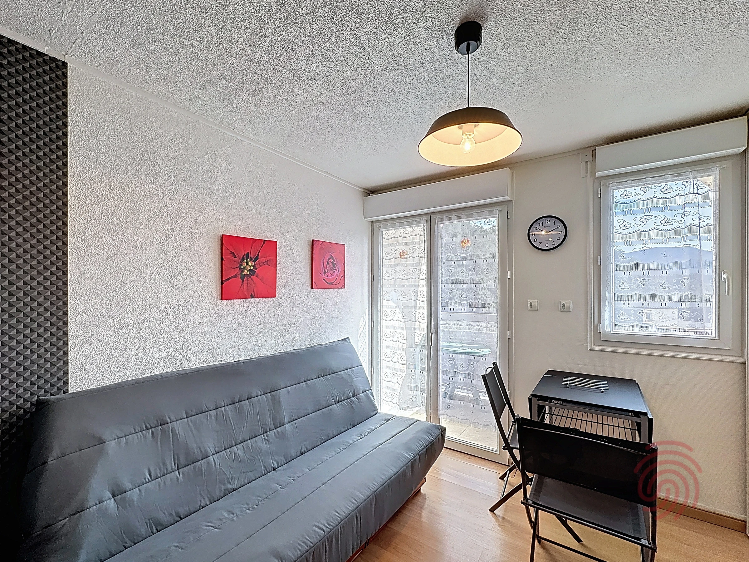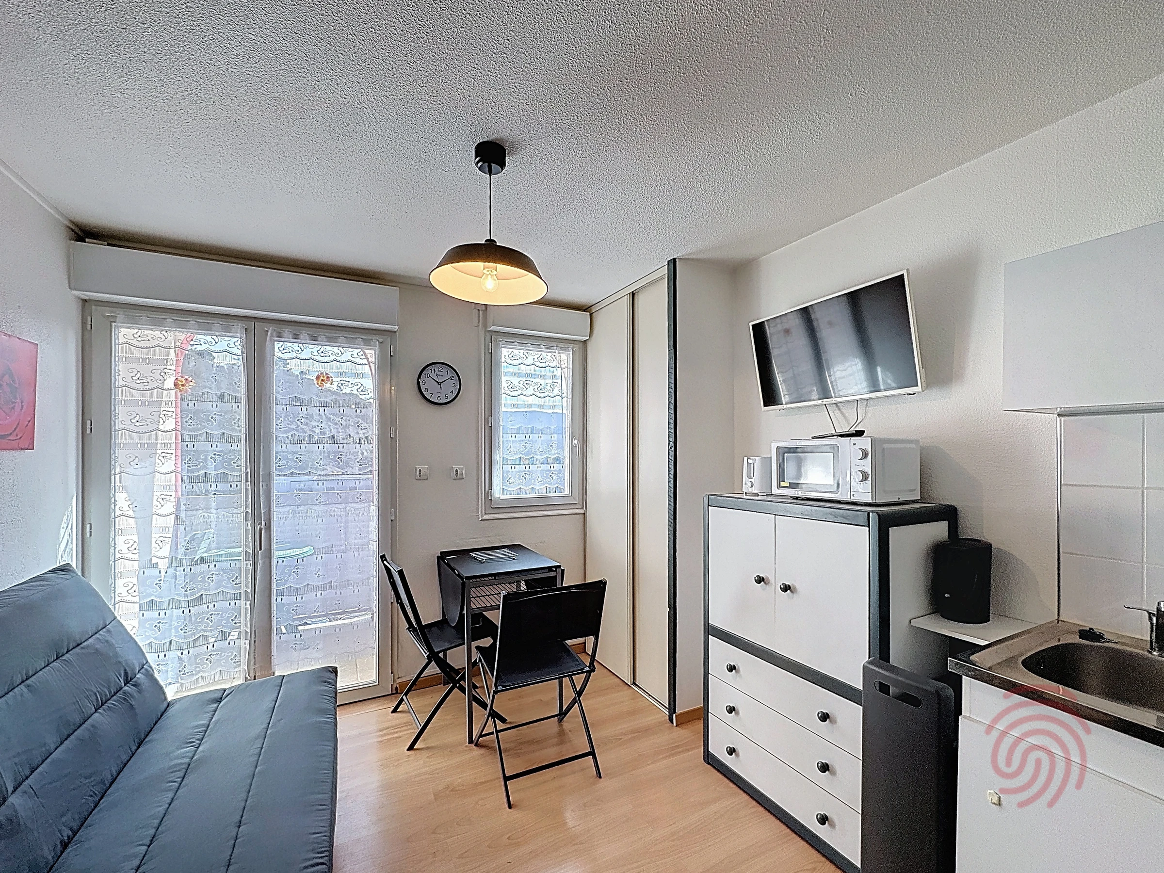 This 17 m² studio apartment is located on the 3rd floor (accessible by elevator and eight steps). It overlooks the residence's parking lot and faces south. It is 400 meters from the center of Lamalou-les-Bains and 650 meters from the thermal baths. The studio features a kitchenette with a microwave, oven, two-burner induction cooktop, and small refrigerator. The kitchenette opens onto the main room, which includes a double sofa bed (140 cm), a flat-screen TV, and a single bed (80 cm) at the entrance. Wi-Fi is available. There is a bathroom with a shower, sink, and toilet. A balcony with a table and chairs completes the space. Rated 2 stars in 2025. A laundromat is located within the residence. Free municipal parking is available nearby. Pets are not allowed. A travel cot for a baby can be provided upon request, subject to availability.