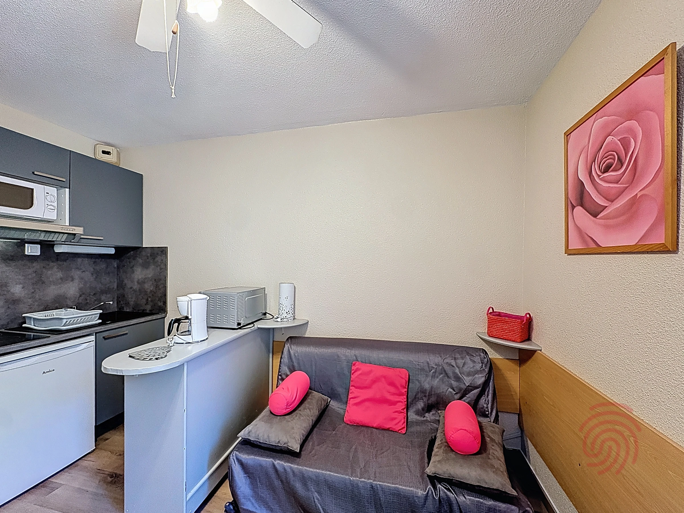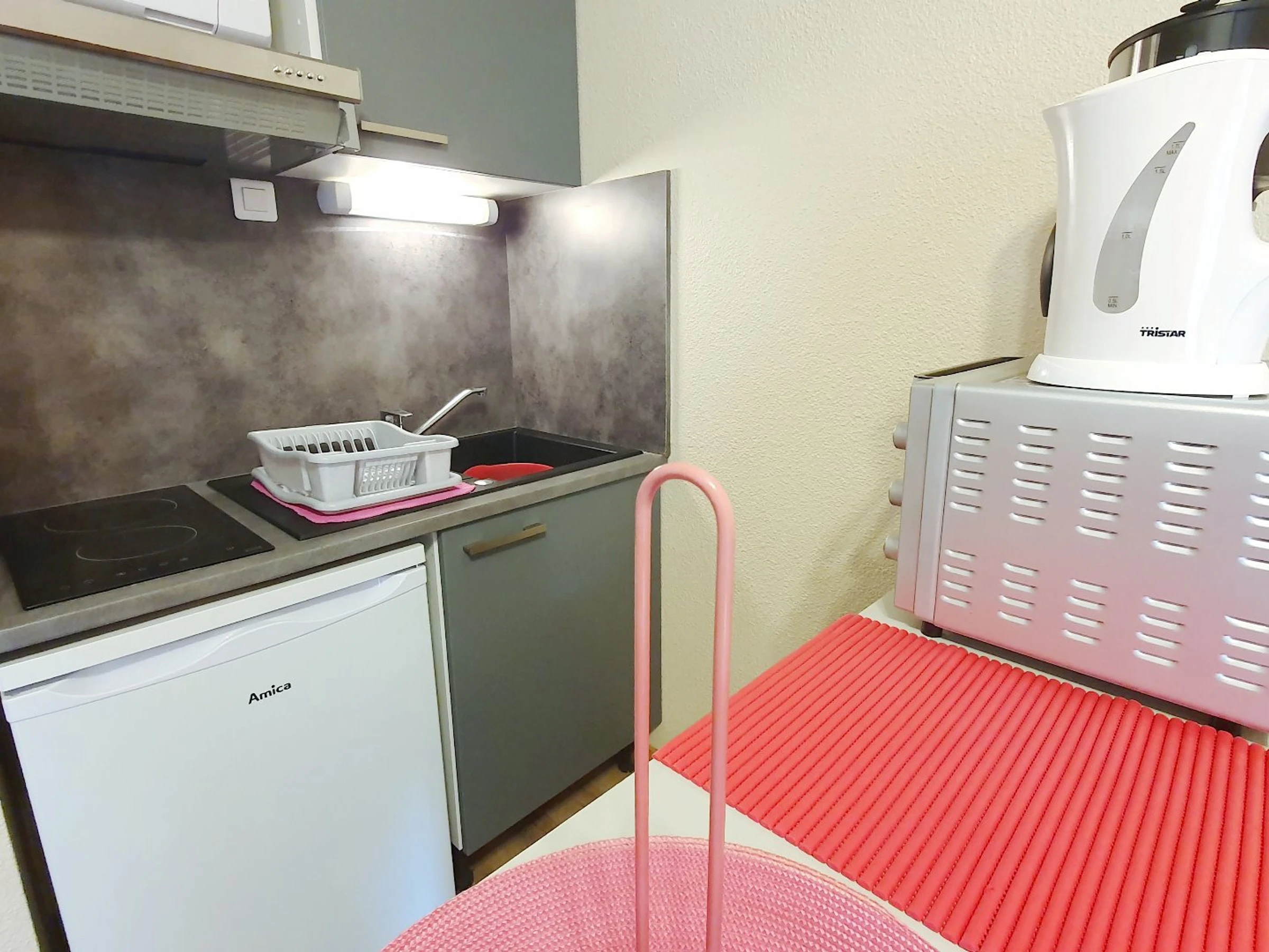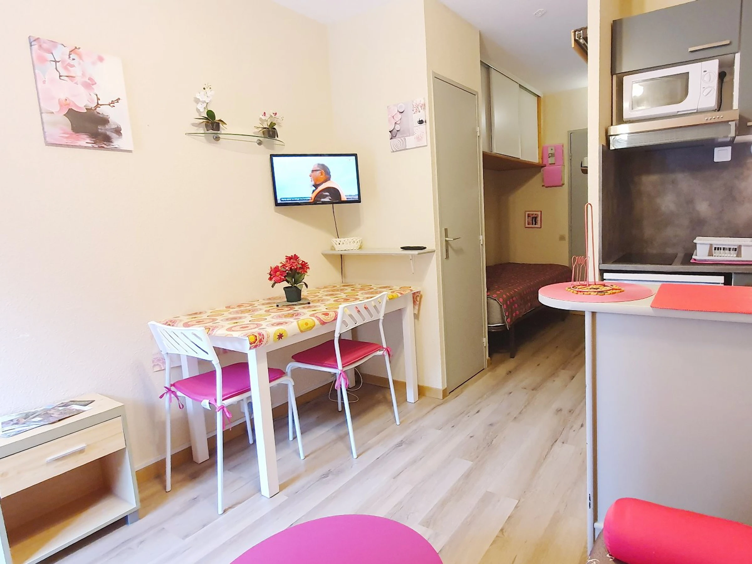 17sqm studio, located on the 3rd floor. Kitchenette with electric hob, oven, refrigerator top, microwave ... open to the main room which includes table, chairs, flat screen TV, sofa bed 2 places and a bed in 90 in the entrance.