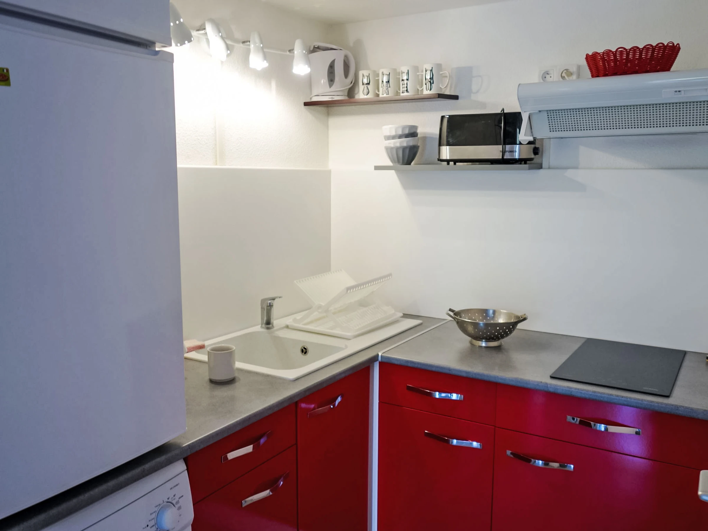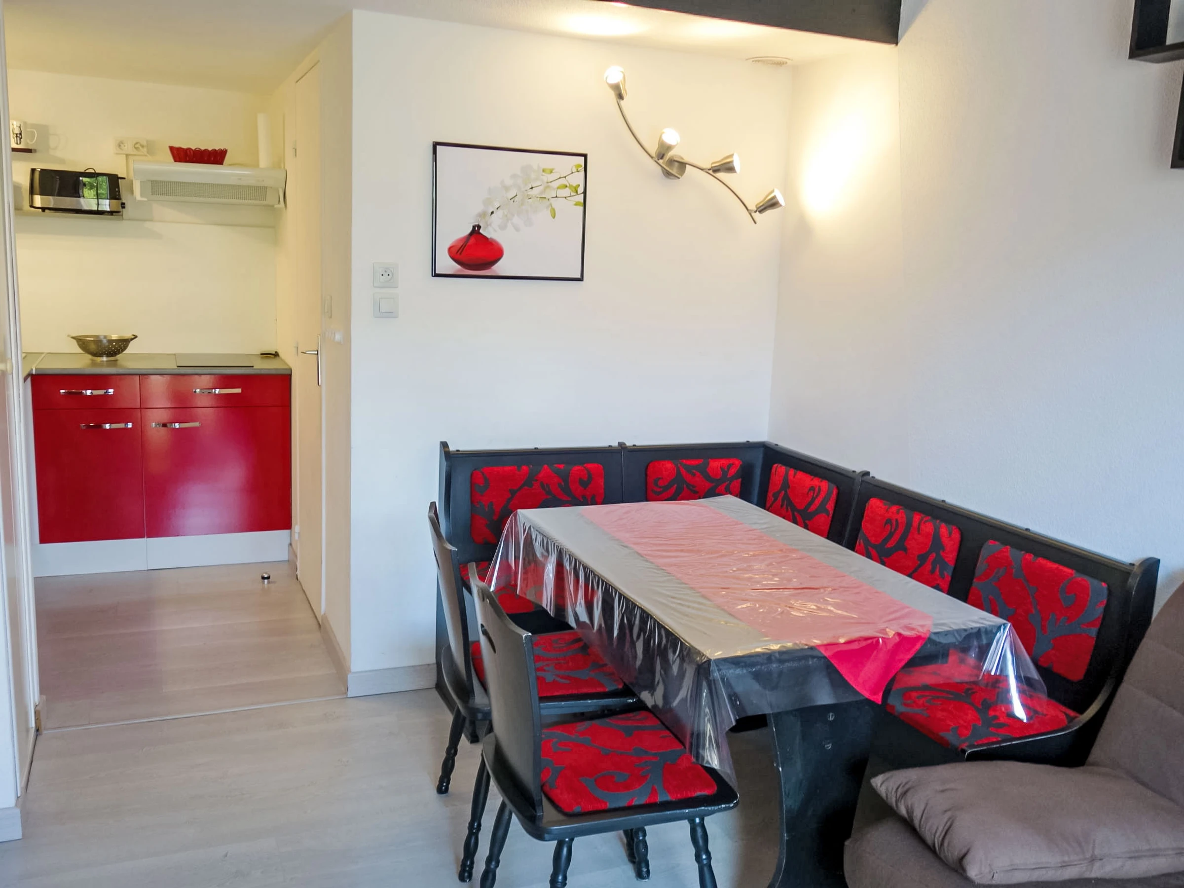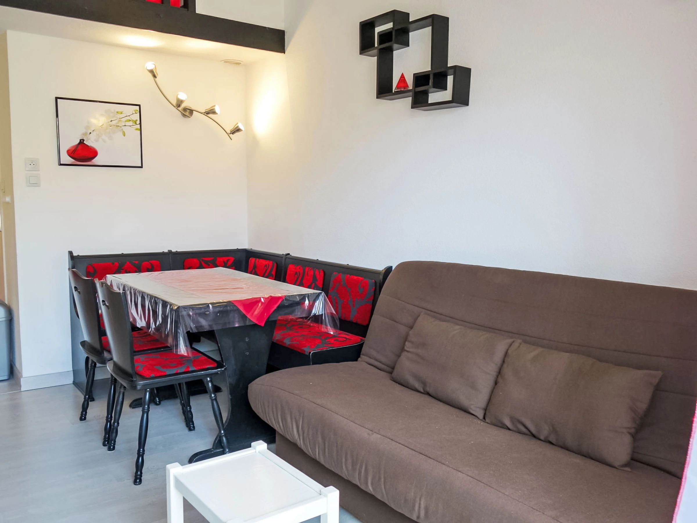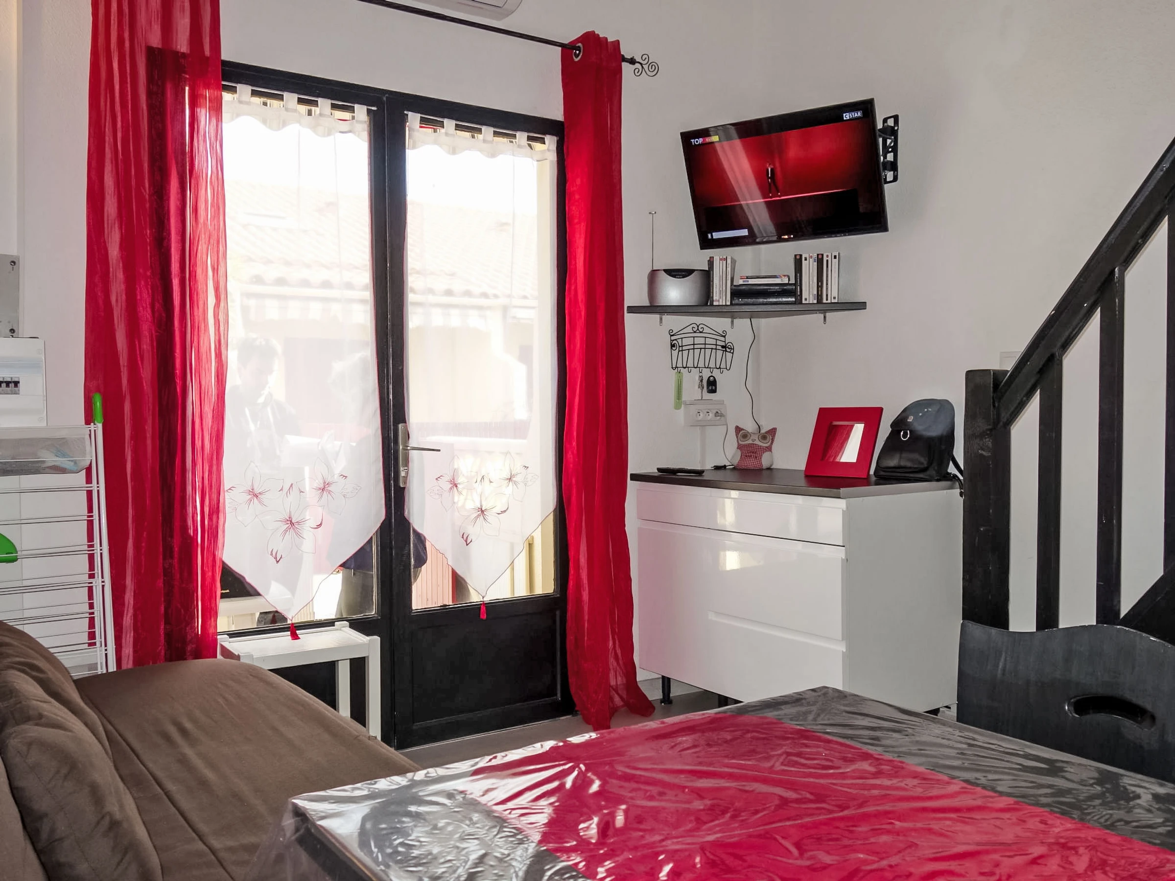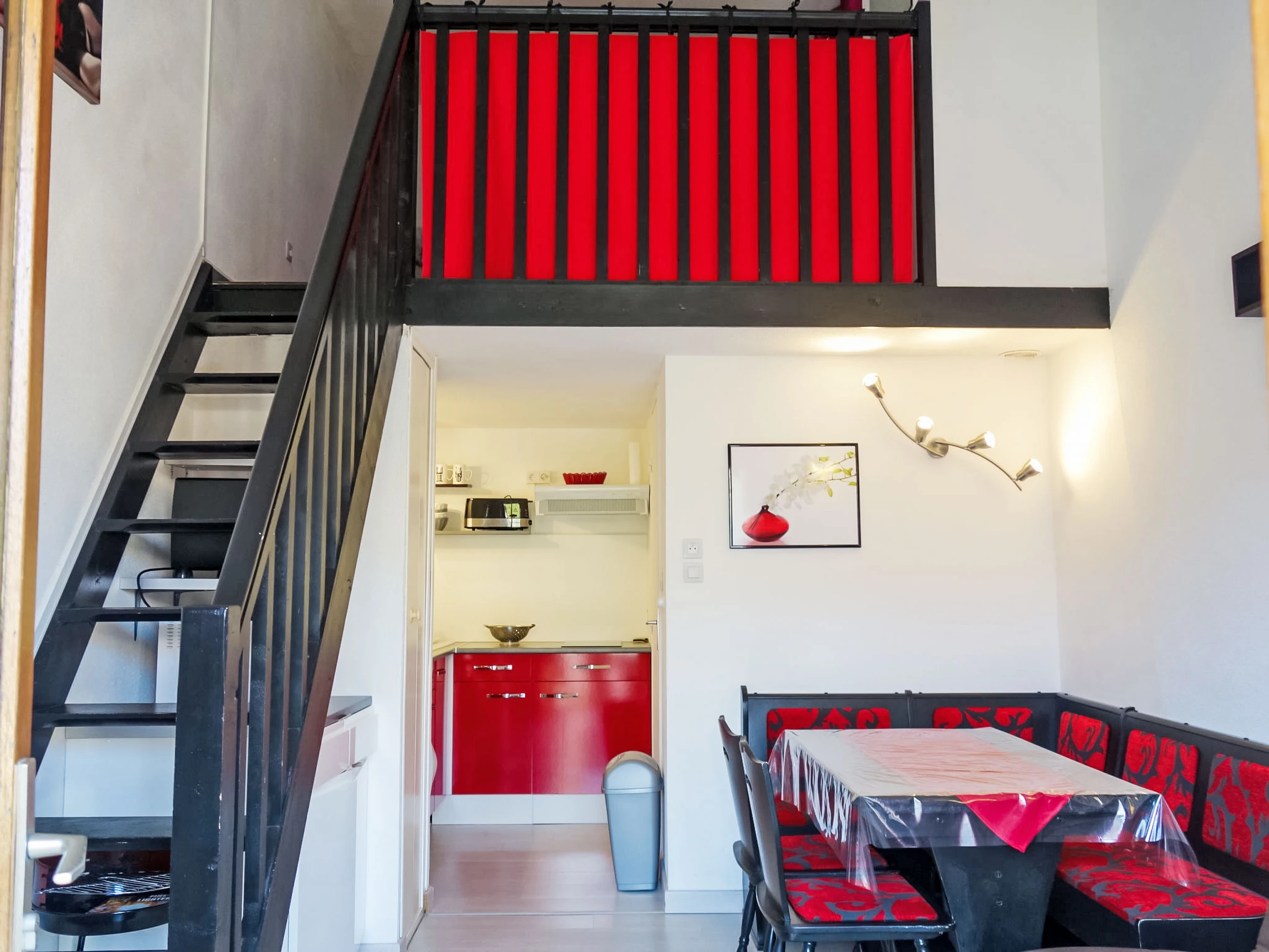 1-room studio 22 m2 on 2 levels. Living/dining room with 1 double sofabed (1 x 140 cm, length 190 cm), TV. Exit to the terrace. Open kitchen (mini-oven, 2 ceramic glass hob hotplates, toaster, kettle, microwave, electric coffee machine). Shower, sep. WC. Forced-air heating. Upper floor: open gallery with 1 french bed (1 x 140 cm, length 190 cm). Air-conditioning. Terrace 15 m2. Terrace furniture. Facilities: washing machine. Internet (WiFi, extra). Parking. Please note: non-smokers only. Smoke alarm.