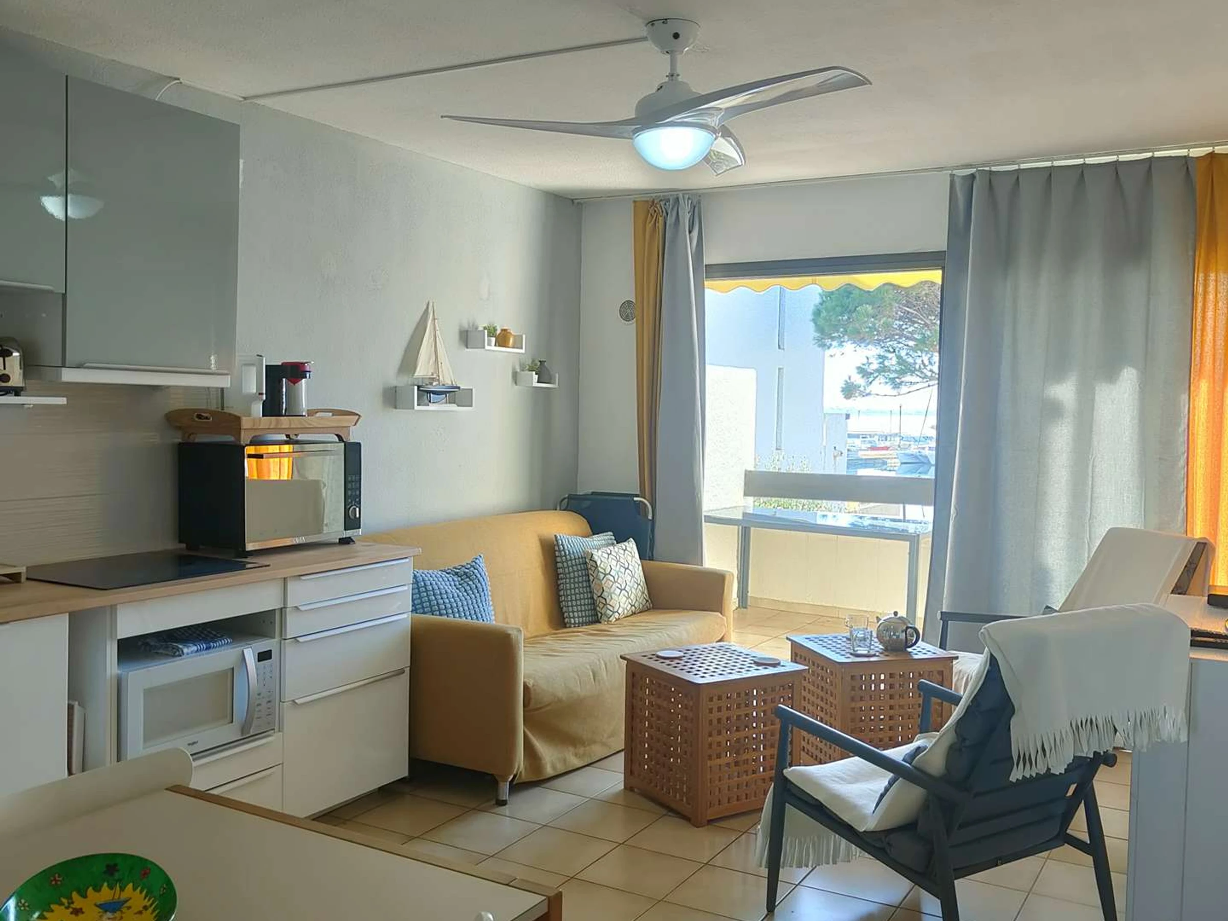 The apartment features a balcony overlooking the Cap Coudalère marina.