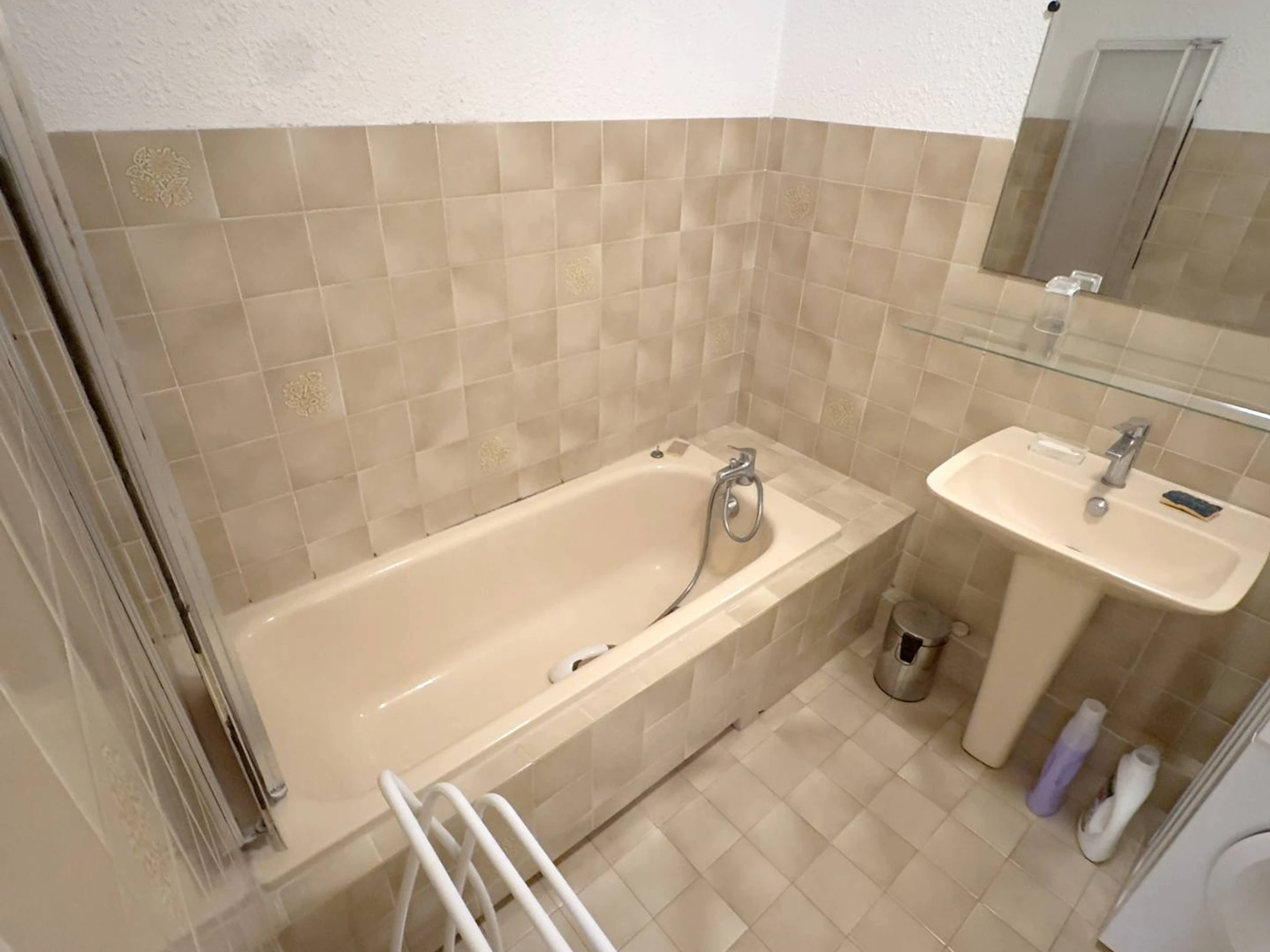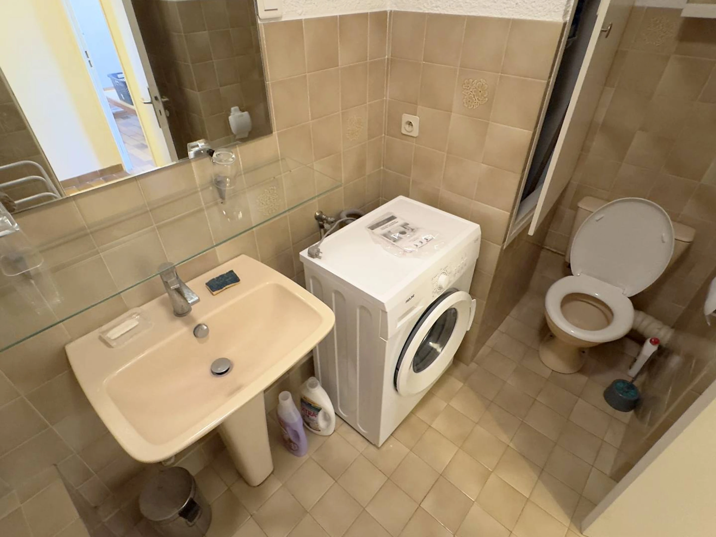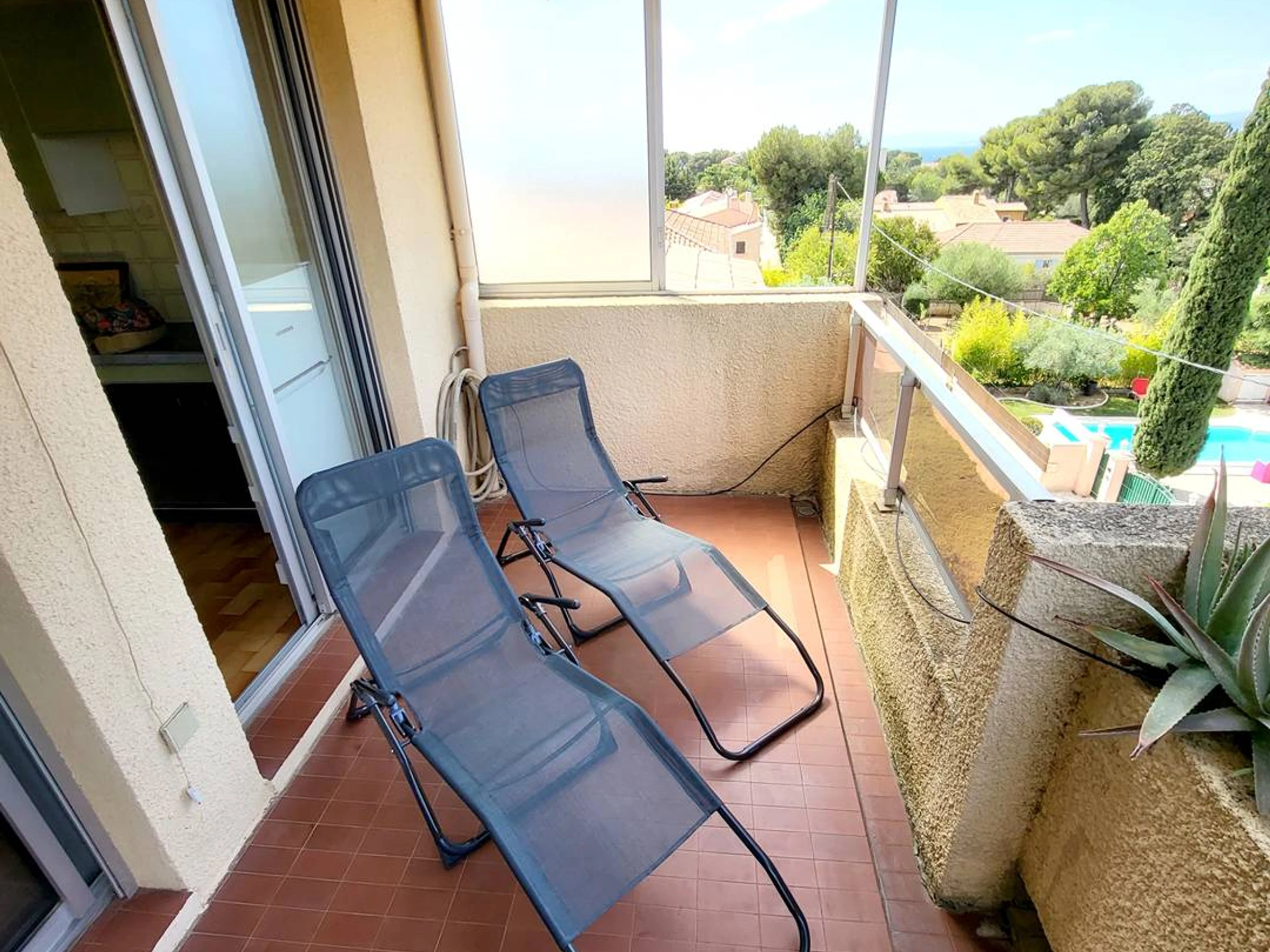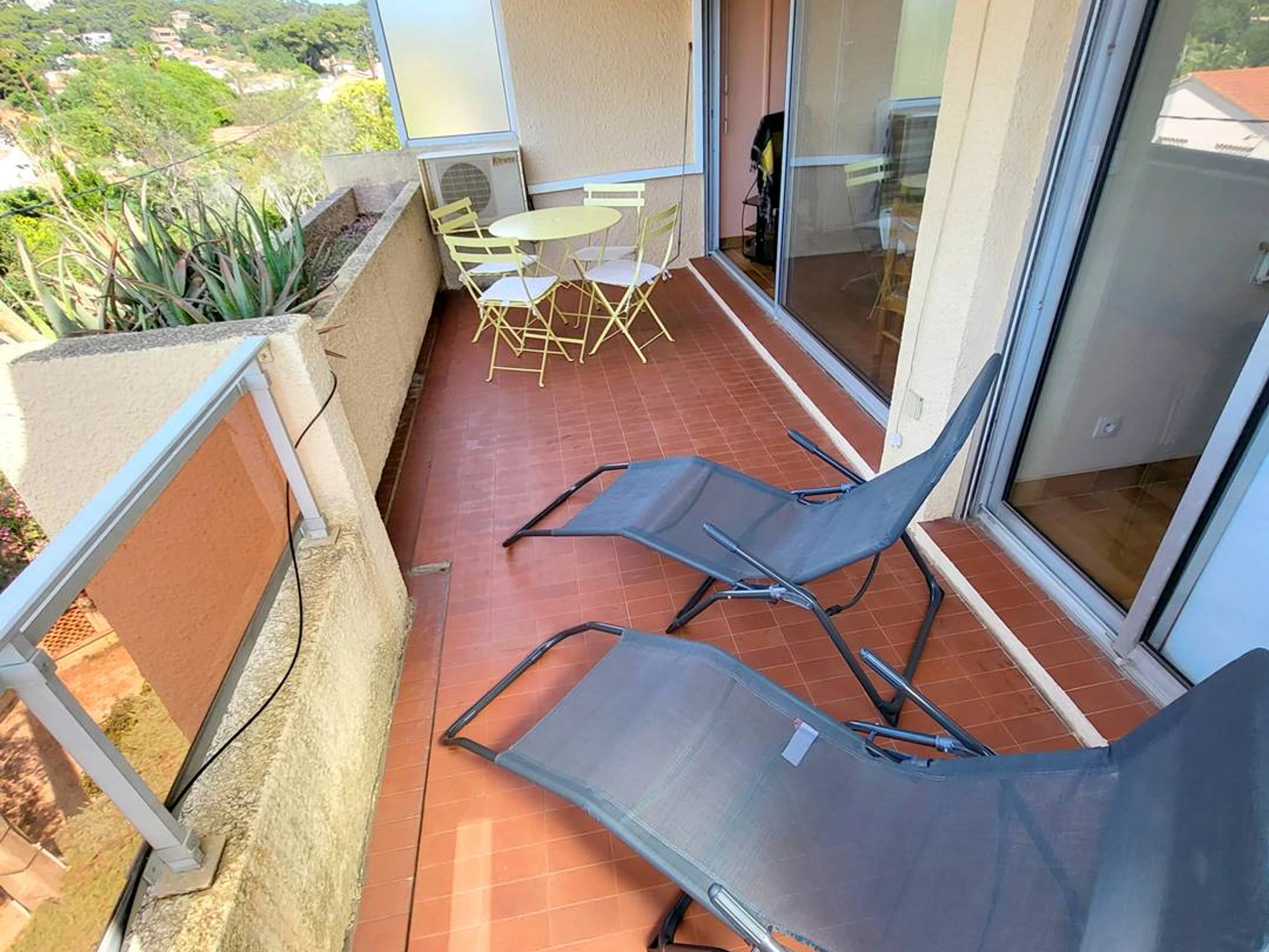 Loggia (15 m²) offering a small side sea view with awning, 2 deckchairs, garden table and chairs - Equipped kitchen (4-burner ceramic hob - fridge / freezer - oven - microwave - dishwasher - electric filter coffee maker - kettle - toaster - iron and ironing board - vacuum cleaner) - Air-conditioned main room with 1 double sofa bed (140), 1 single extra bed for a child (80) and television - Bathroom with bathtub, washing machine and integrated toilet.