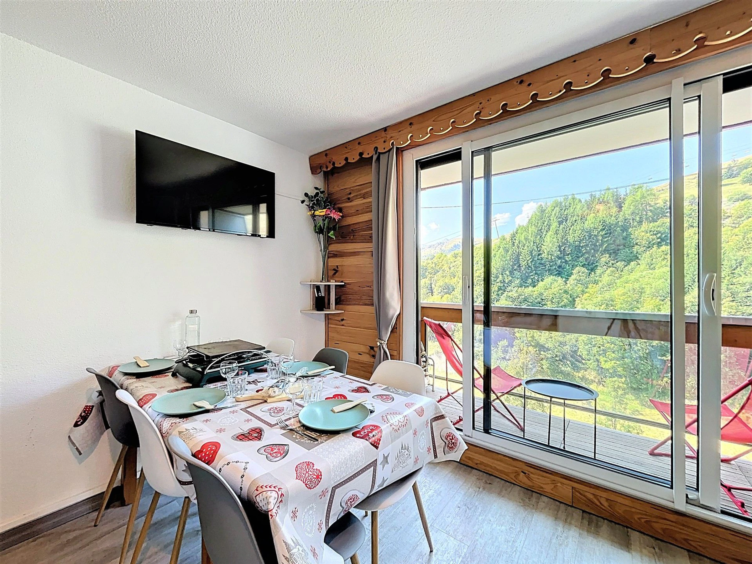 The bright living area is well laid out, with a 130x190 cm sofa bed and a flat-screen TV. It opens onto a balcony with slope view and 2 deckchairs to enjoy the scenery.